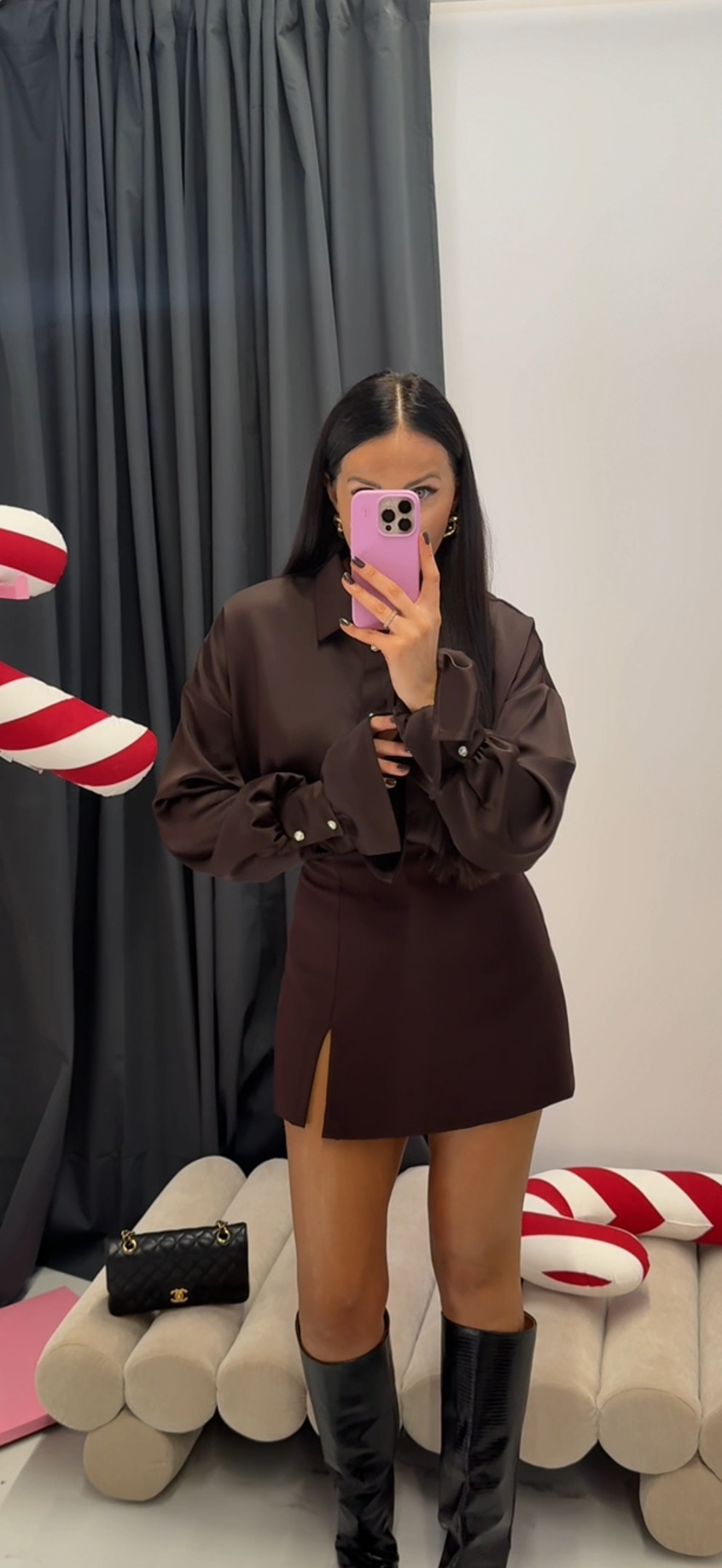 Trzyczęściowy komplet top, bluza i spodnie w kolorze czekoladowego brązu
