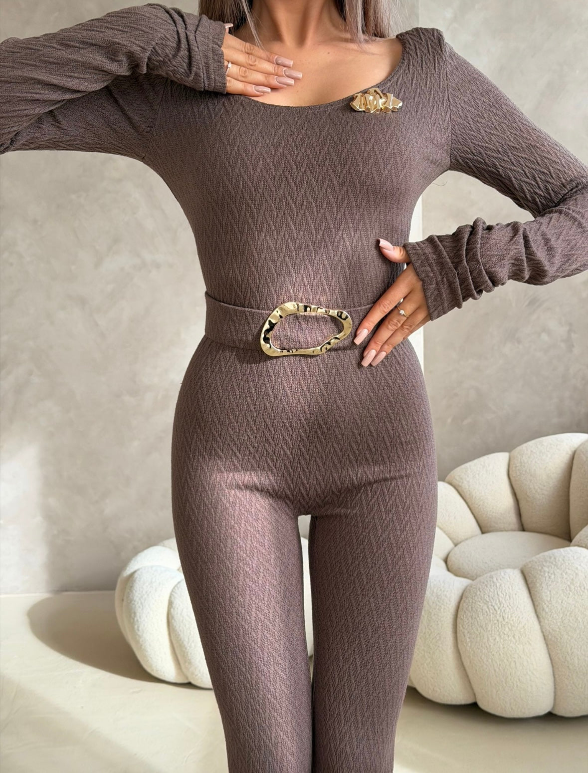Beżowy damski komplet zamszowy – body z wiązaniem i spodnie dzwony