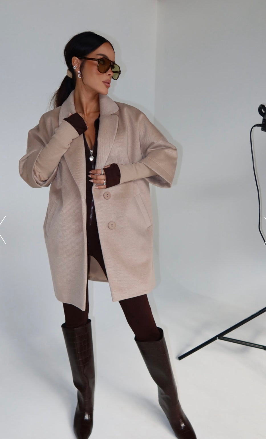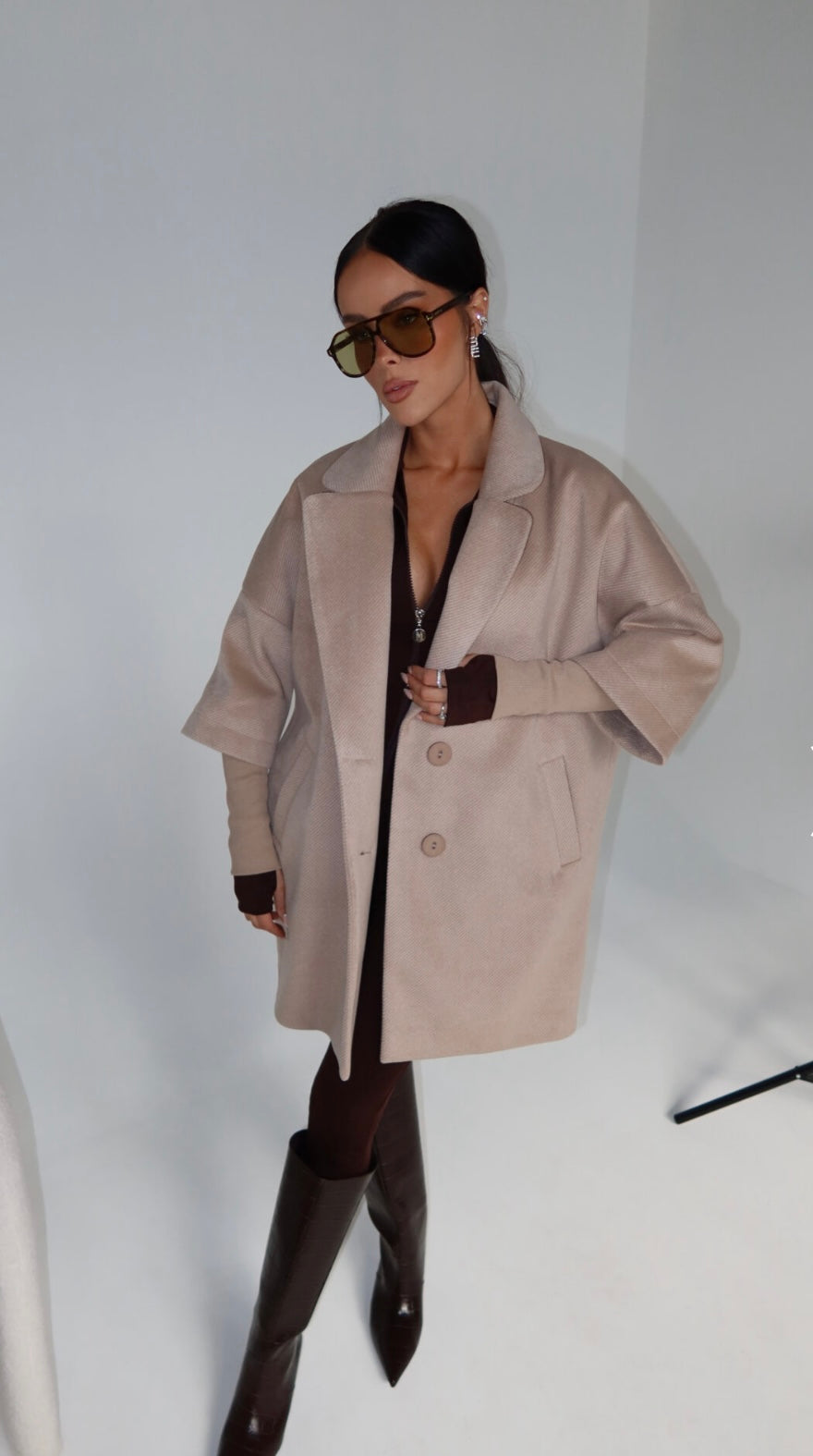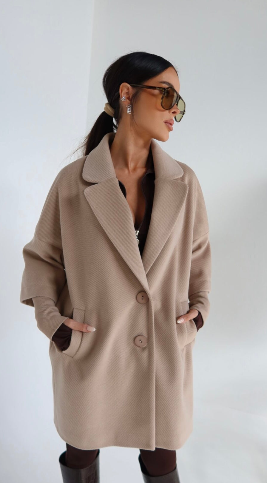 Stylowy płaszcz w ciepłym beżu o kroju oversize to idealne rozwiązanie elegancji i odzieży. Wykonanie z miękkiego, przyjemnego w dotyku materiału z domieszką podstawową, zapewnia komfort termiczny i świetnie układa się na sylwetce. Model posiada szerokie klapy, niższe częstotliwości oraz duże przyciski w dopasowanym kolorze, co nadaje mu modny, minimalistyczny charakter.