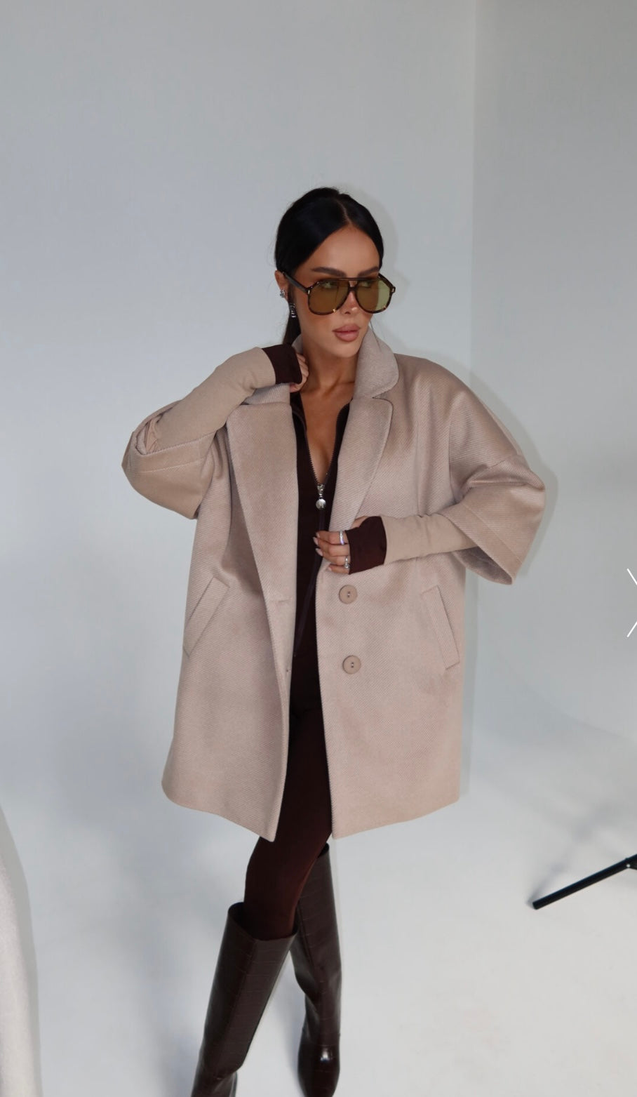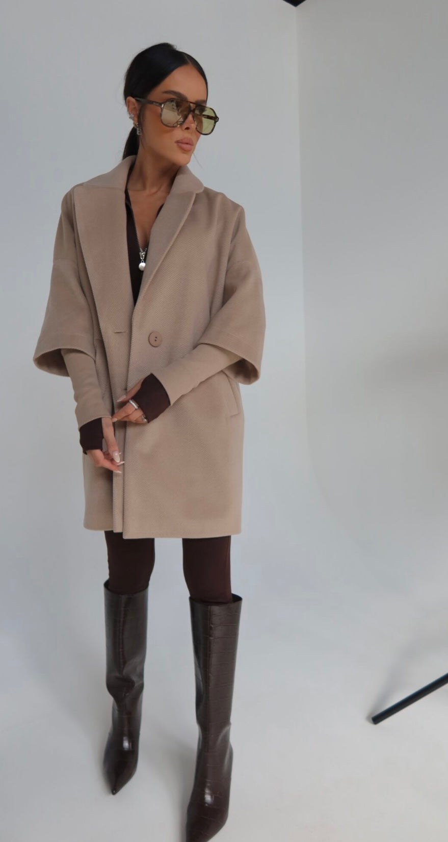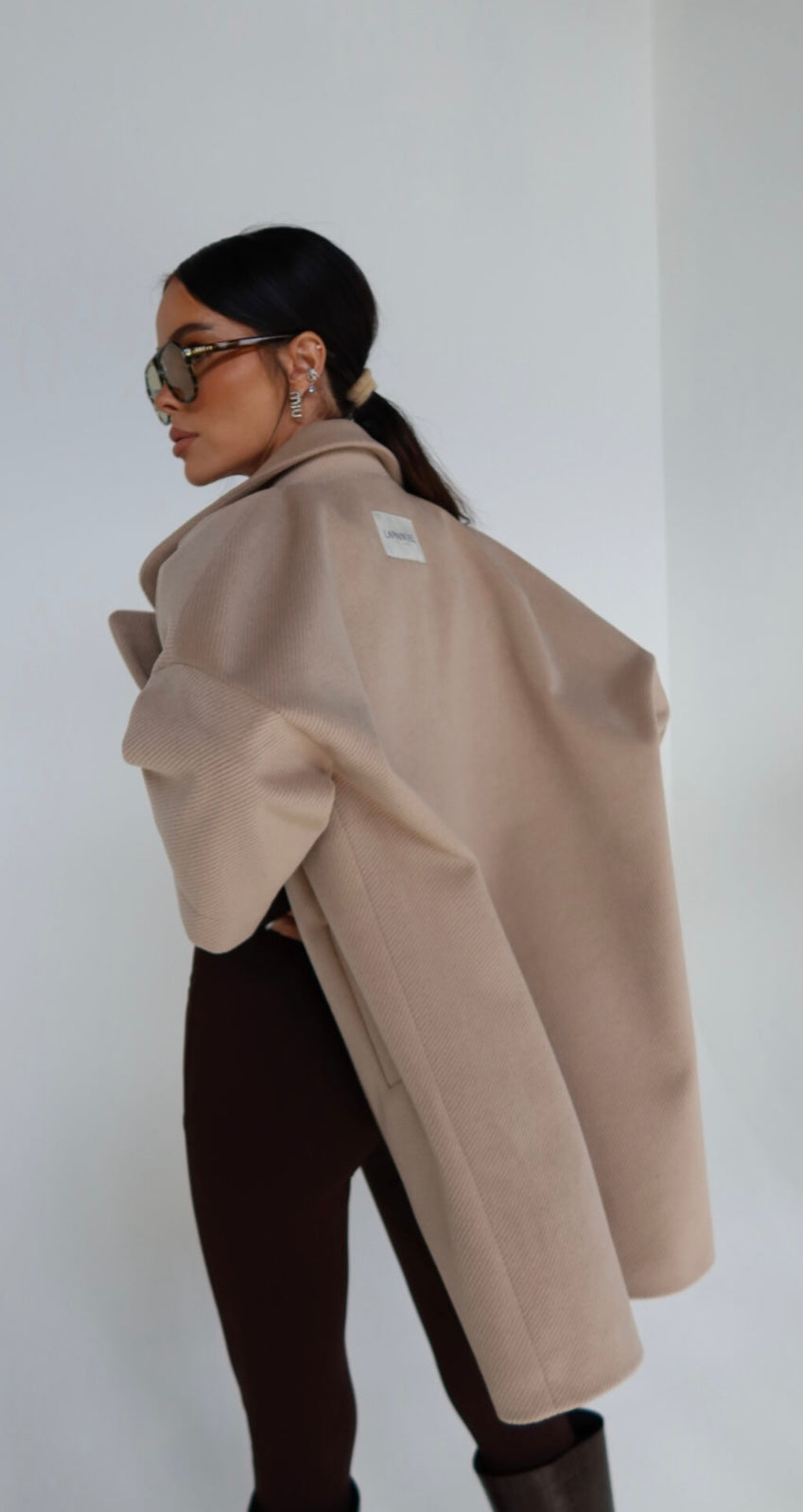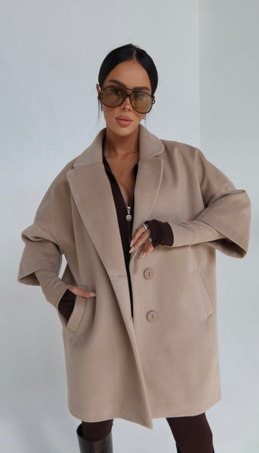 Stylowy płaszcz w ciepłym beżu o kroju oversize to idealne rozwiązanie elegancji i odzieży. Wykonanie z miękkiego, przyjemnego w dotyku materiału z domieszką podstawową, zapewnia komfort termiczny i świetnie układa się na sylwetce. Model posiada szerokie klapy, niższe częstotliwości oraz duże przyciski w dopasowanym kolorze, co nadaje mu modny, minimalistyczny charakter.