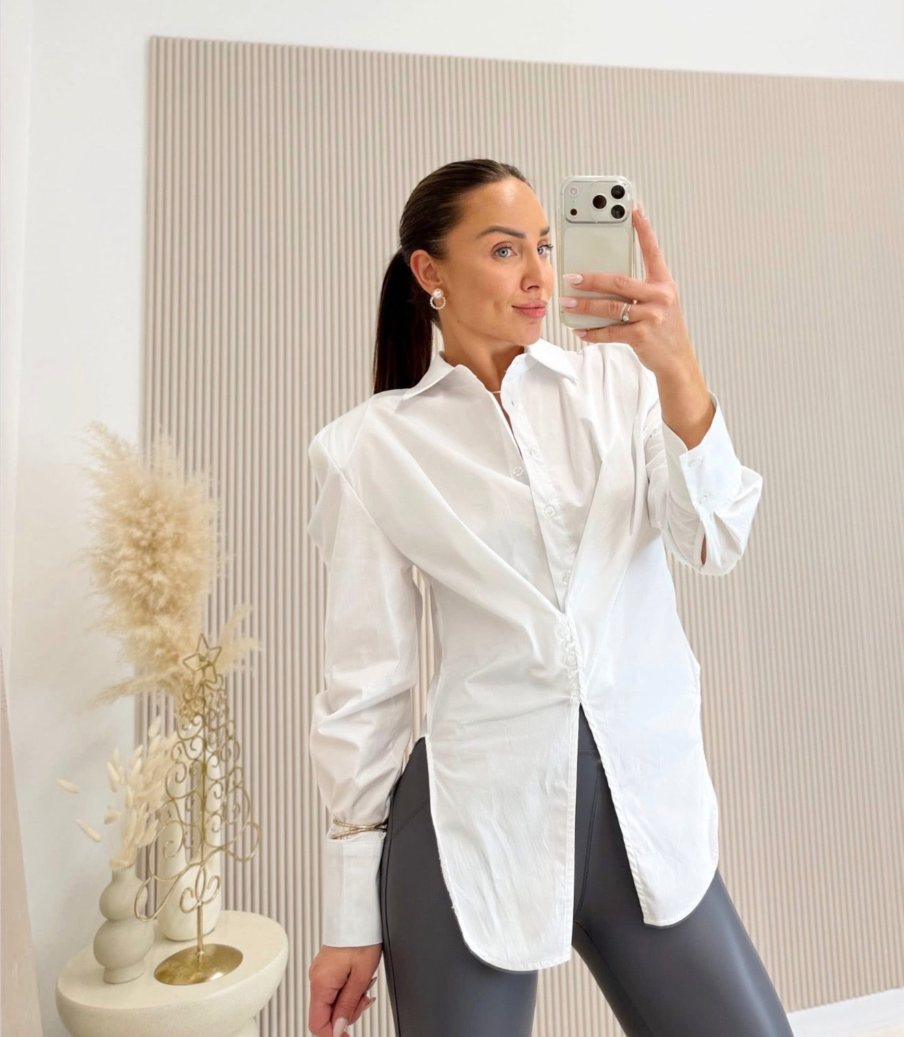 Elegancja w nowoczesnym wydaniu. Ta biała koszula została wykonana tak, aby być klasyczną klasyką z subtelnym, designerskim twistem. Wydłużony następujący z charakterystycznym rozcięciem oraz delikatne podkreślenie talowych wartości kobiecą, a jednocześnie wynikających z większego komfortu użytkowego.