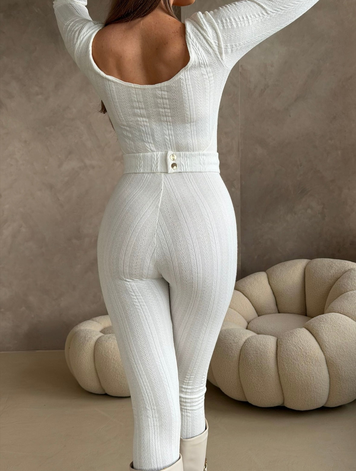 Podkreśl swoją sylwetkę i postaw na elegancję w nowoczesnym wydaniu dzięki temu wyjątkowemu kombinezonowi. Wykonany z miękkiej, elastycznej dzianiny o subtelnym prążkowanym wzorze, gwarantuje komfort noszenia i idealne dopasowanie do ciała.