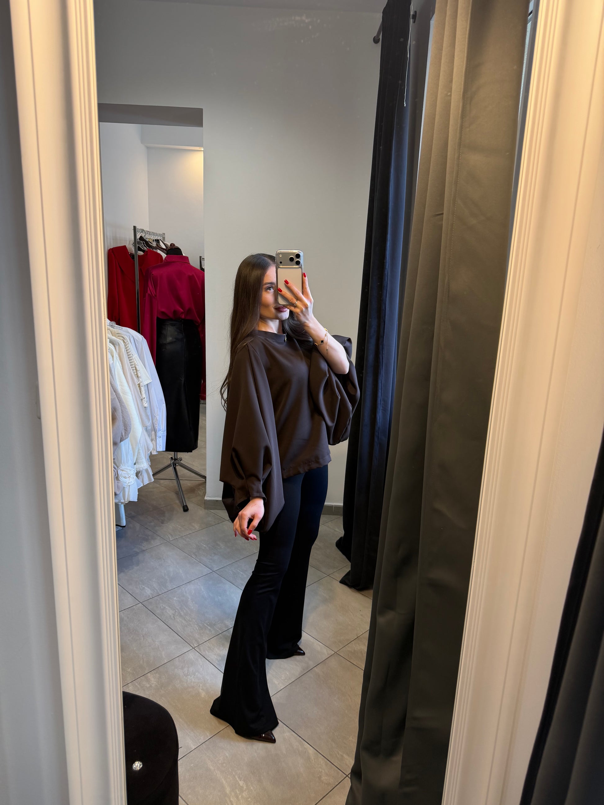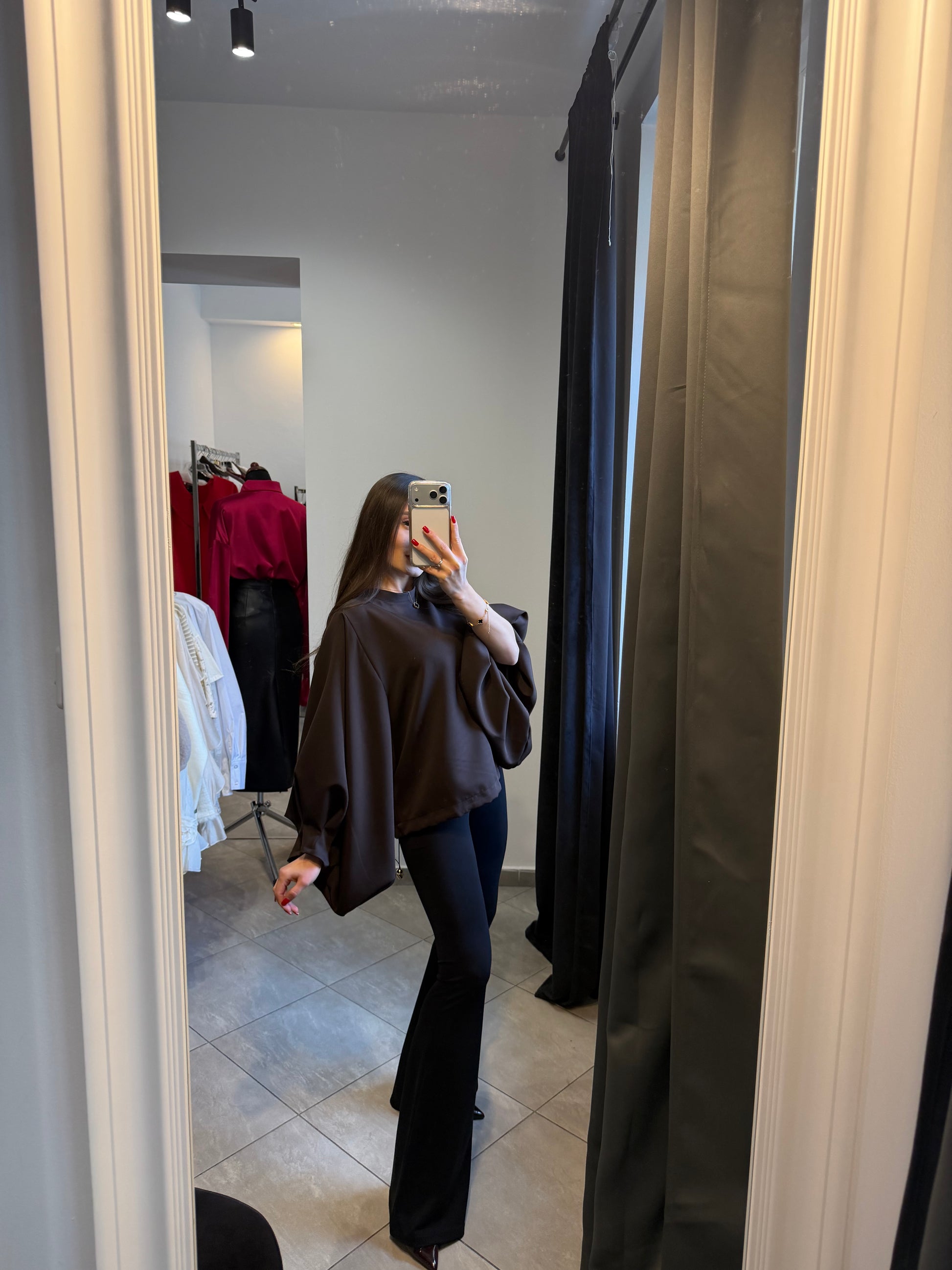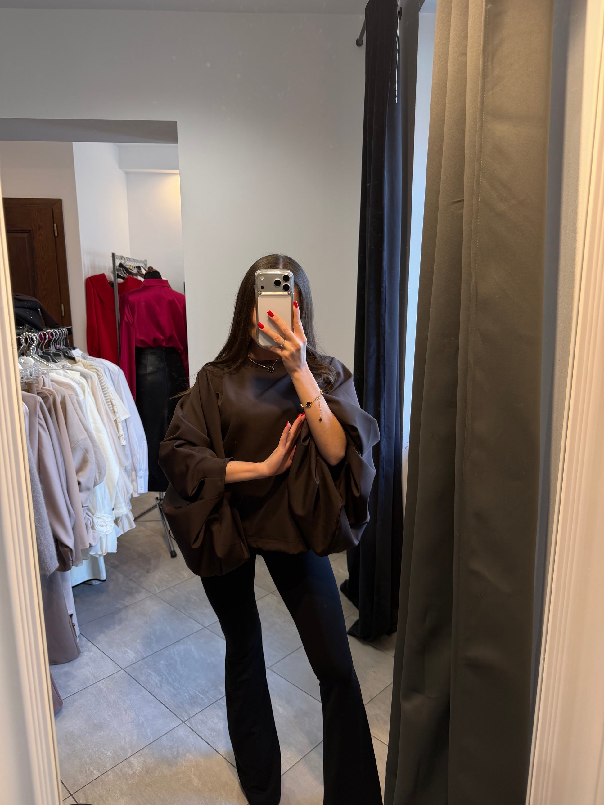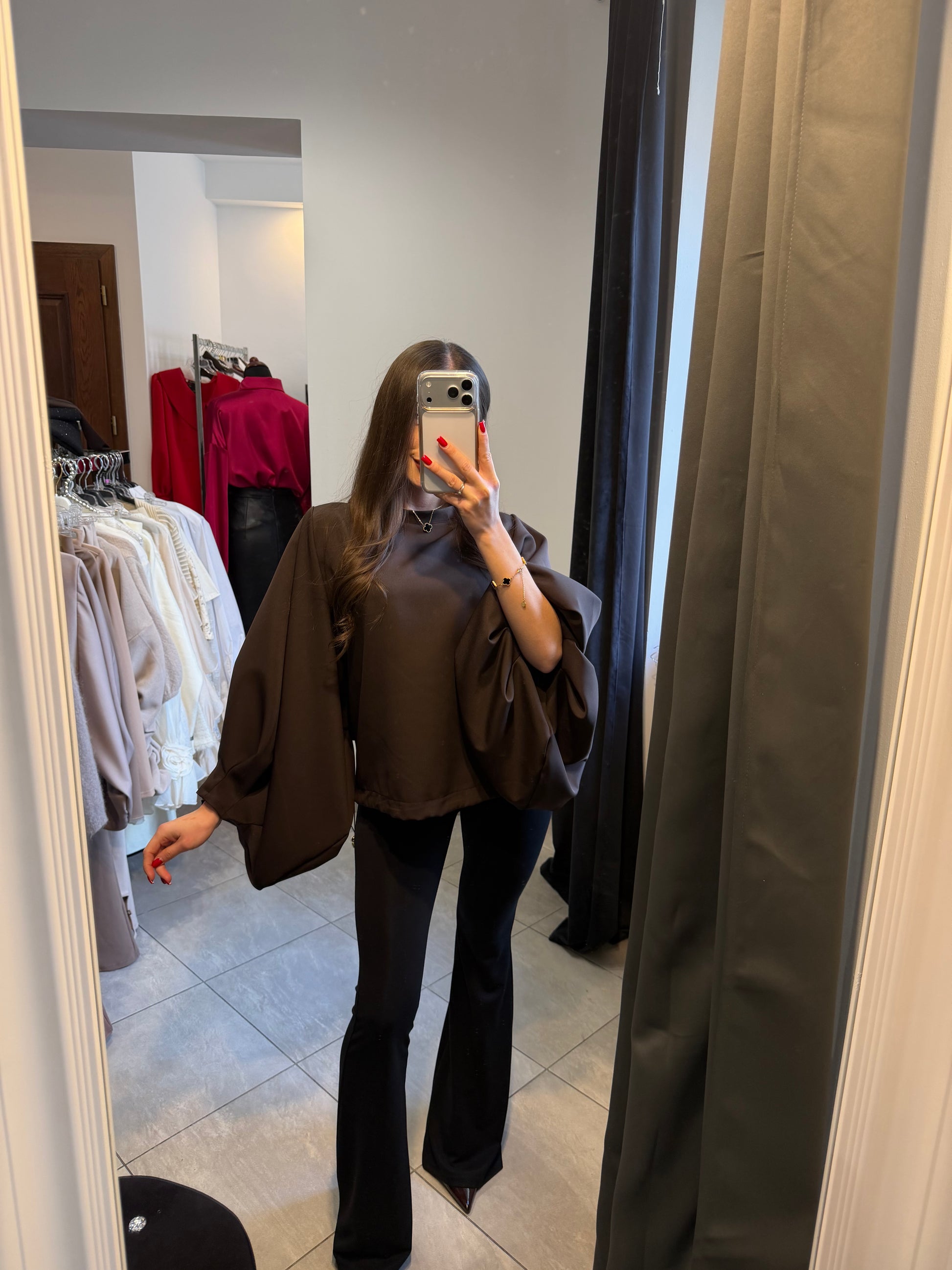 Bluzka posiada klasyczny, zabudowany dekolt oraz swobodny fason, który doskonale maskuje niedoskonałości i pasuje do różnych typów sylwetki. Kolor czekoladowego brązu jest niezwykle stylowy i łatwy do zestawienia zarówno z czernią, jak i beżami czy jasnymi odcieniami.