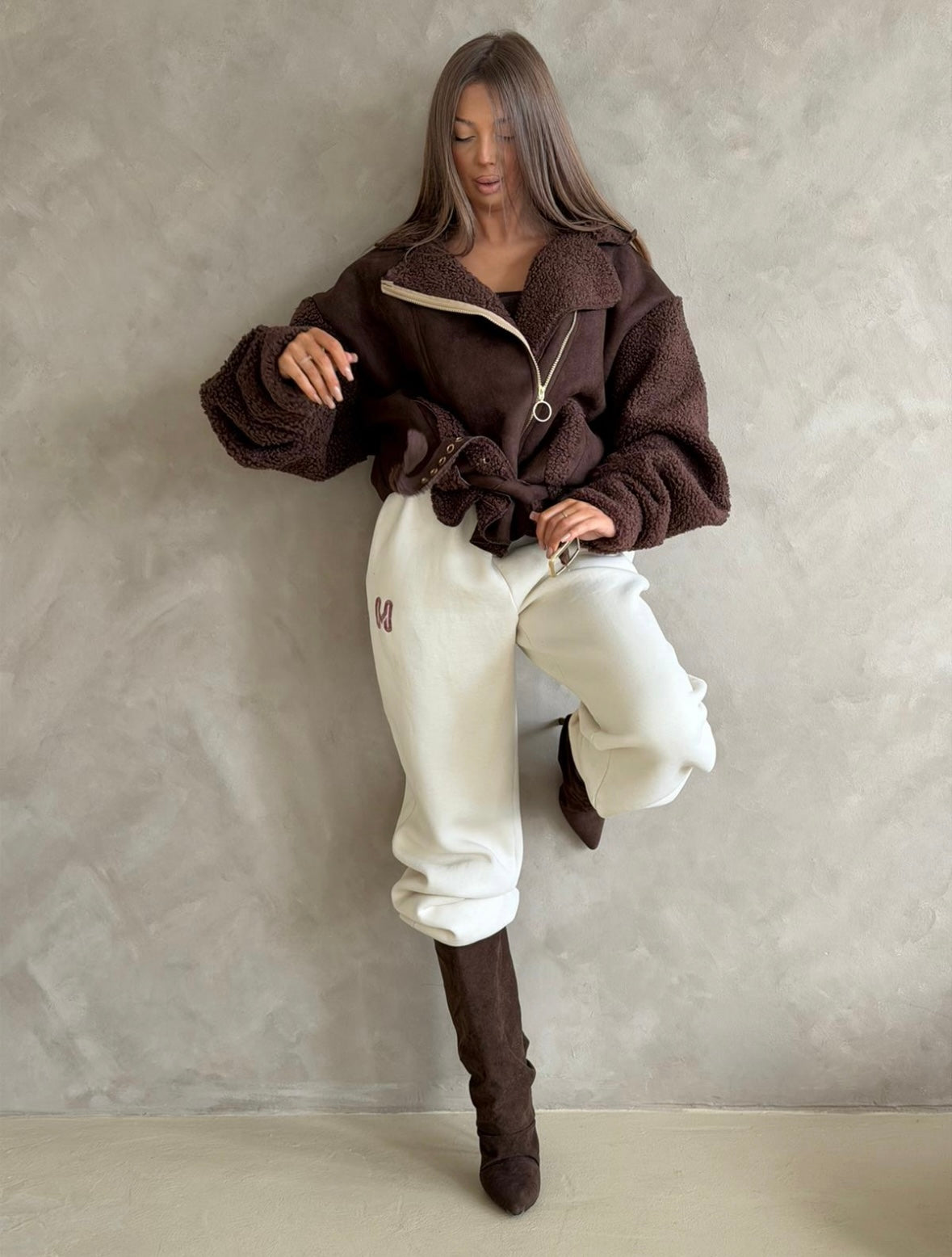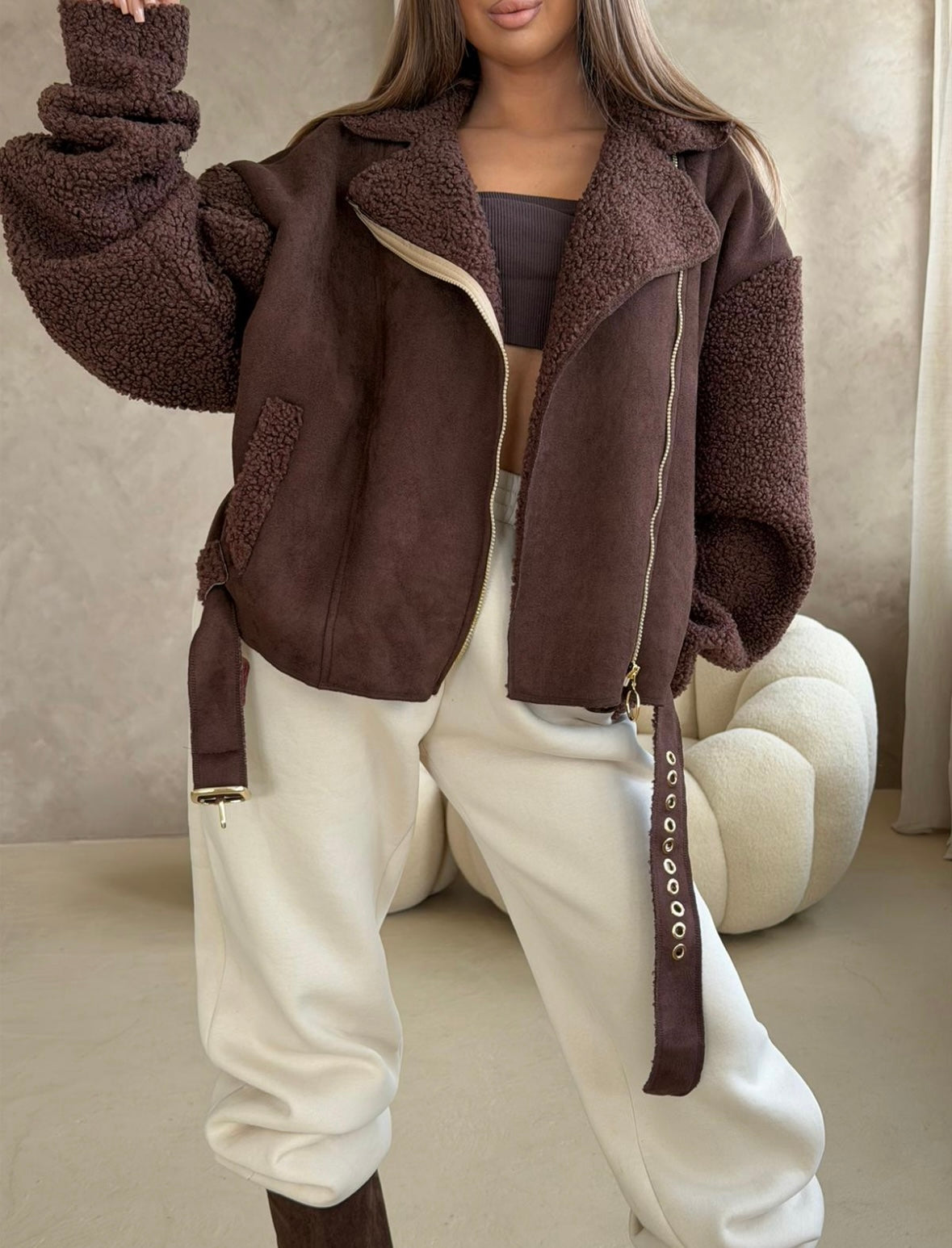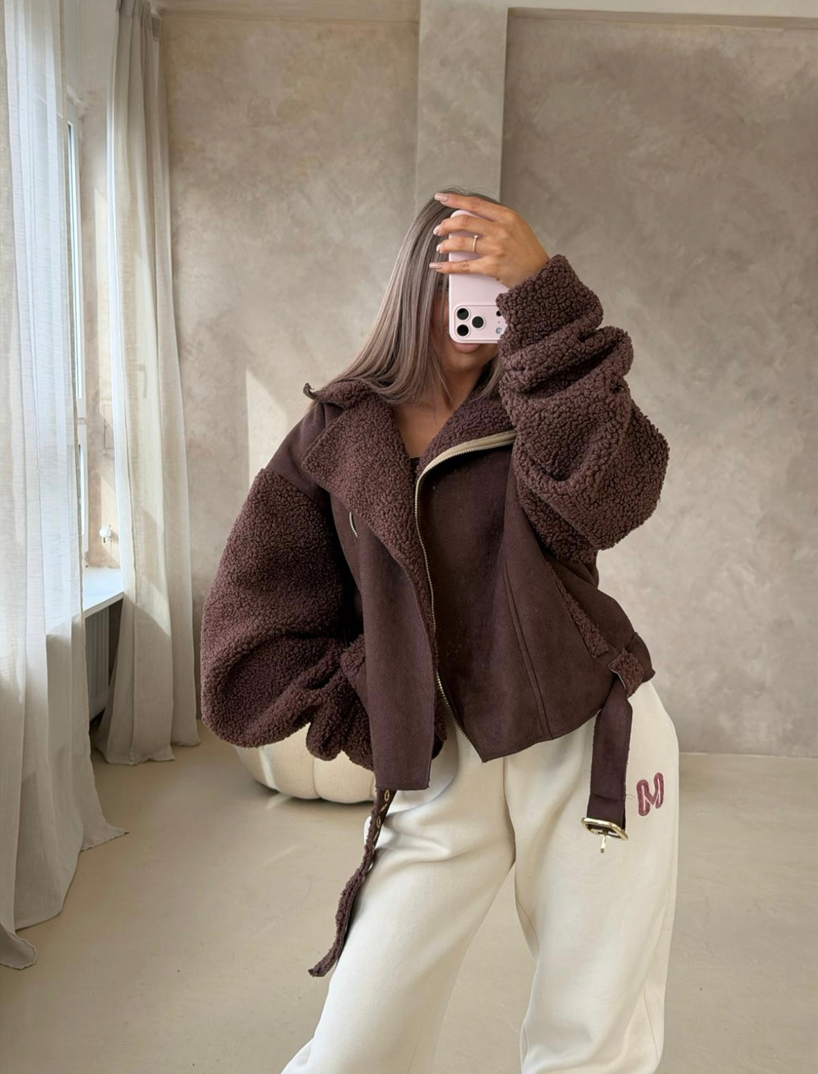 Stylowy, przytulny i niezwykle modny — ten brązowy kożuszek oversize to idealny wybór na chłodniejsze dni! Wykonany z miękkiego zamszu po zewnętrznej stronie oraz ciepłego futerka typu baranek od wewnątrz, gwarantuje komfort i elegancki wygląd w jednym.