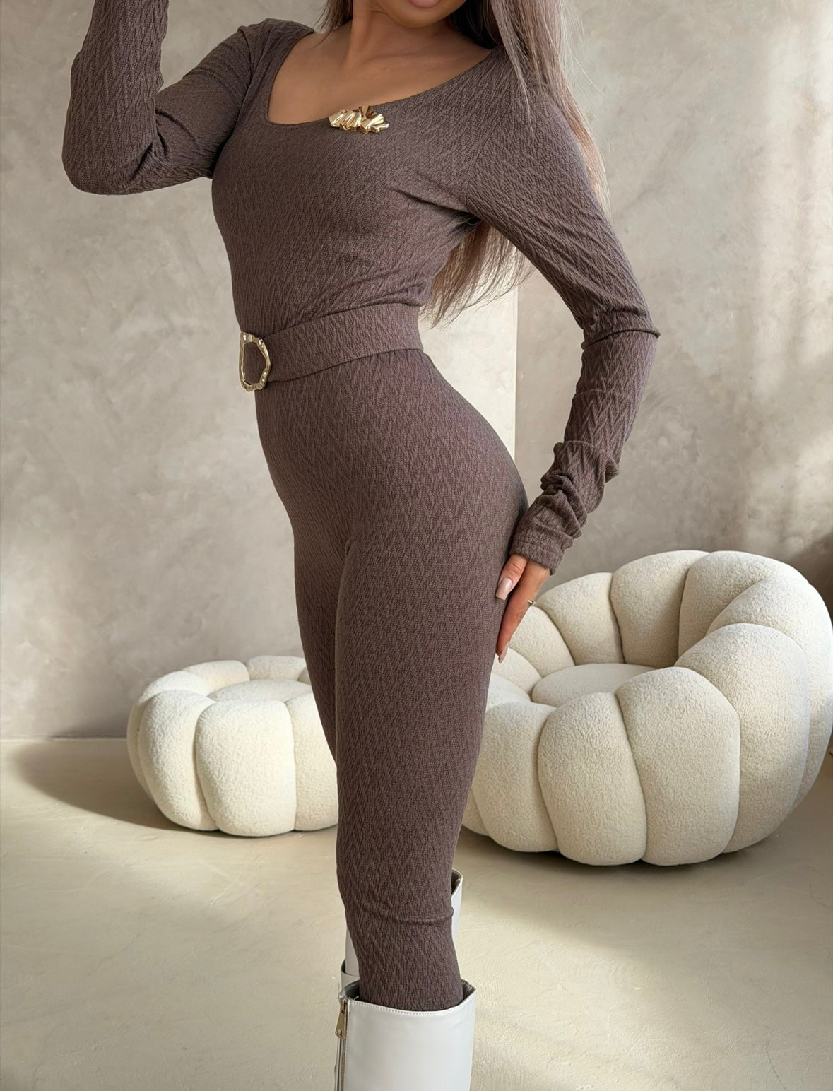 Ten kombinezon to idealny wybór zarówno na co dzień, jak i na wieczorne wyjścia — wystarczy zmienić dodatki, aby stworzyć zupełnie nowy look. Świetnie komponuje się z wysokimi kozakami, botkami czy eleganckimi szpilkami.