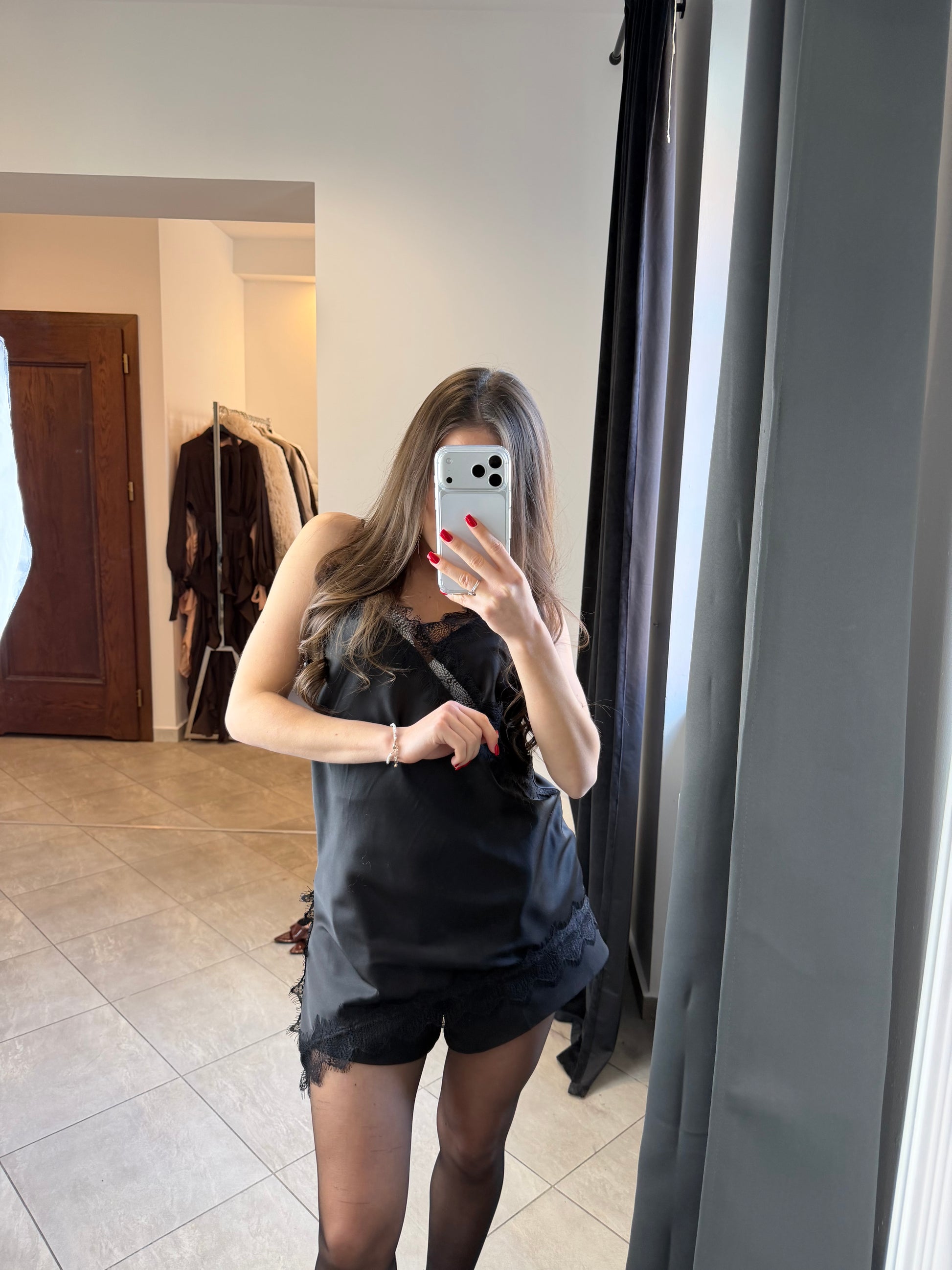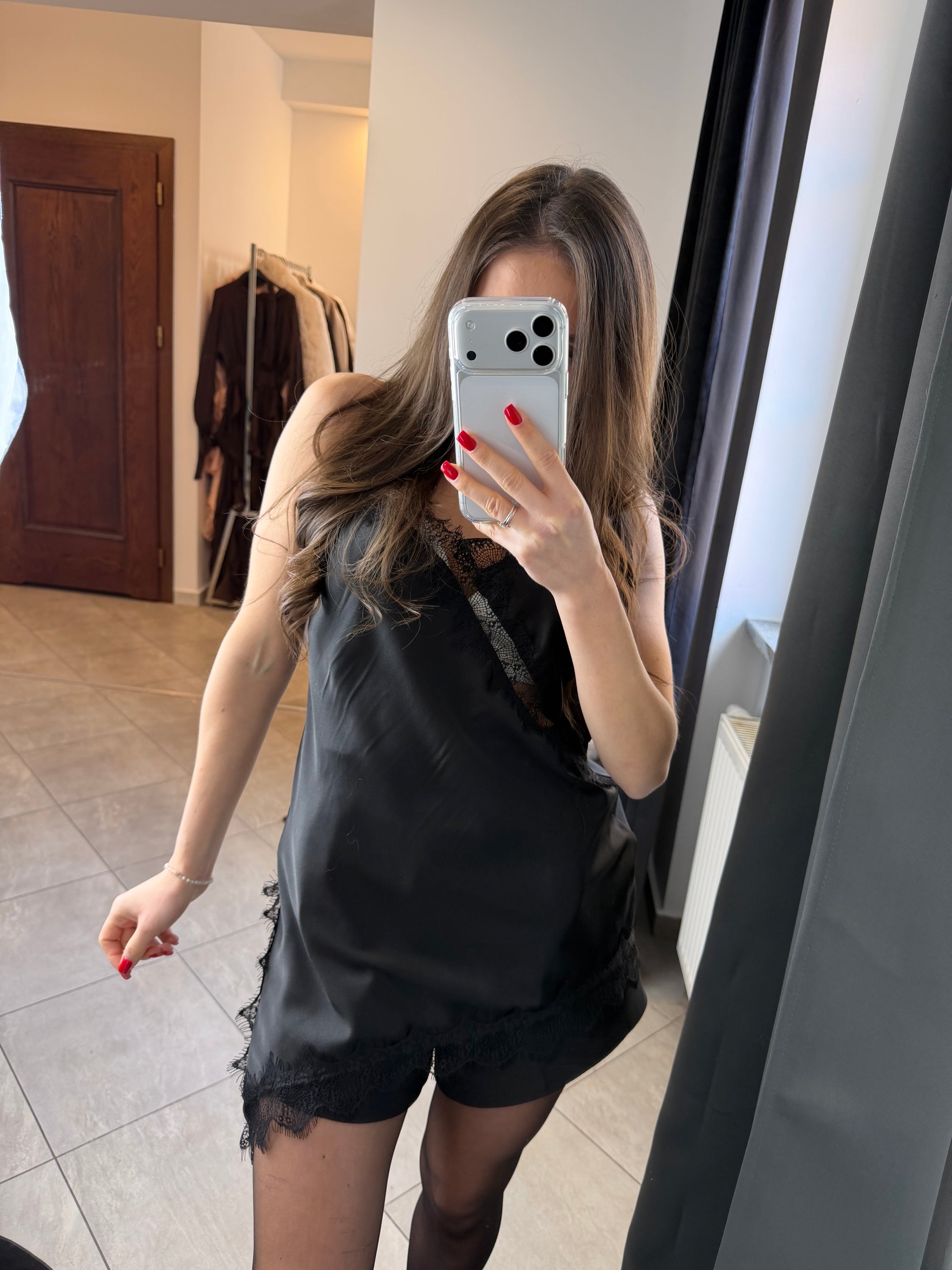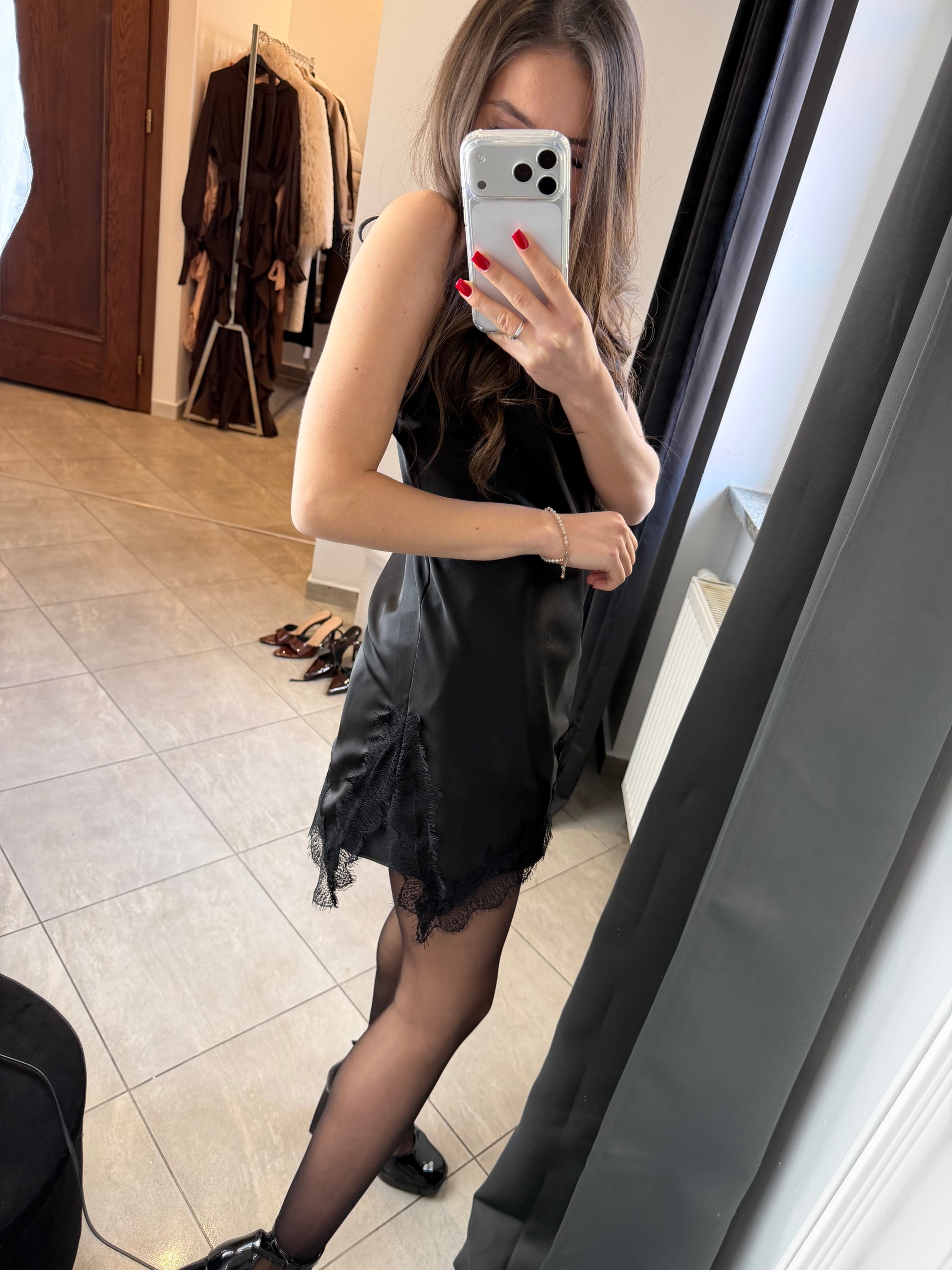 Ta czarna satynowa halka to połączenie delikatności, kobiecości i ponadczasowej elegancji. Wykonana z lekkiego, gładkiego materiału pięknie układa się na sylwetce, zapewniając jednocześnie komfort i subtelny połysk. Wykończenia z finezyjnej koronki przy dekolcie oraz na dole dodają całości zmysłowego charakteru i sprawiają, że halka prezentuje się wyjątkowo stylowo.