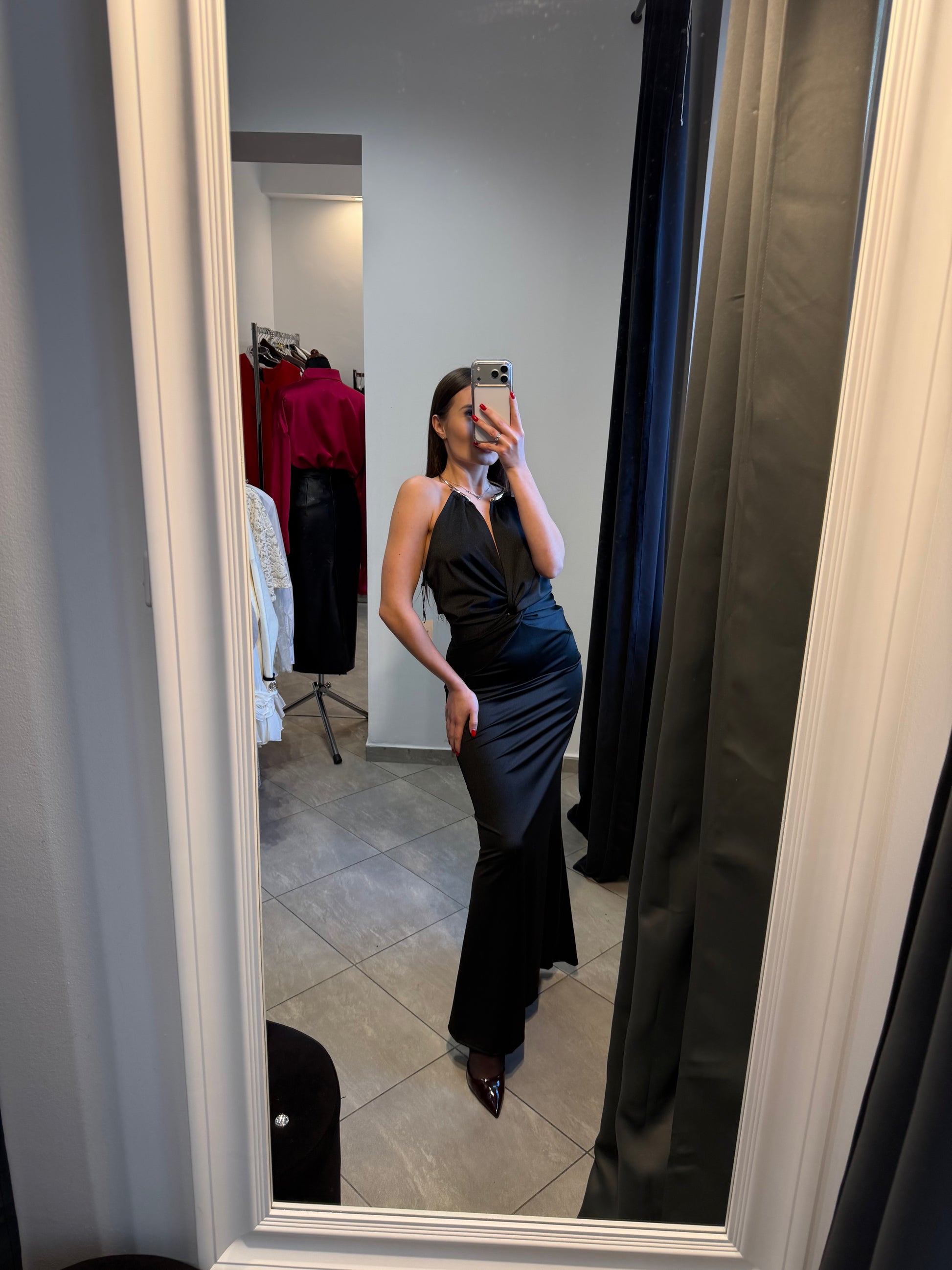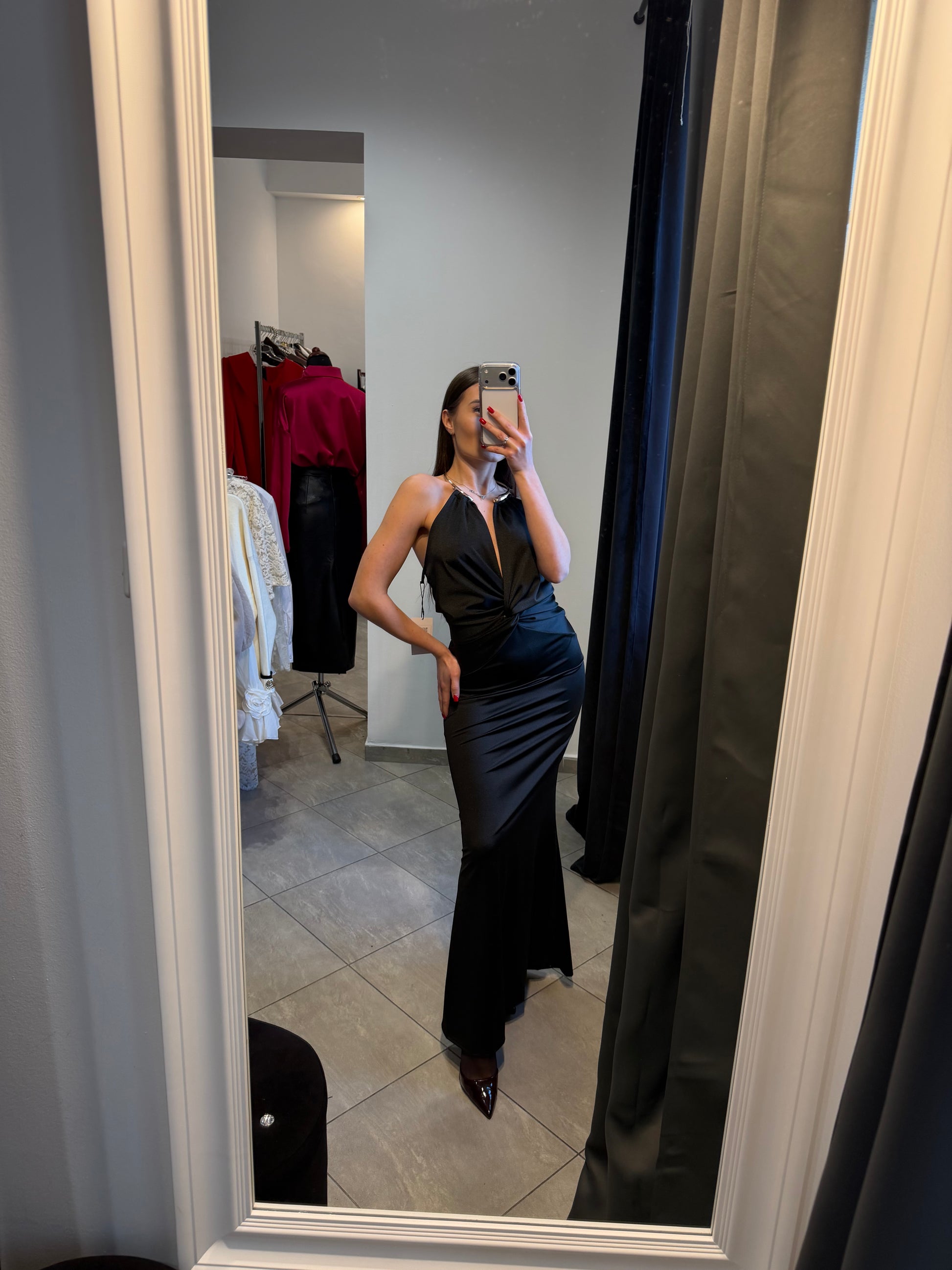 Czarna satynowa sukienka maxi ze złotą ozdobą na szyi