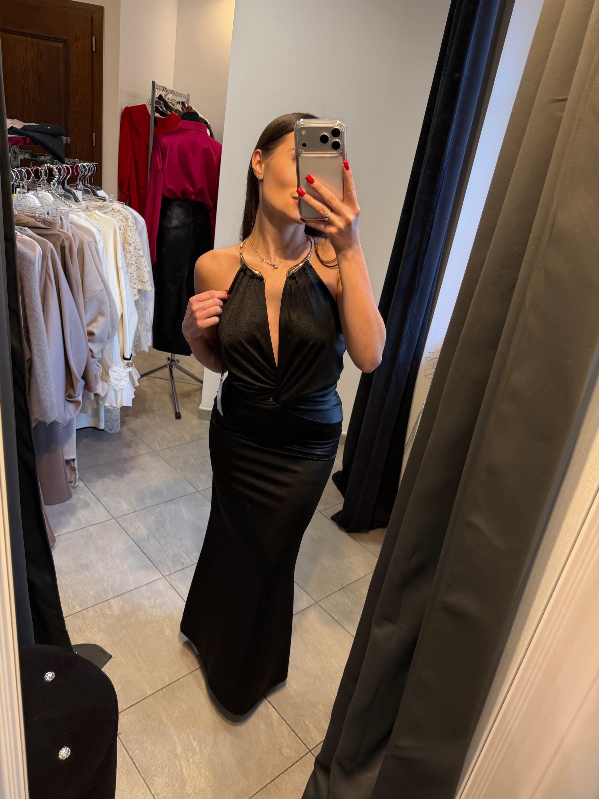 Elegancka czarna sukienka maxi wykonana z luksusowej, delikatnie połyskującej satynowej tkaniny. Model wyróżnia się efektowną złotą ozdobą przy dekolcie, która zastępuje klasyczne wiązanie i nadaje całości wyjątkowego, biżuteryjnego charakteru. Odkryte ramiona oraz subtelny dekolt pięknie podkreślają kobiecą sylwetkę.