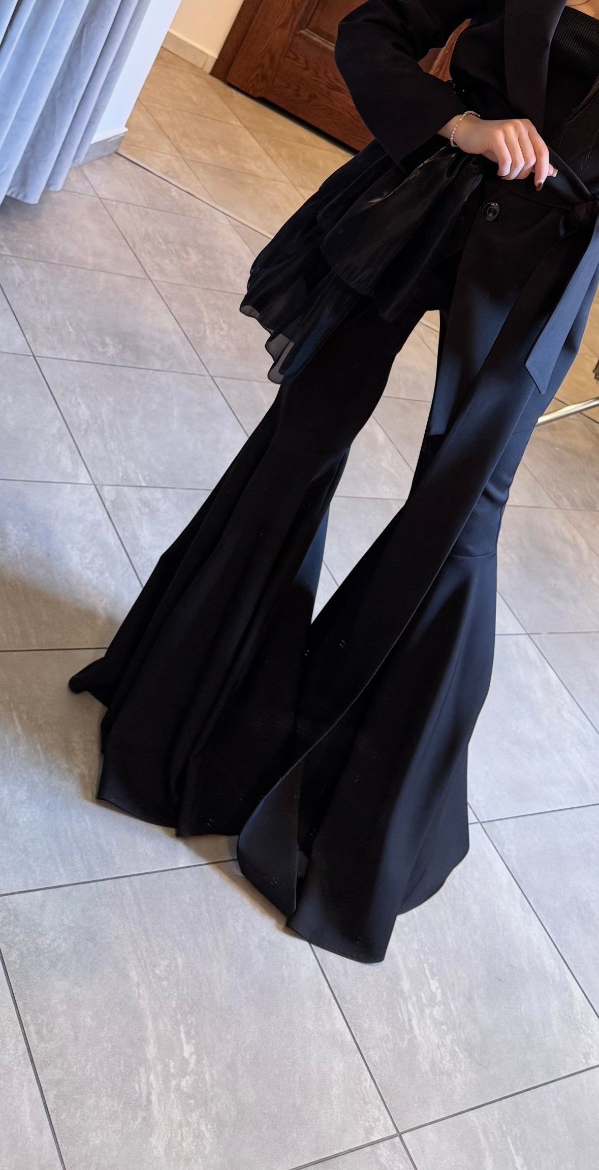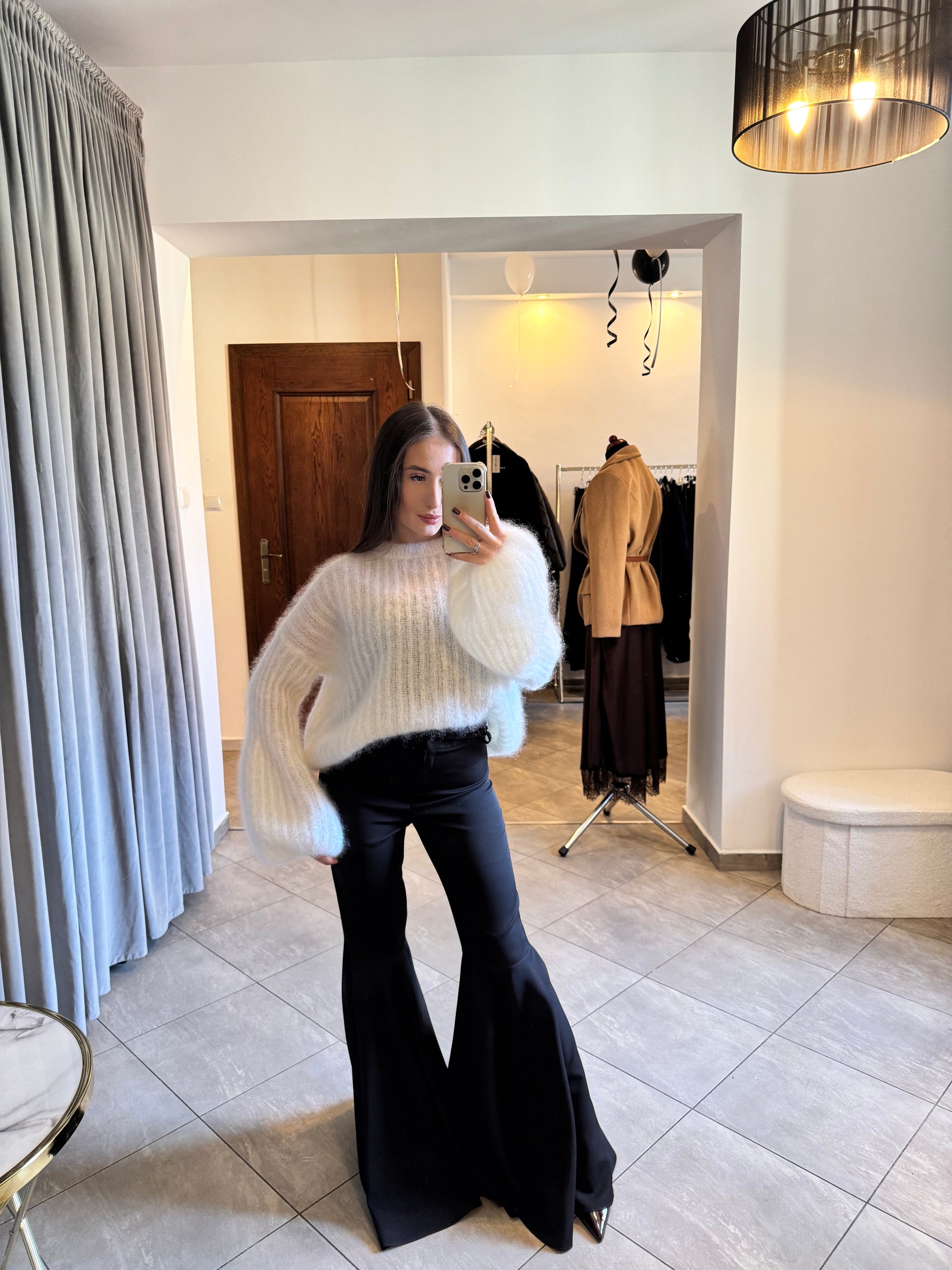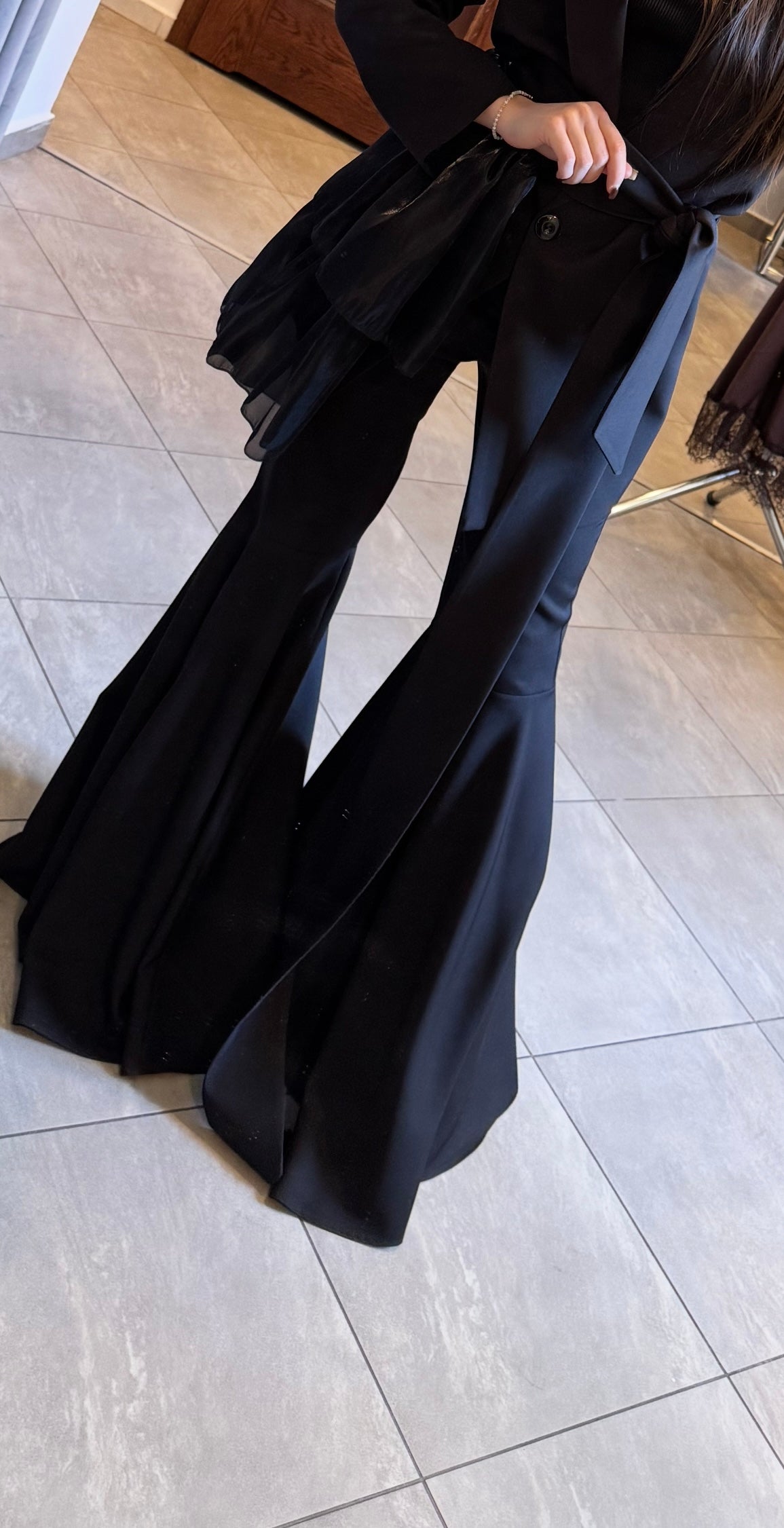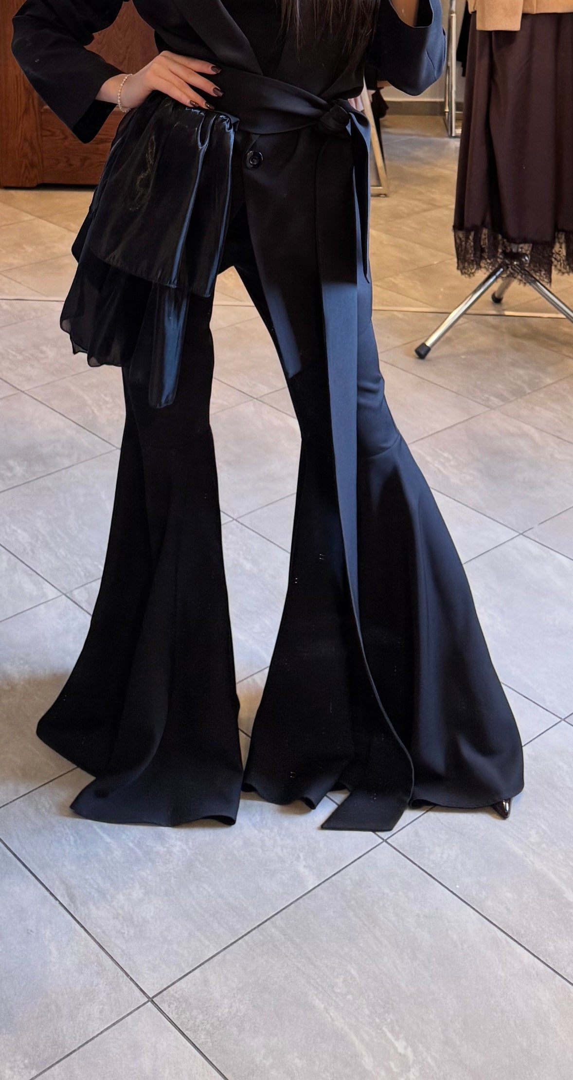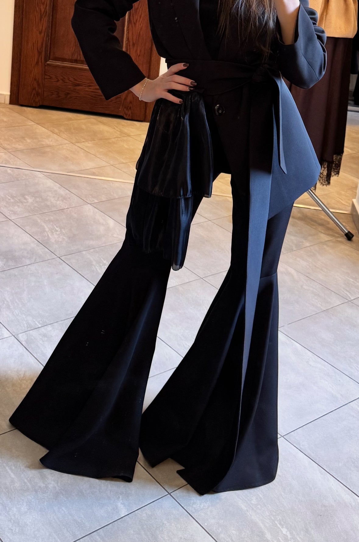 Spodnie Flare Vision to modowy akcent, który przyciąga uwagę swoim wyjątkowym krojem. Wysoki stan i szerokie, rozkloszowane nogawki optycznie wydłużają sylwetkę, nadając jej lekkości i proporcji. Wykonane z miękkiej, ale stabilnej tkaniny, pięknie układają się w ruchu. Świetnie prezentują się zarówno w komplecie z marynarką Sculpted Noir, jak i w stylizacjach casualowych z koszulą lub topem.