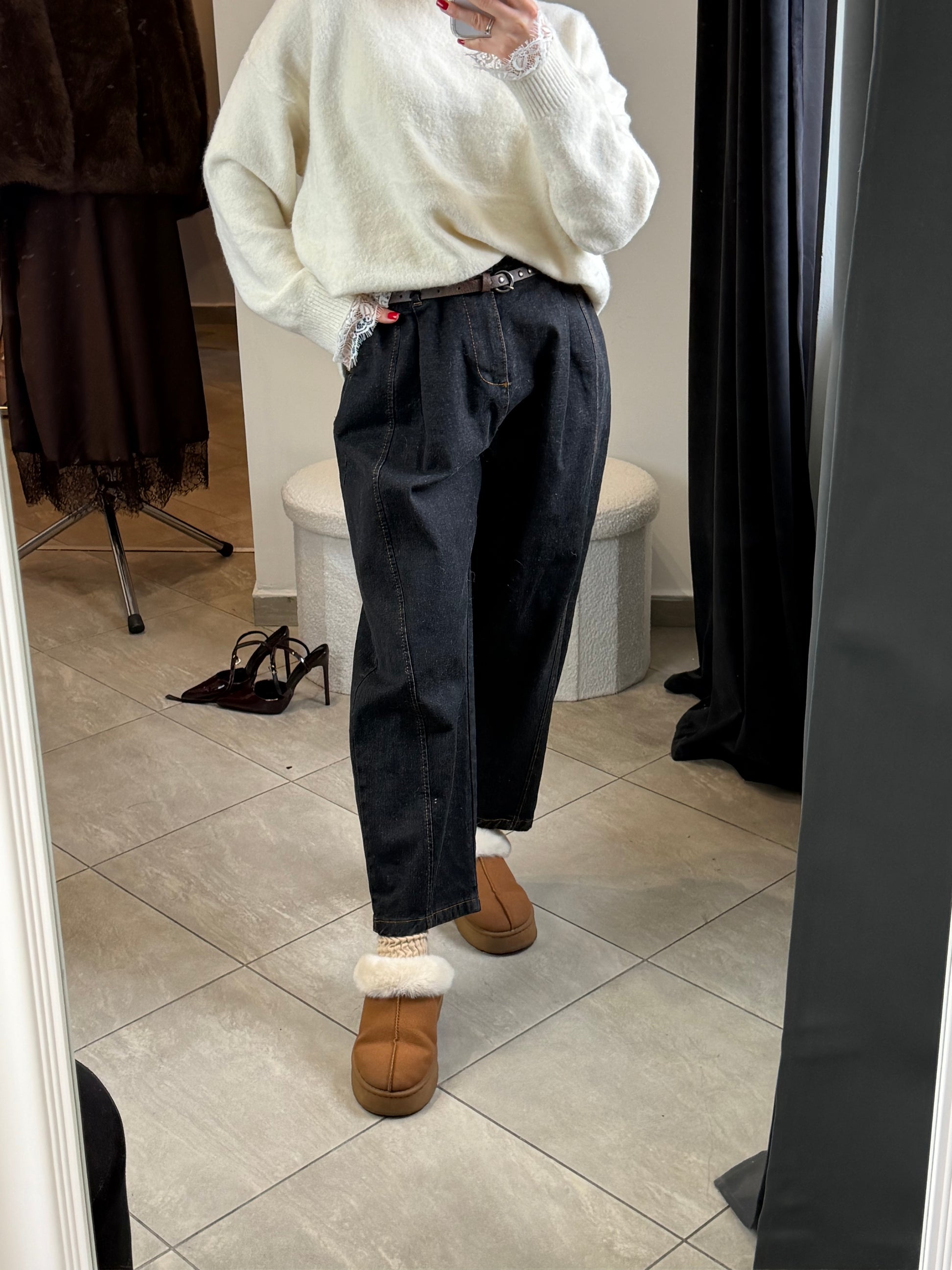 Czarne jeansy z wysokim stanem, zaszewkami i paskiem w zestawie