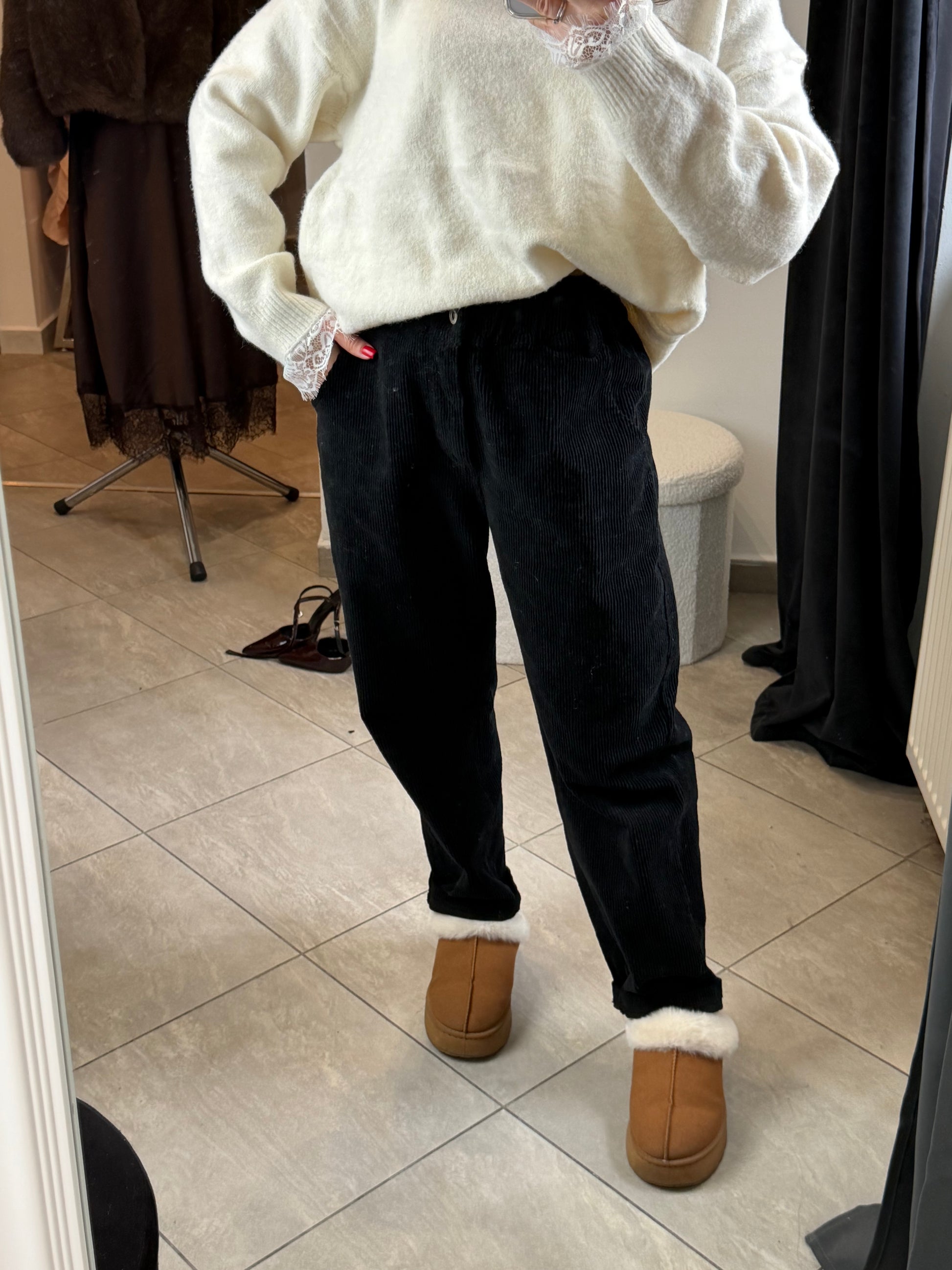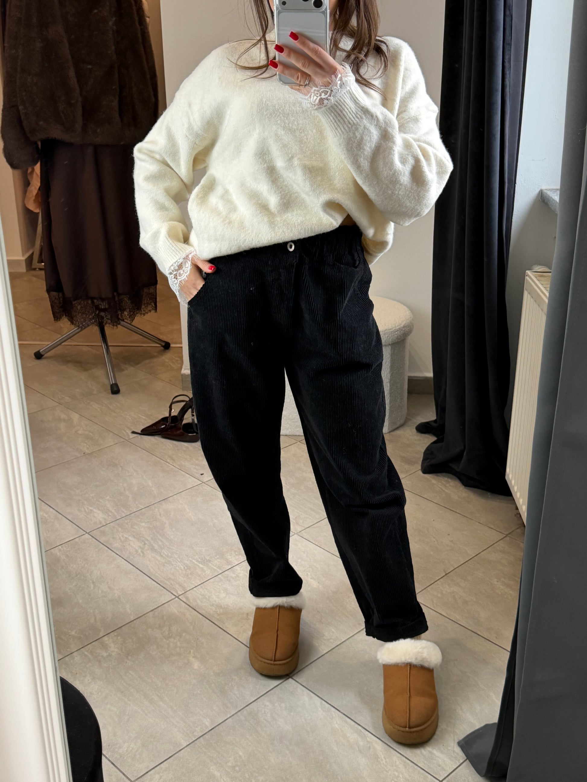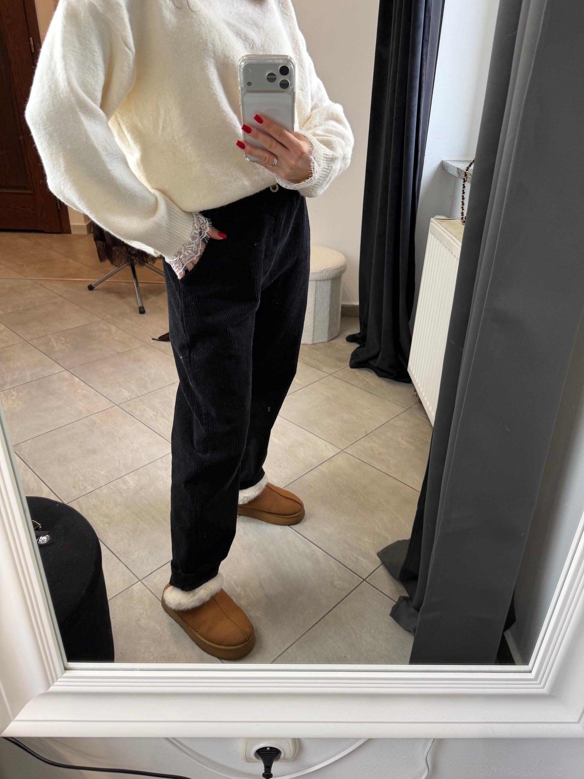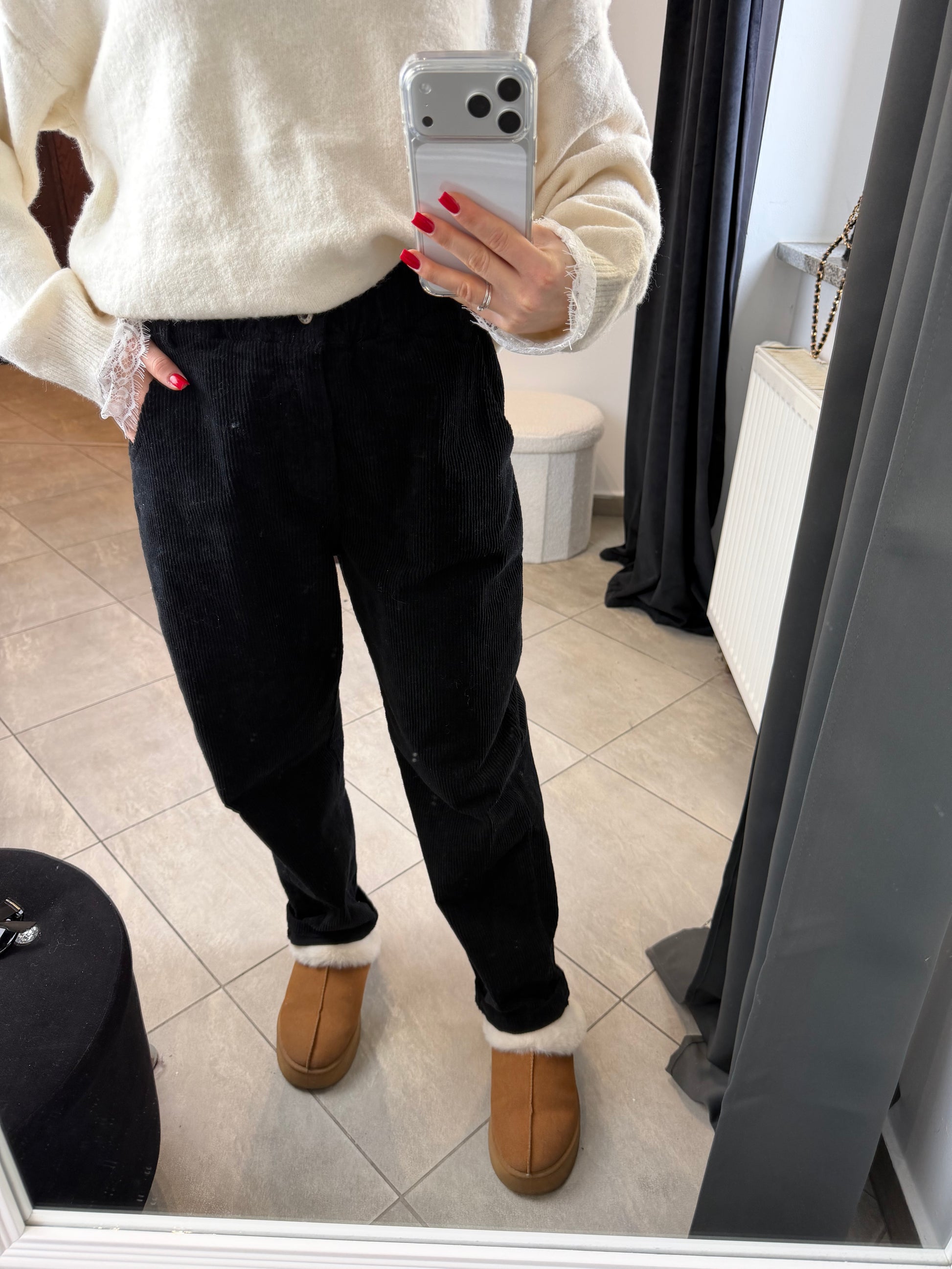 Te czarne sztruksowe spodnie to idealne połączenie wygody i stylu. Wykonane z miękkiego, przyjemnego w dotyku sztruksu, mają lekko luźny, swobodny krój, który zapewnia komfort przez cały dzień. Klasyczna czerń sprawia, że łatwo dopasujesz je do różnych stylizacji — zarówno casualowych, jak i bardziej eleganckich.