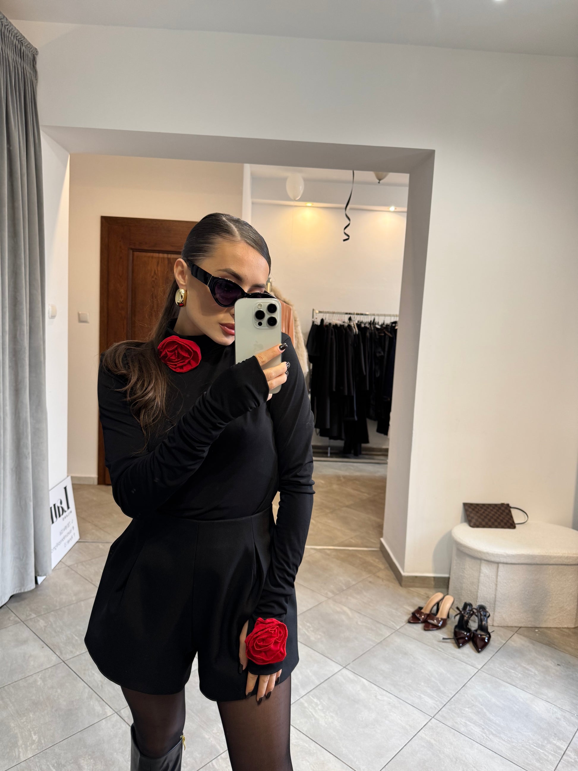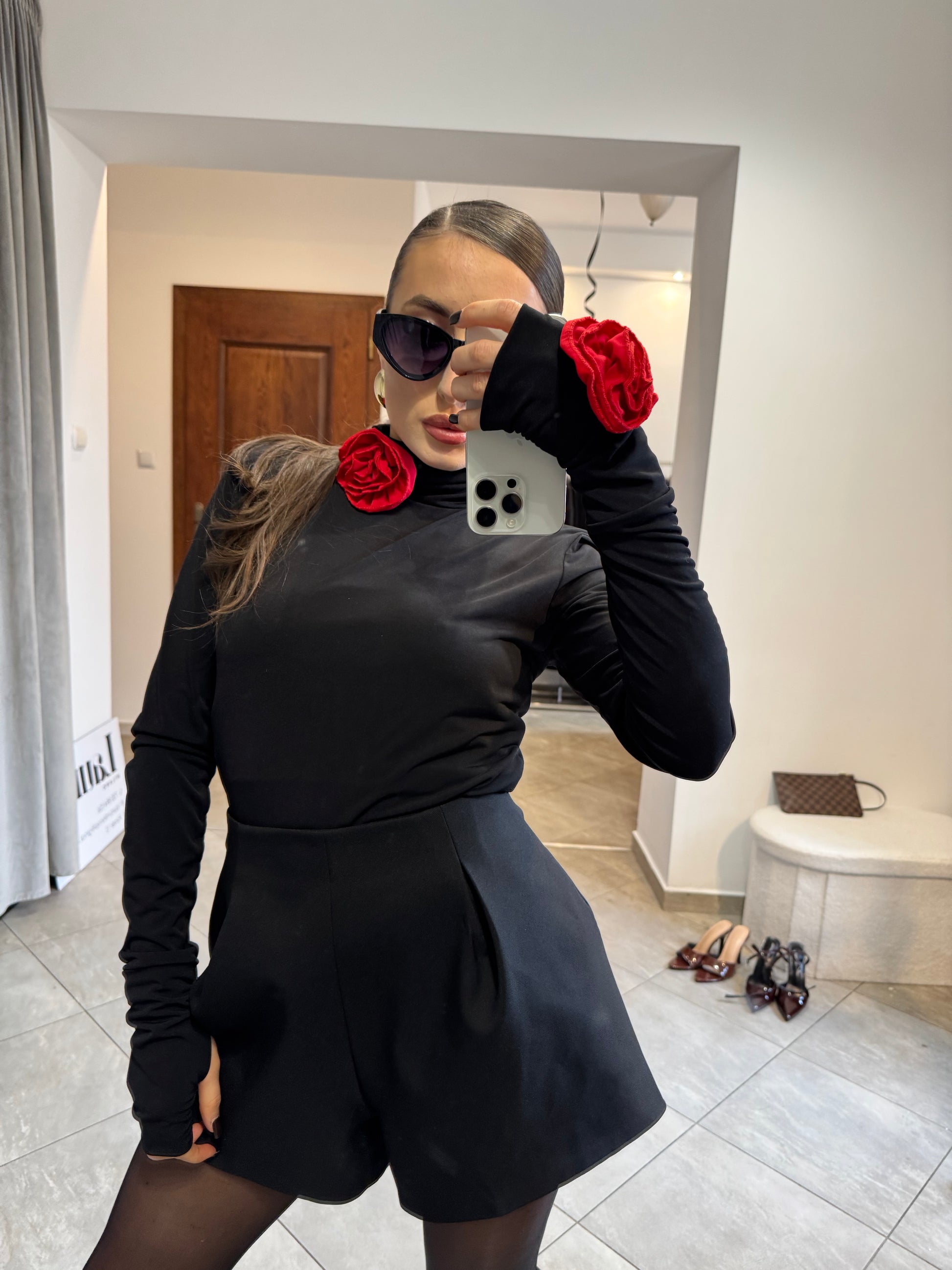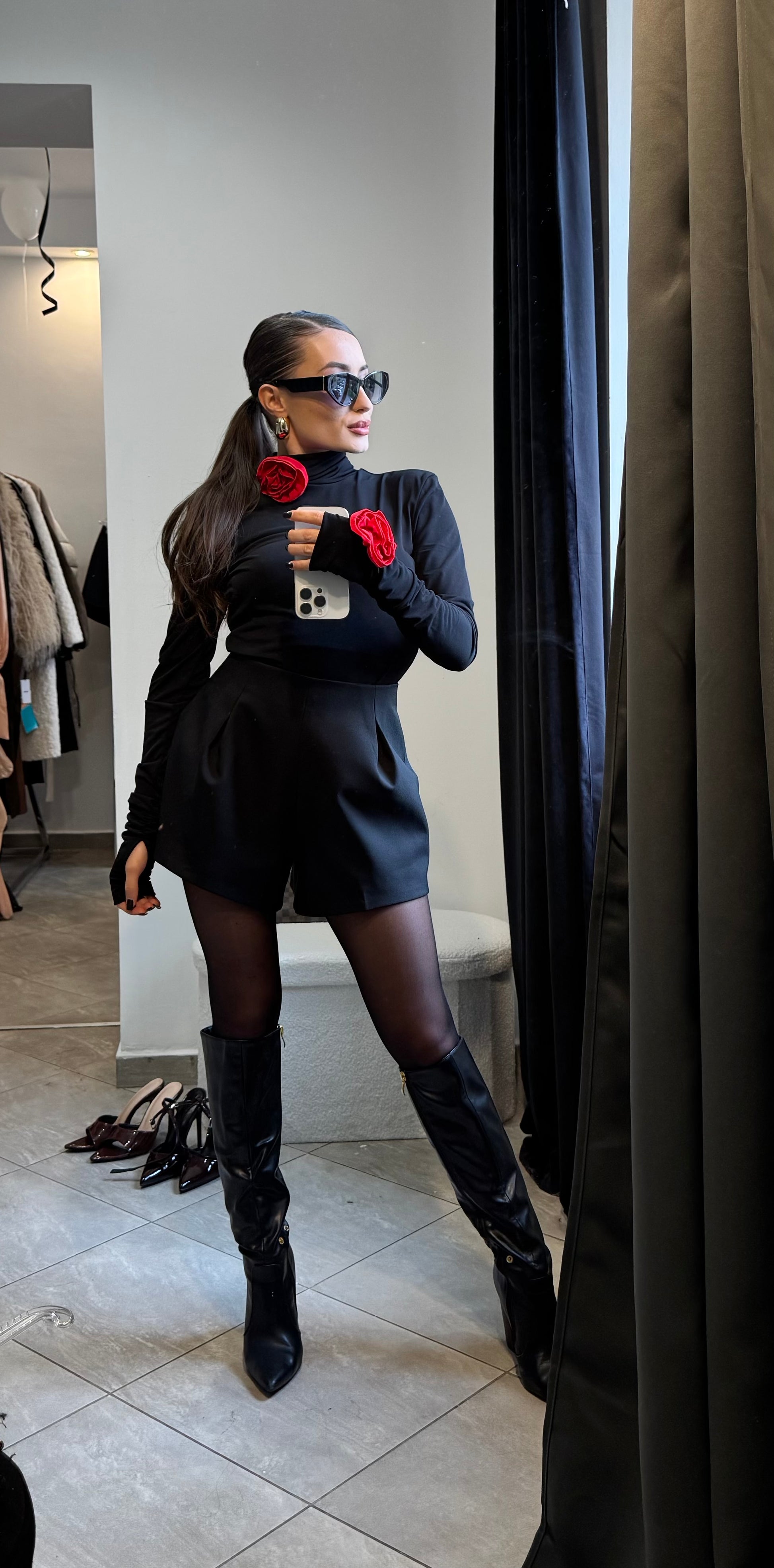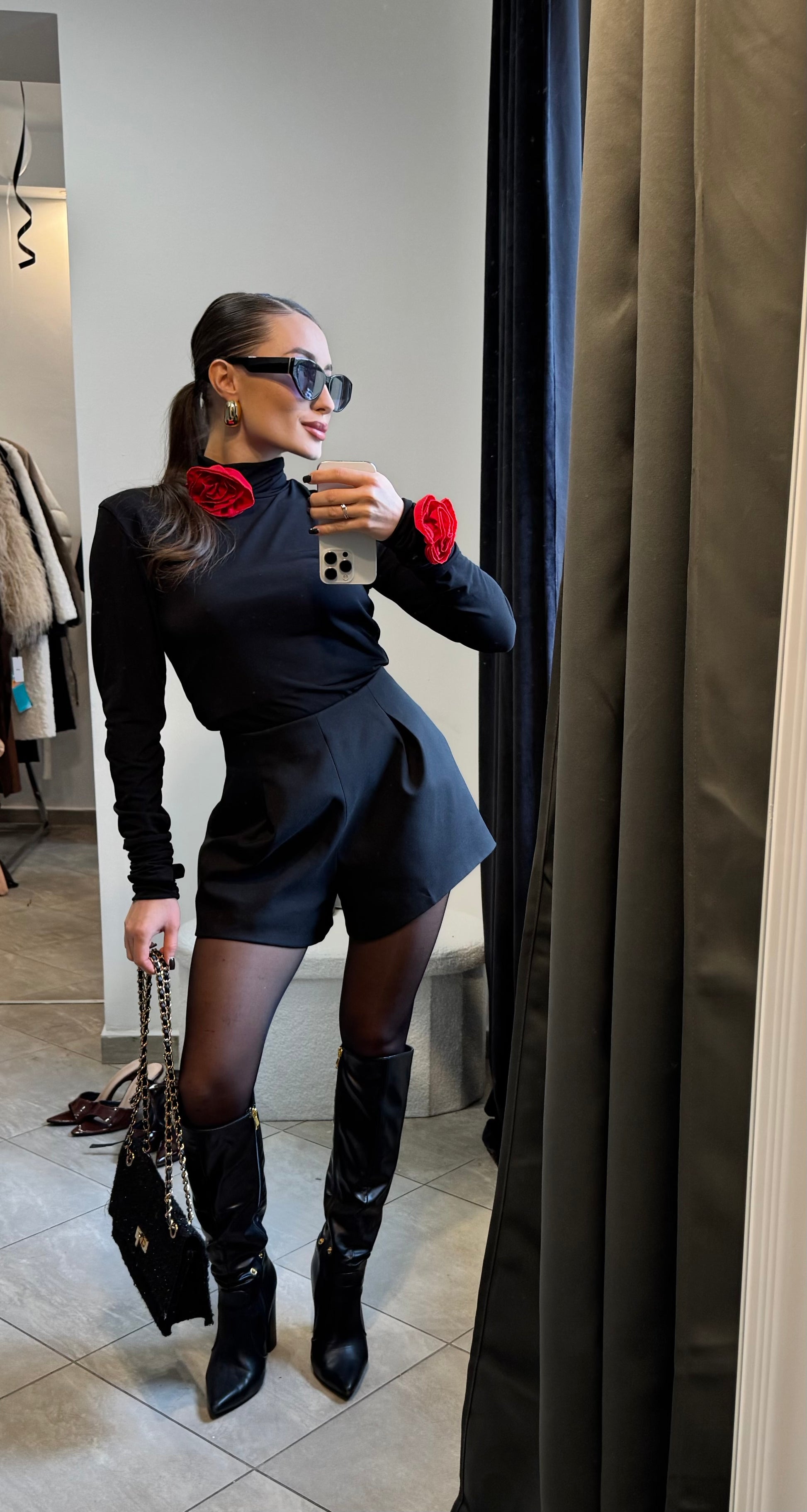 Stylowy czarny golf z efektowną, trójwymiarową różą to wyjątkowy model, który natychmiast przyciąga uwagę. Delikatnie dopasowany krój pięknie podkreśla sylwetkę, a elastyczny, miękki materiał zapewnia komfort przez cały dzień.