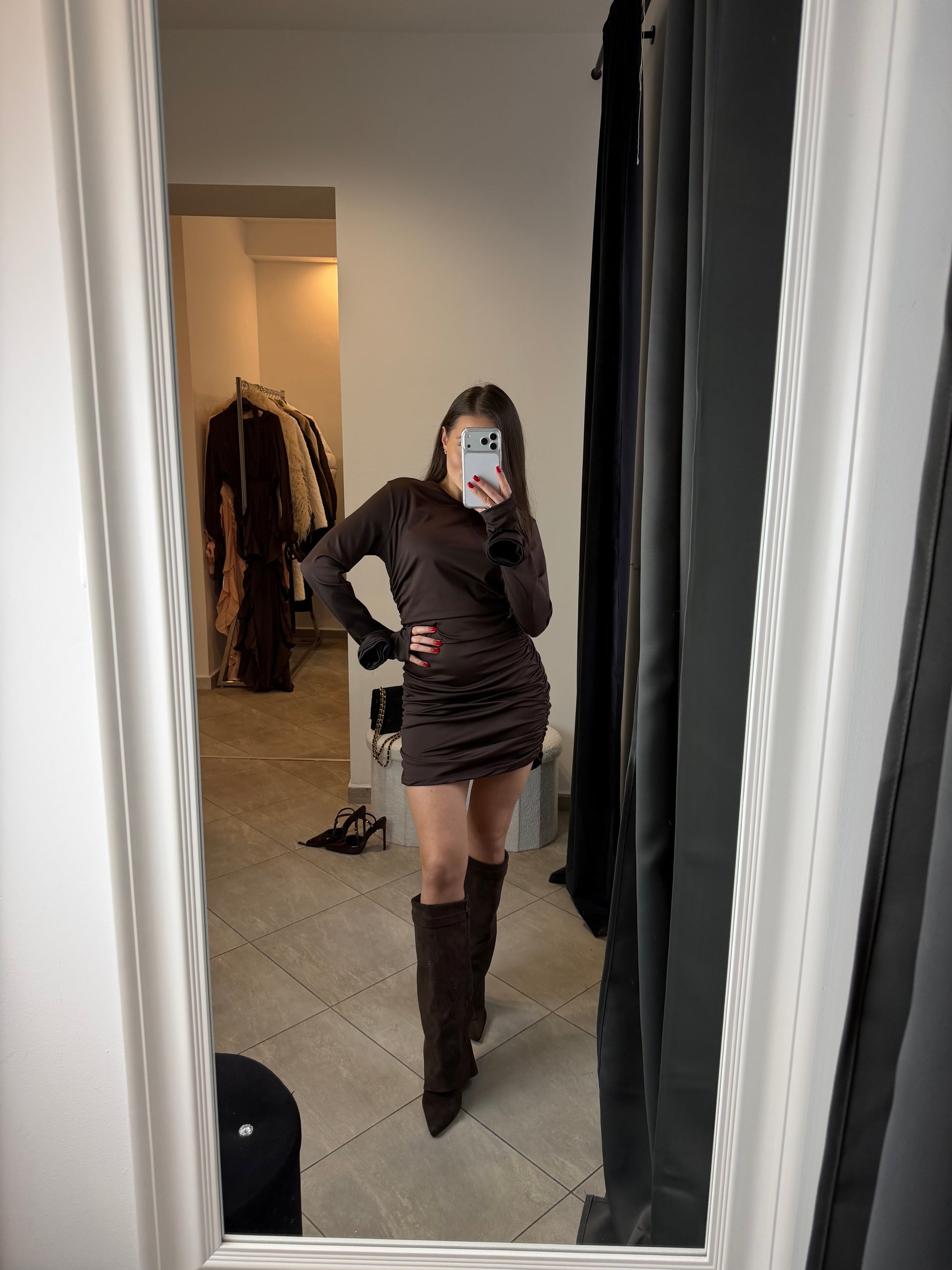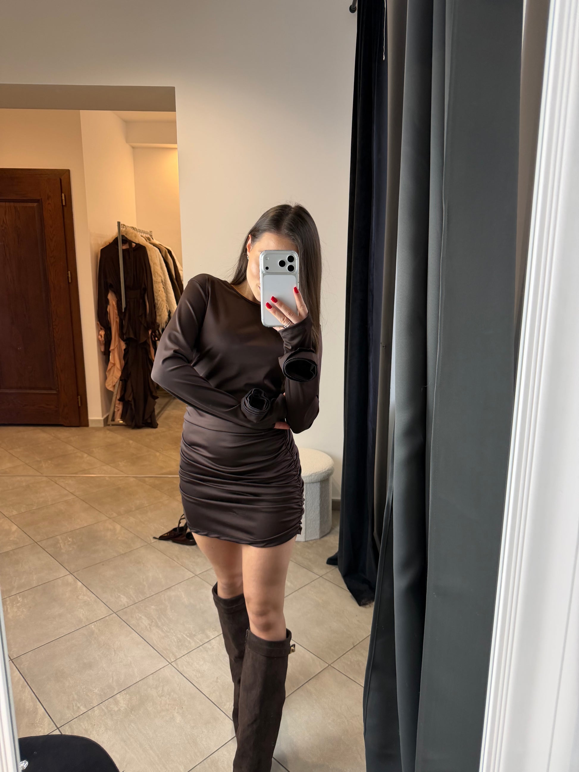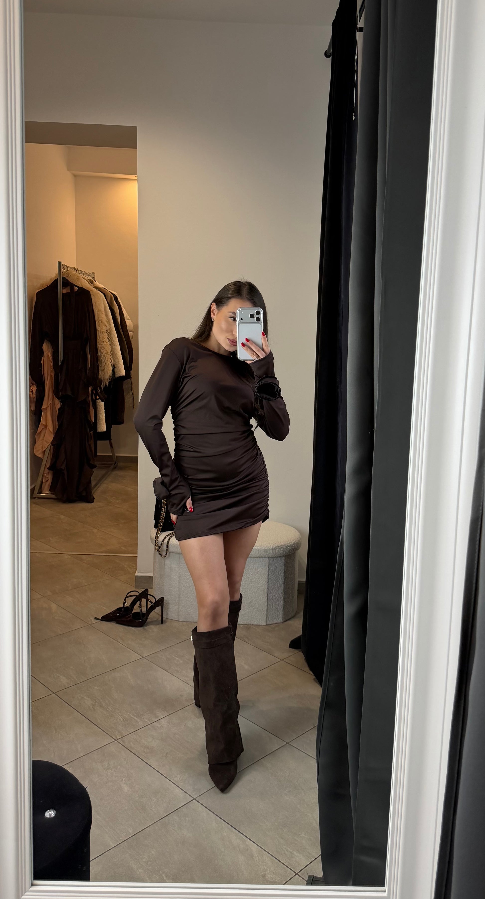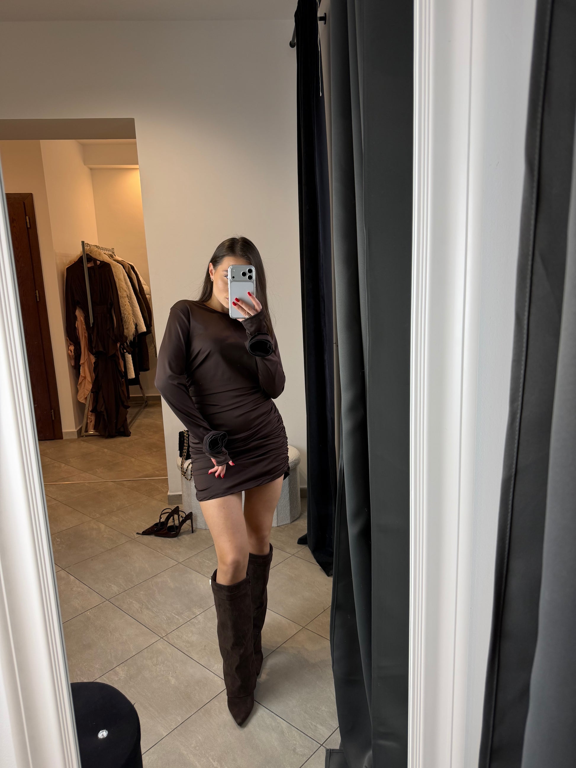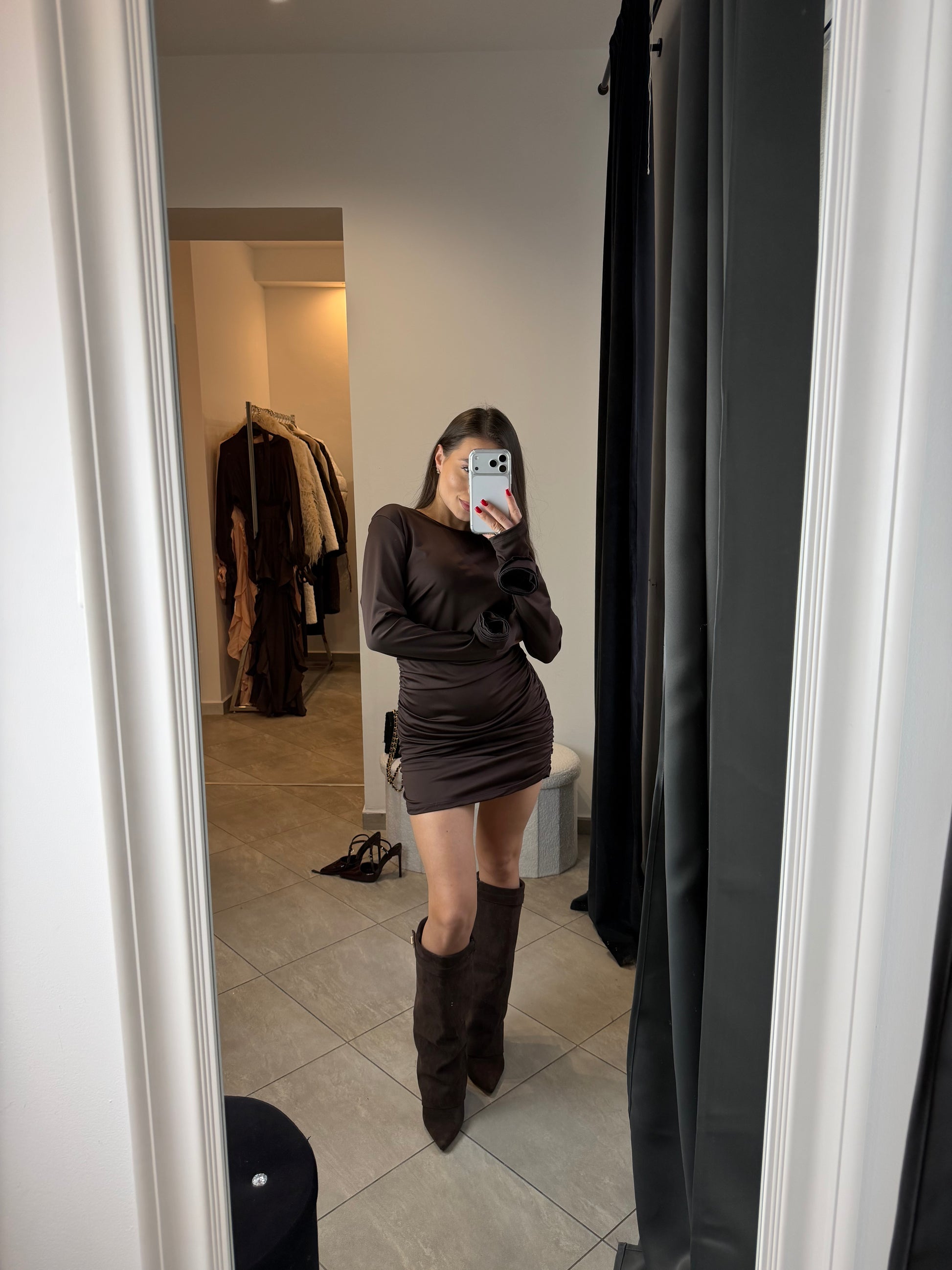 Czekoladowa sukienka mini z długim rękawem i bocznymi marszczeniami