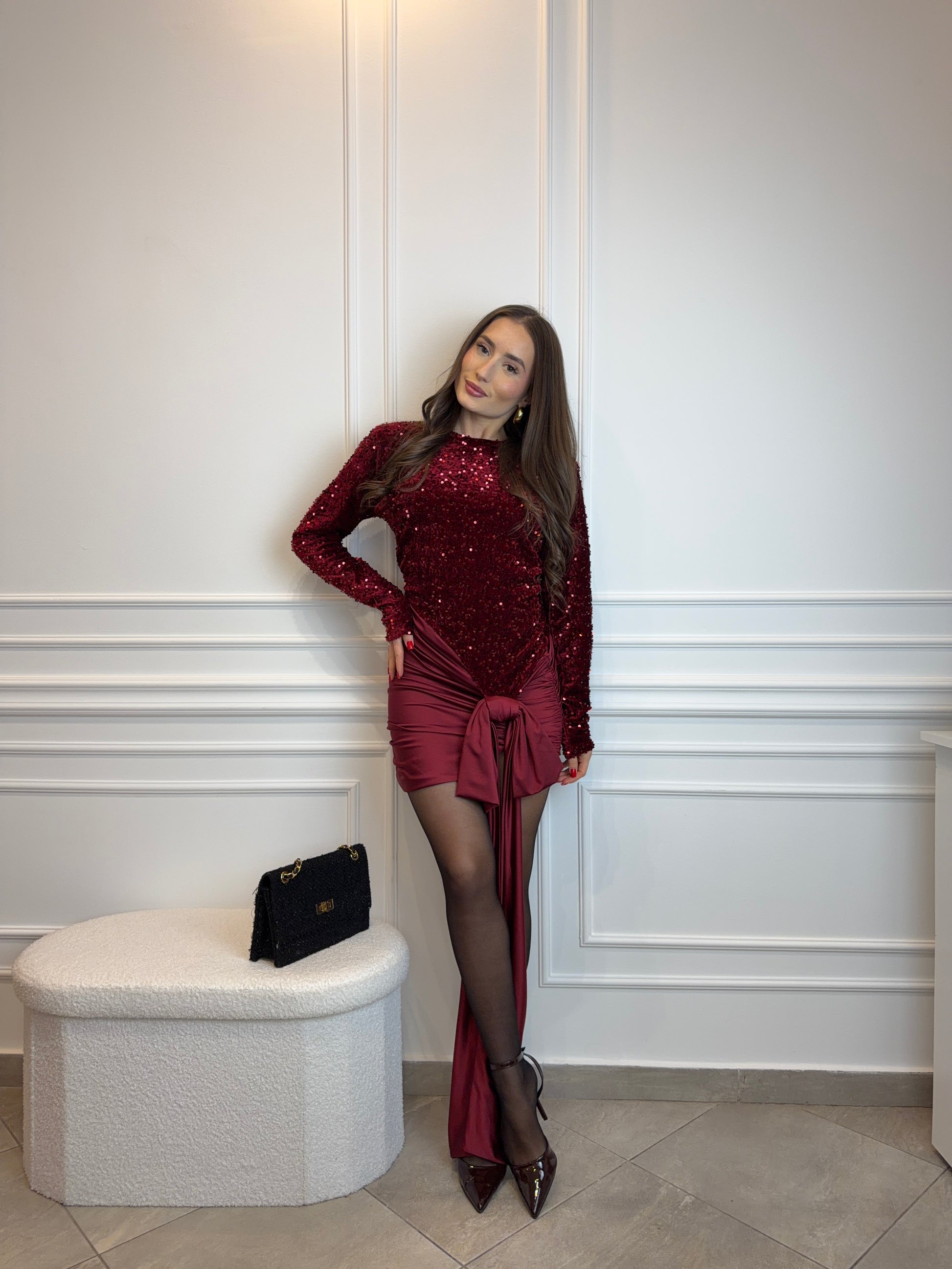 Górna część sukienki wykonana jest z drobnych, połyskujących cekinów, które pięknie mienią się przy każdym ruchu, dodając stylizacji luksusowego charakteru. Dopasowany krój oraz długi rękaw subtelnie podkreślają sylwetkę, nadając jej harmonii.