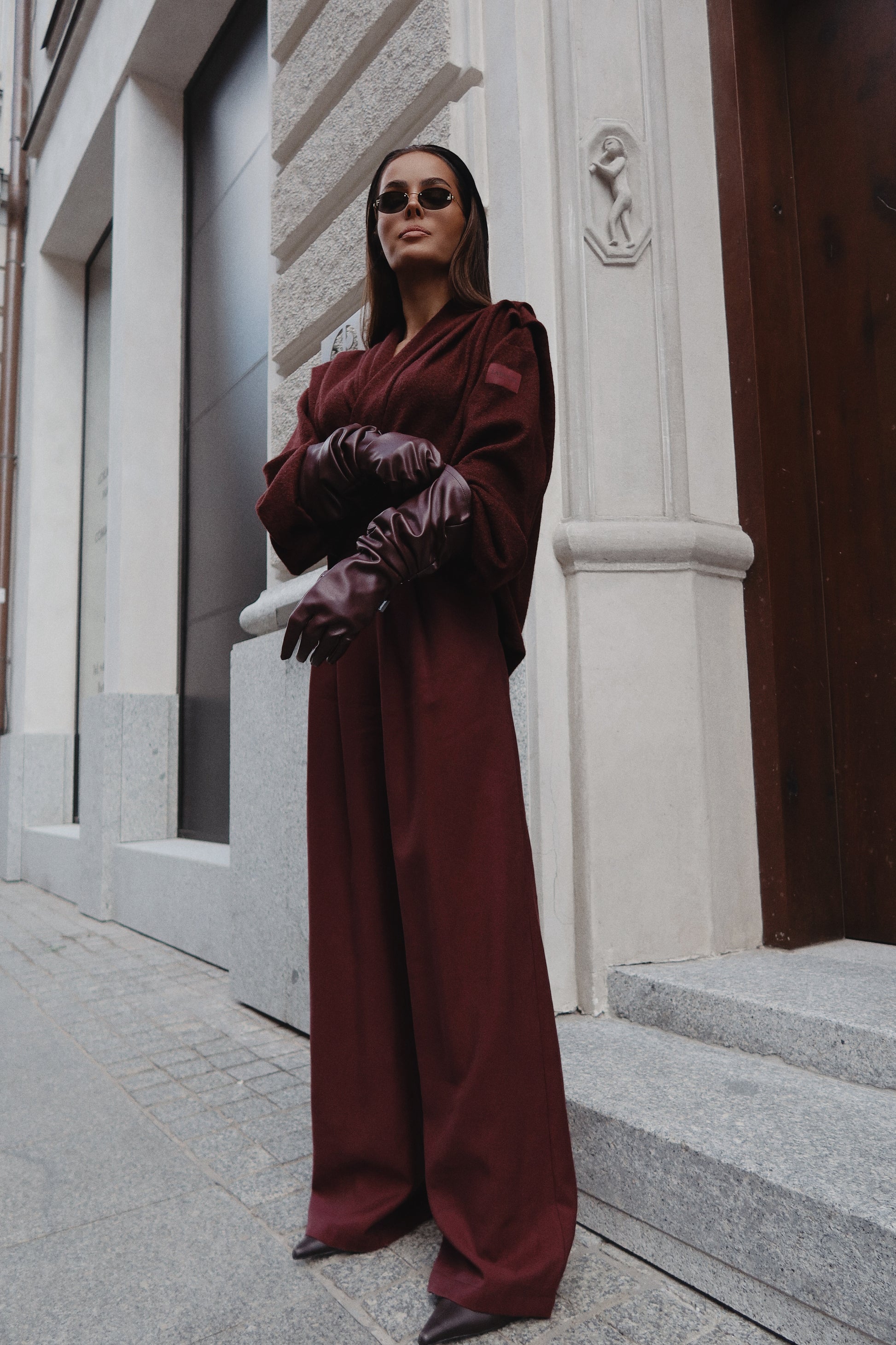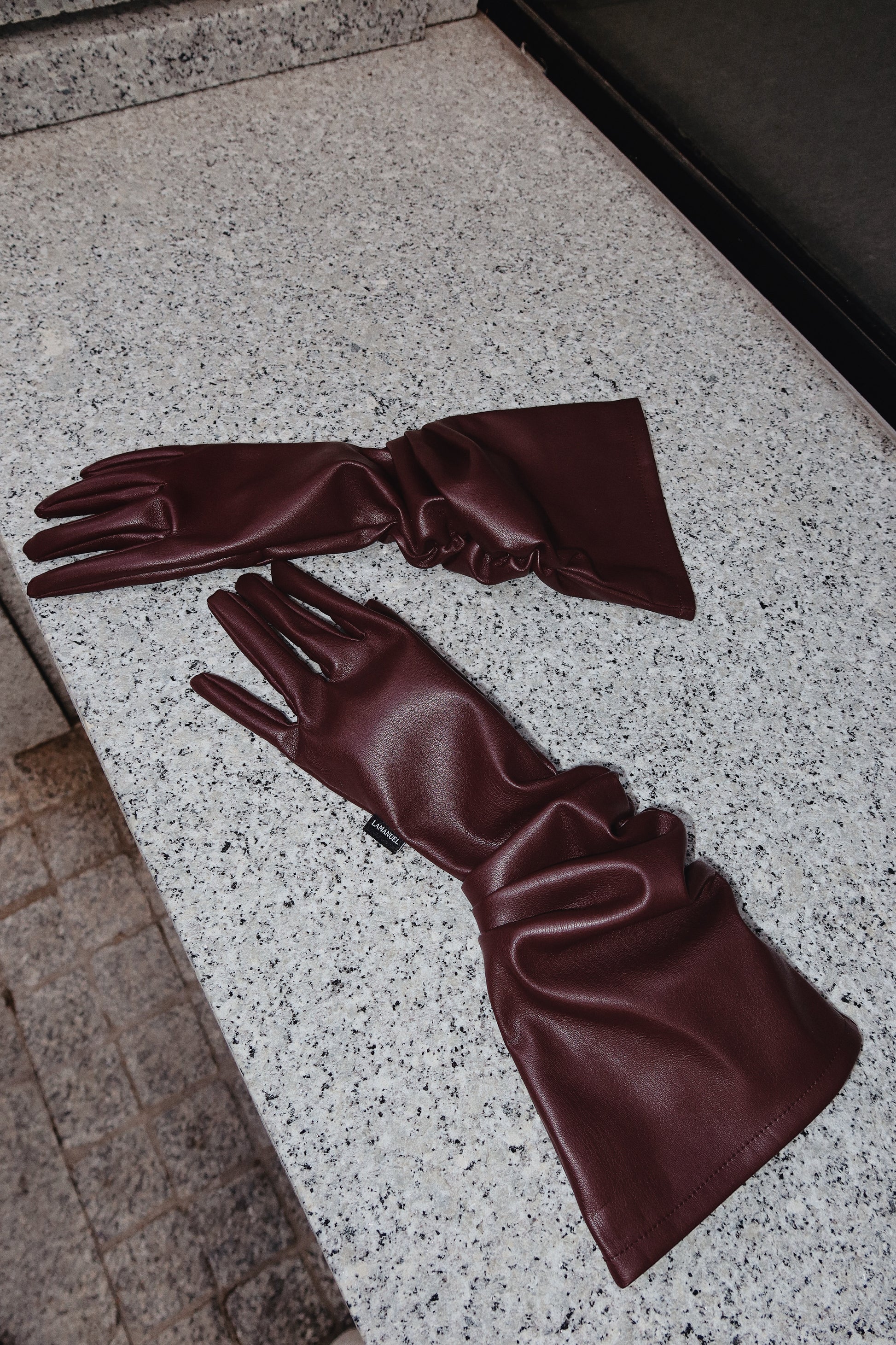 Stylowe, długie rękawiczki wykonane z wysokiej jakości skóry ekologicznej w odcieniu głębokiego burgundu. Miękkie, przyjemne w dotyku i doskonale dopasowujące się do dłoni – stanowią idealne połączenie elegancji i komfortu.