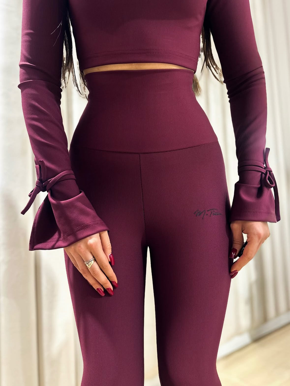 Stylowy komplet dwuczęściowy w określonym kolorze burgundu, idealny na co dzień lub na wyjątkowe okazje. Wykonanie z elastycznego, przyjemnego w dotyku materiału, który doskonale dopasowuje się do wyglądu i kształtu kobiecego.