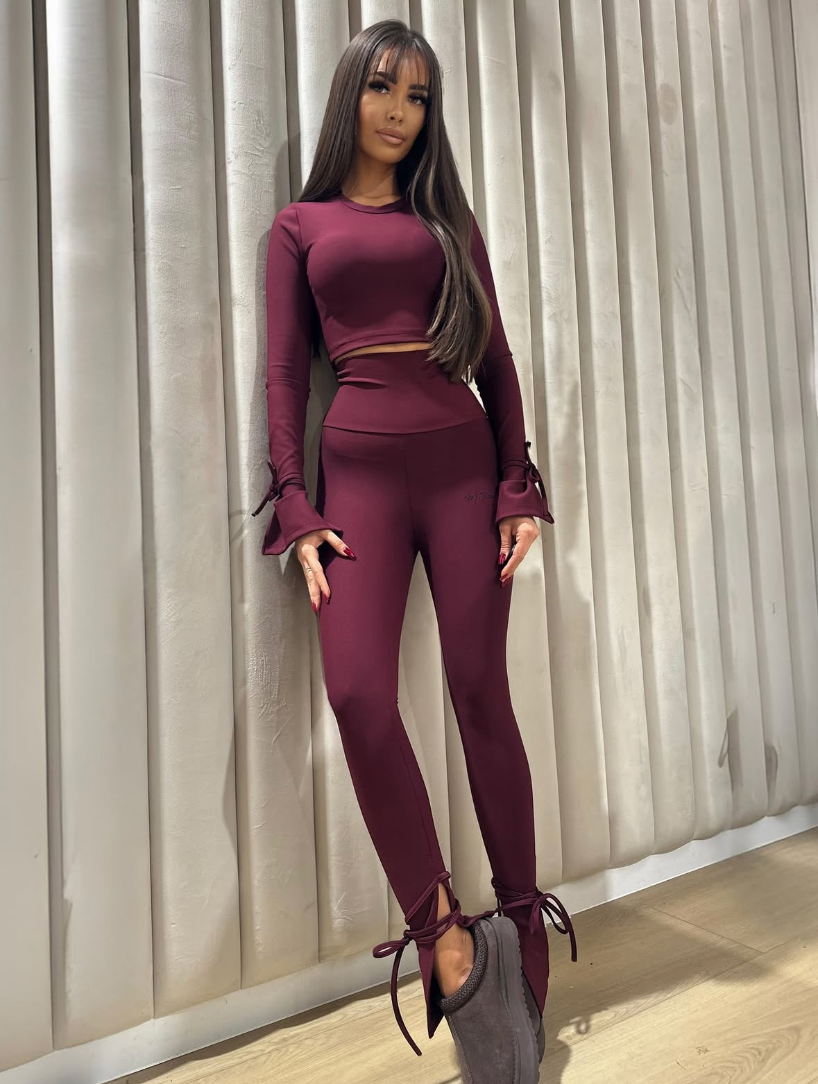 Krótki top z przedłużeniem mającym zastosowanie rozcięcia i subtelne wiązania przy mankietach, które dodają mu elegancji i nowoczesnego charakteru. Legginsy z wysokim stanem i wiązaniami przy kostkach świetnie modelują nogi oraz wygodne spodnie.