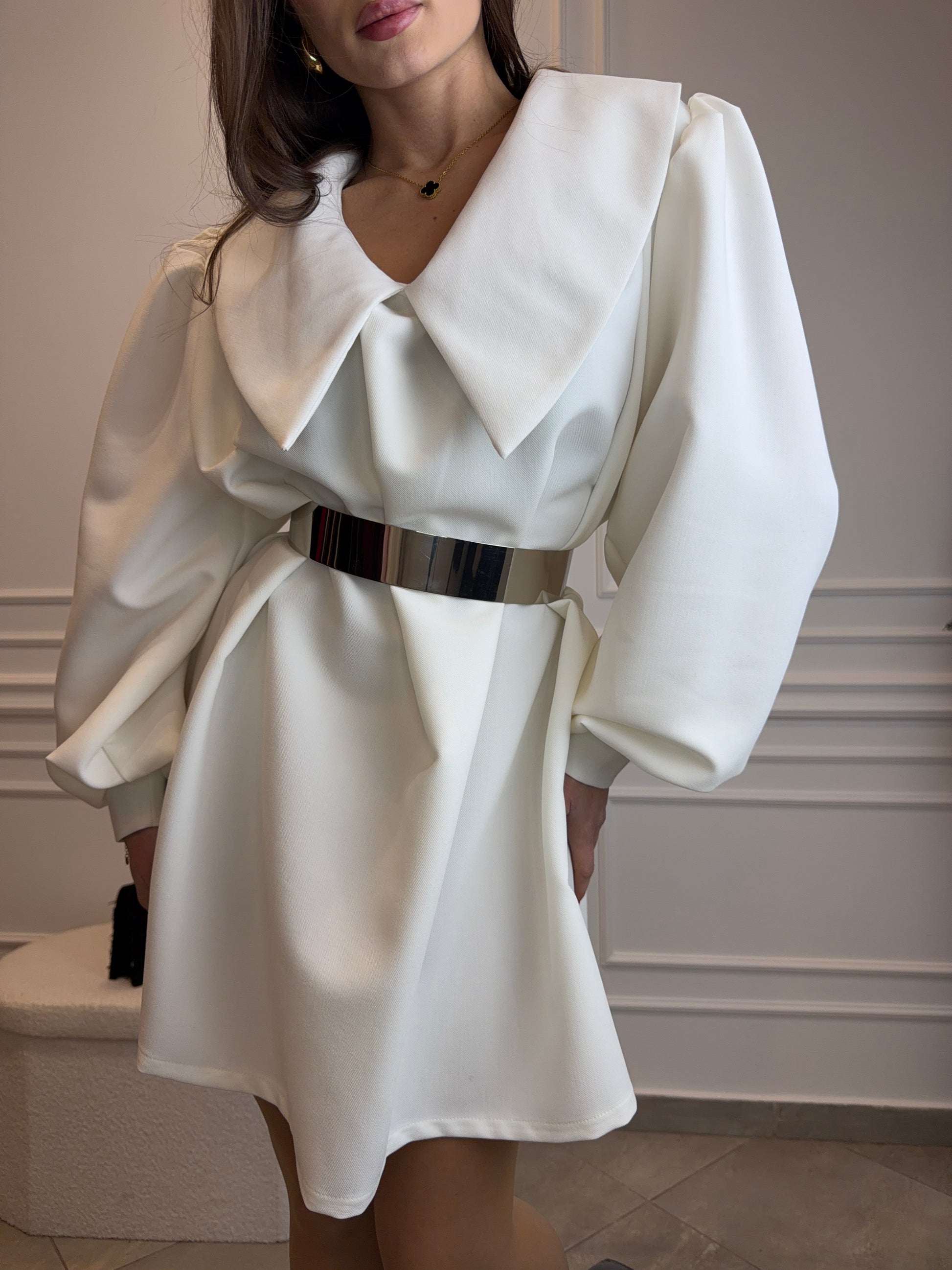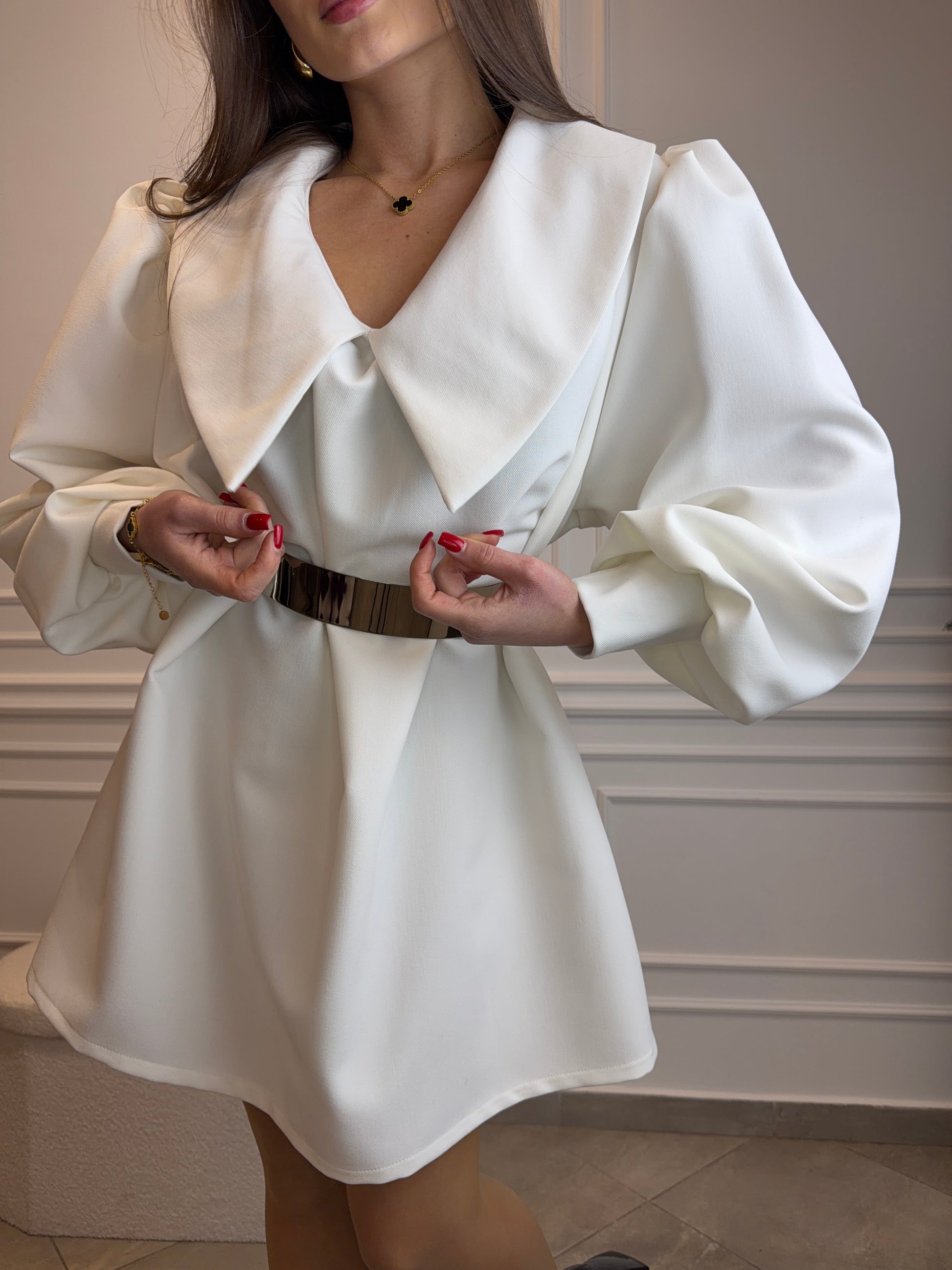 Ta wyjątkowa biała sukienka to połączenie delikatnej elegancji i nowoczesnego stylu. Jej charakterystycznym elementem jest efektowny, szeroki kołnierz, który dodaje całości szyku i sprawia, że stylizacja wyróżnia się na pierwszy rzut oka. Długie, lekko bufiaste rękawy podkreślają kobiecy charakter kreacji, a lekko rozkloszowany dół nadaje lekkości i swobody.