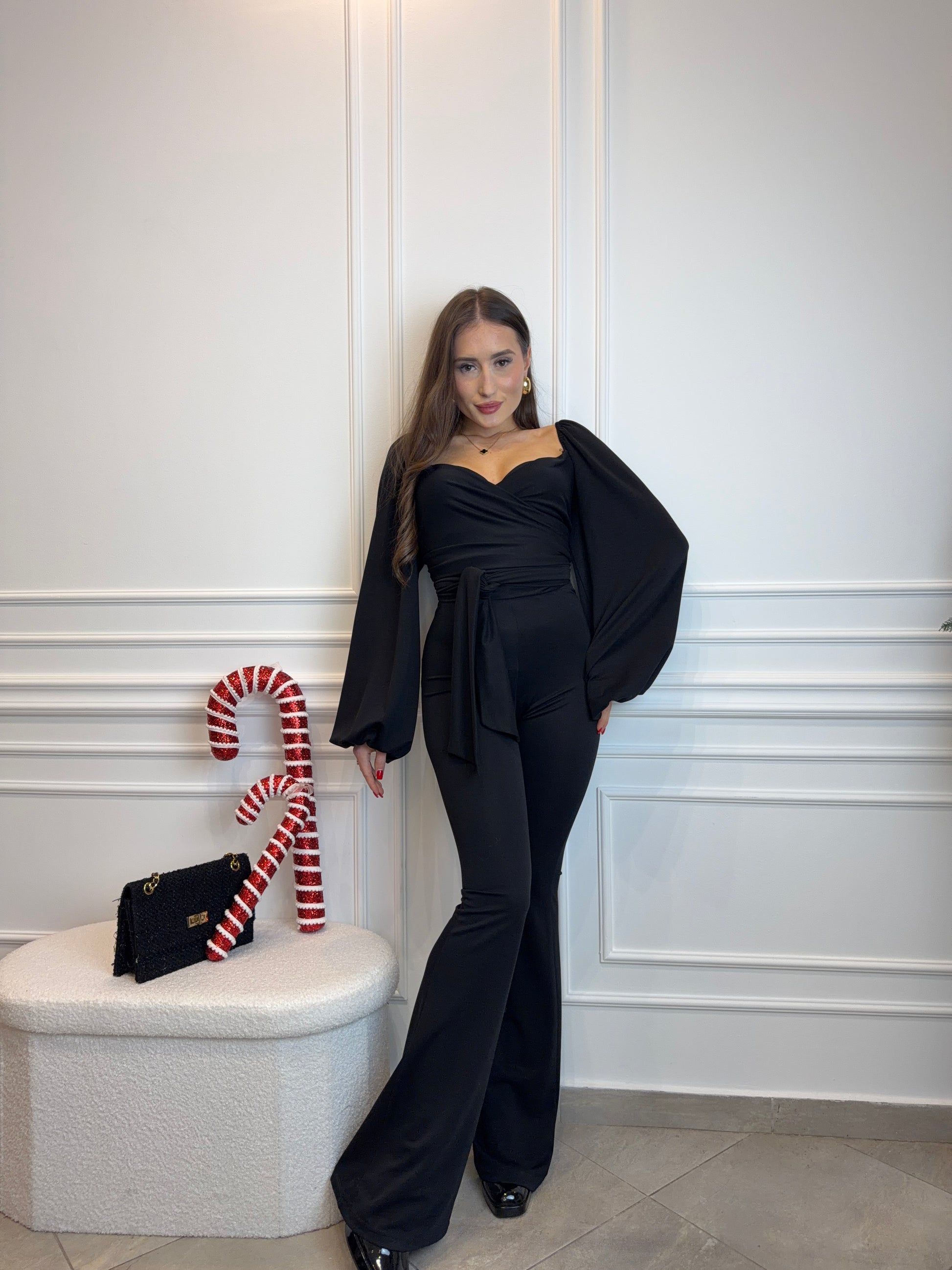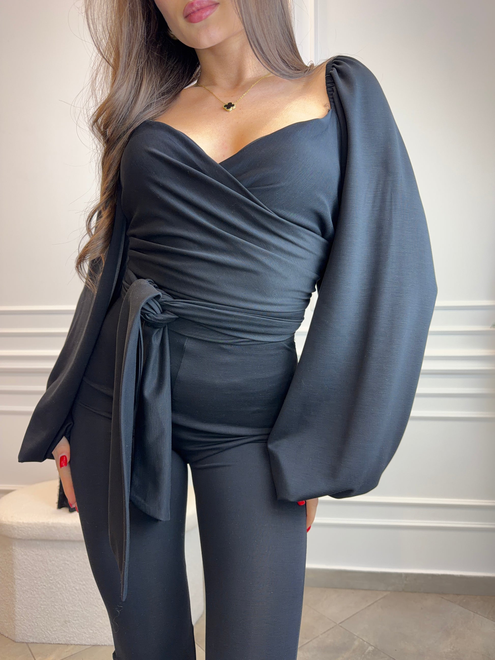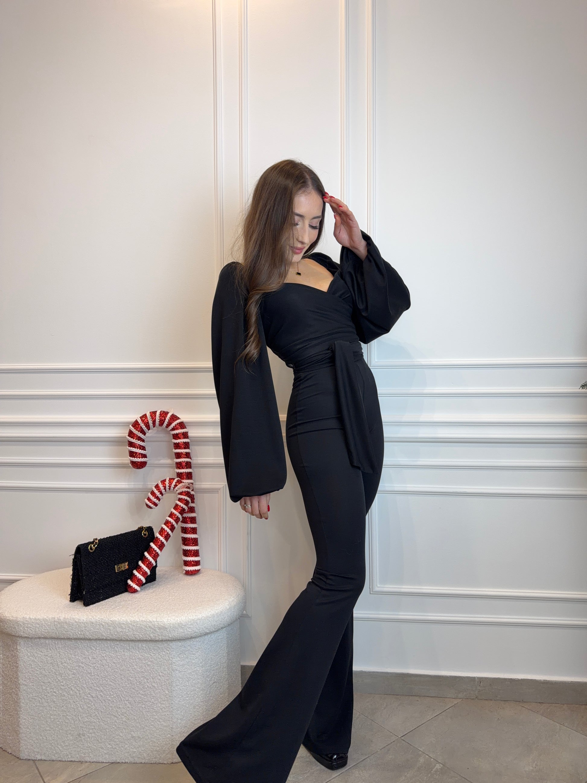 Stylowy, wygodny i ponadczasowy — ten czarny komplet to must-have w szafie każdej kobiety. Kopertowa bluzka pięknie podkreśla dekolt, a lekkie, szerokie rękawy dodają całości elegancji. Wiązanie w talii akcentuje sylwetkę, nadając jej kobiece proporcje.