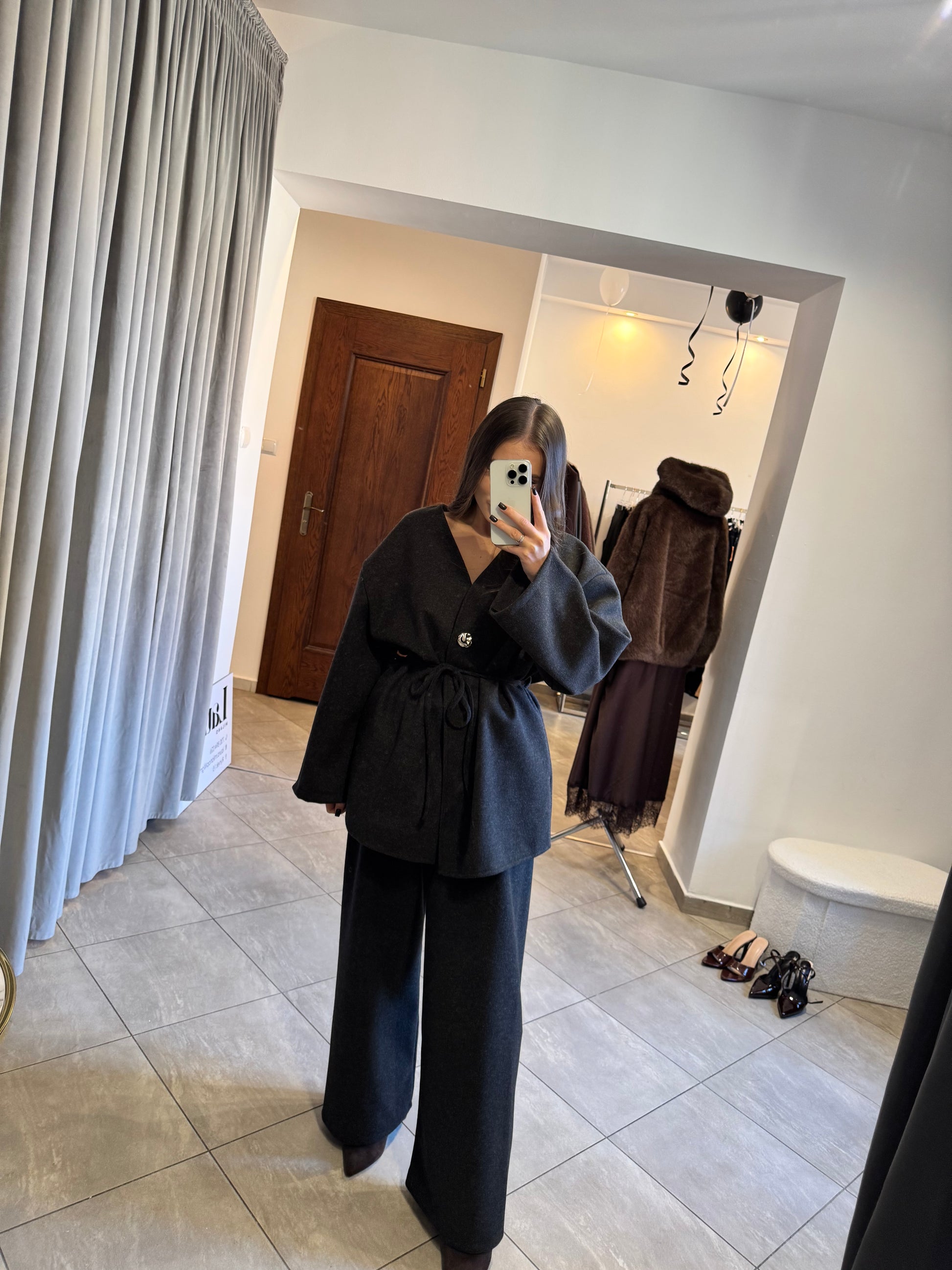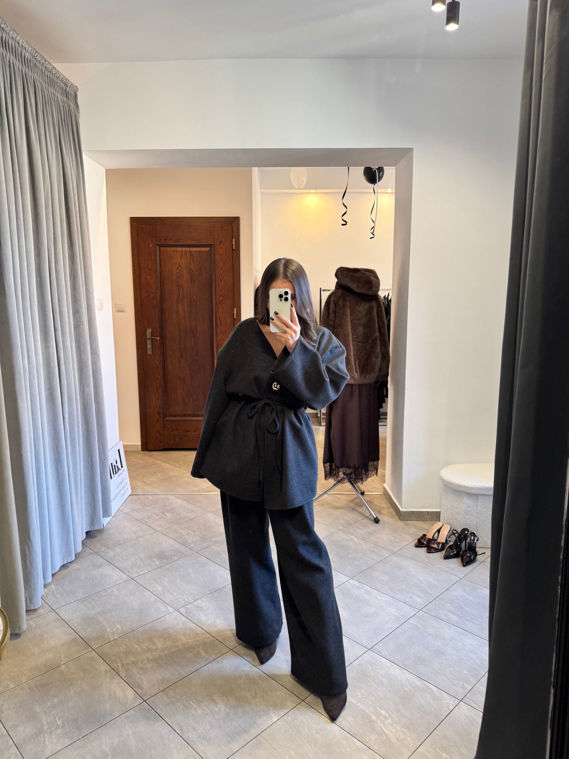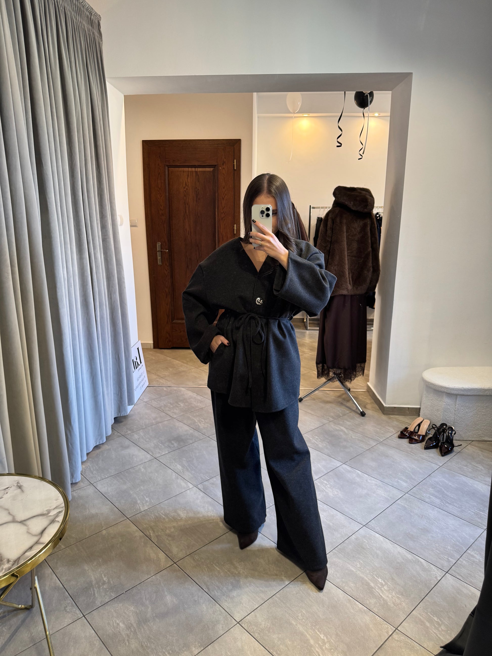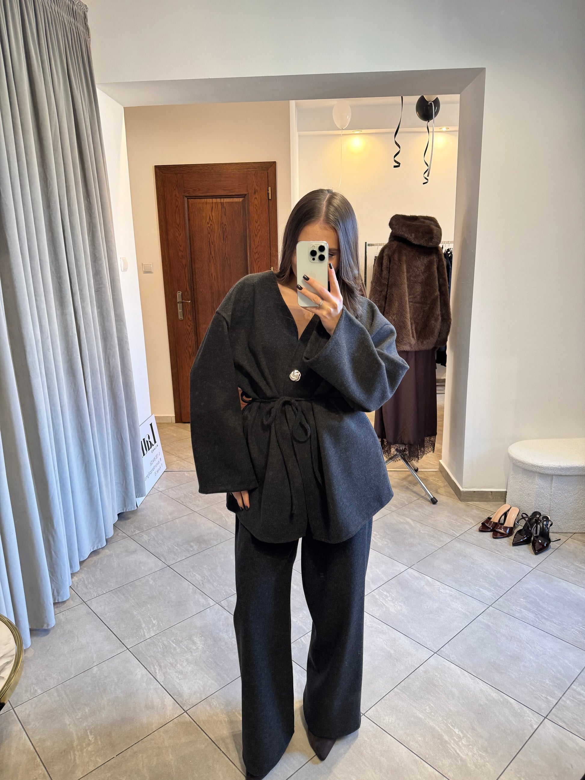 Elegancki komplet oversize z wiązaniem w talii – grafitowy