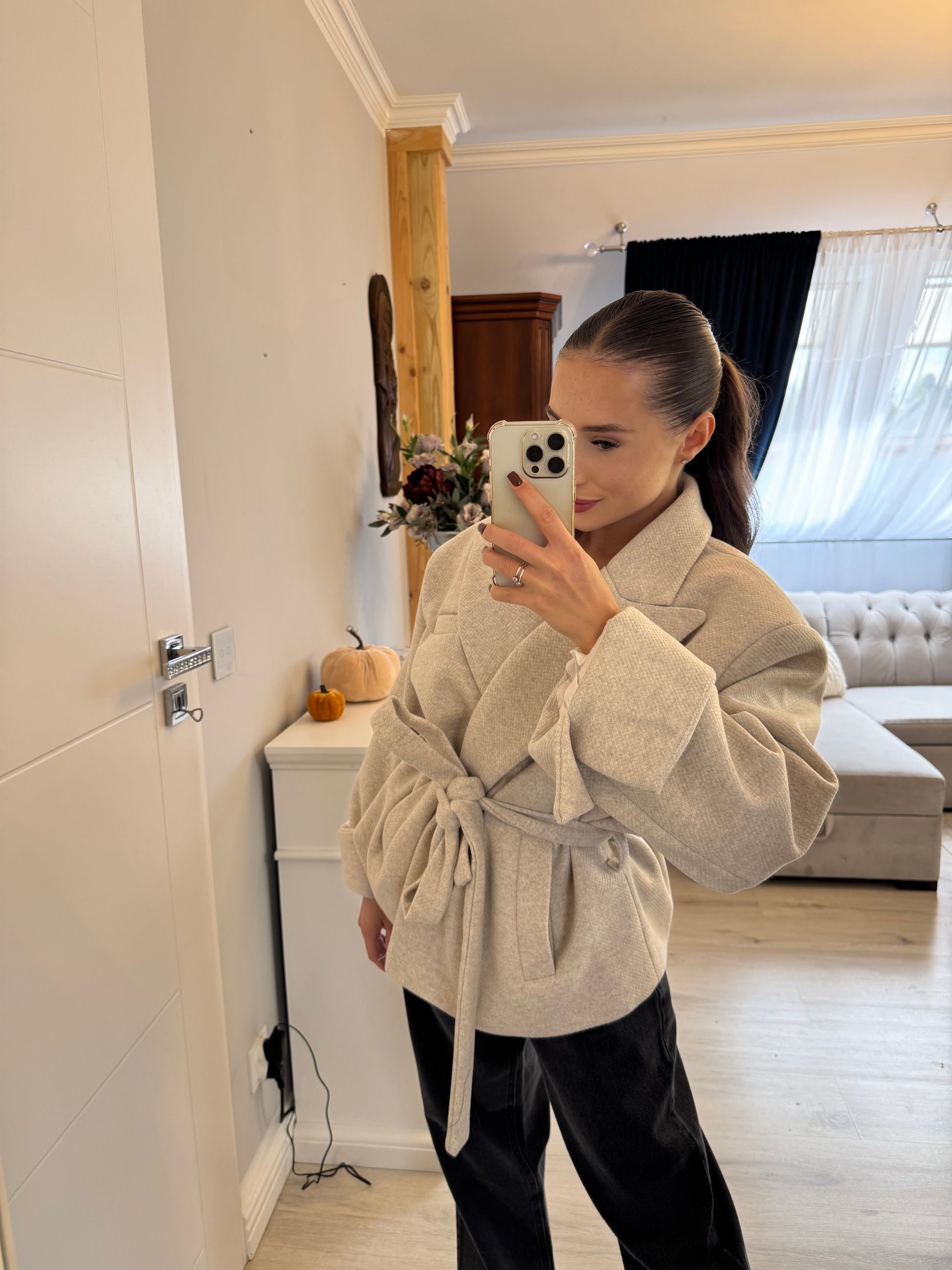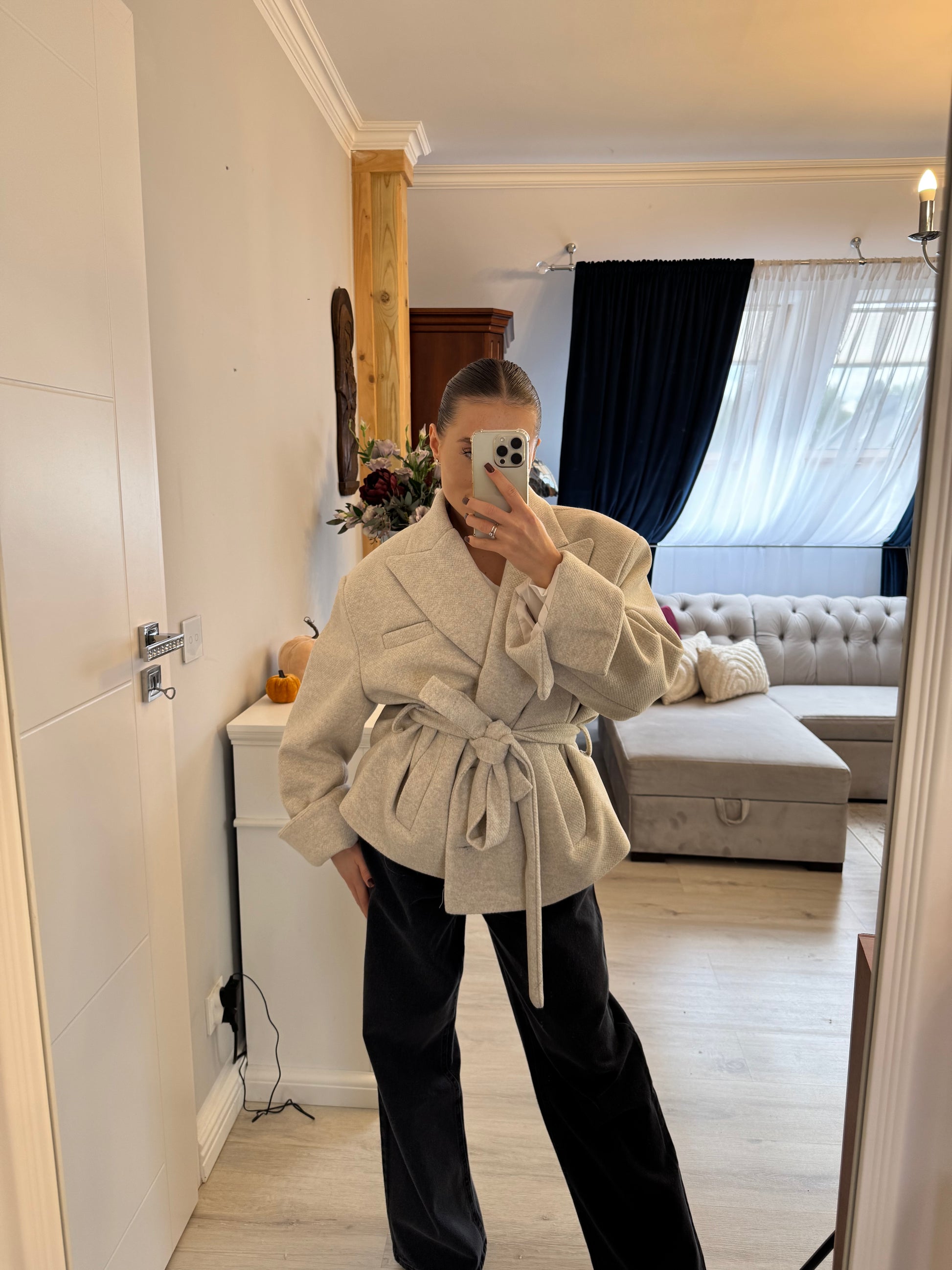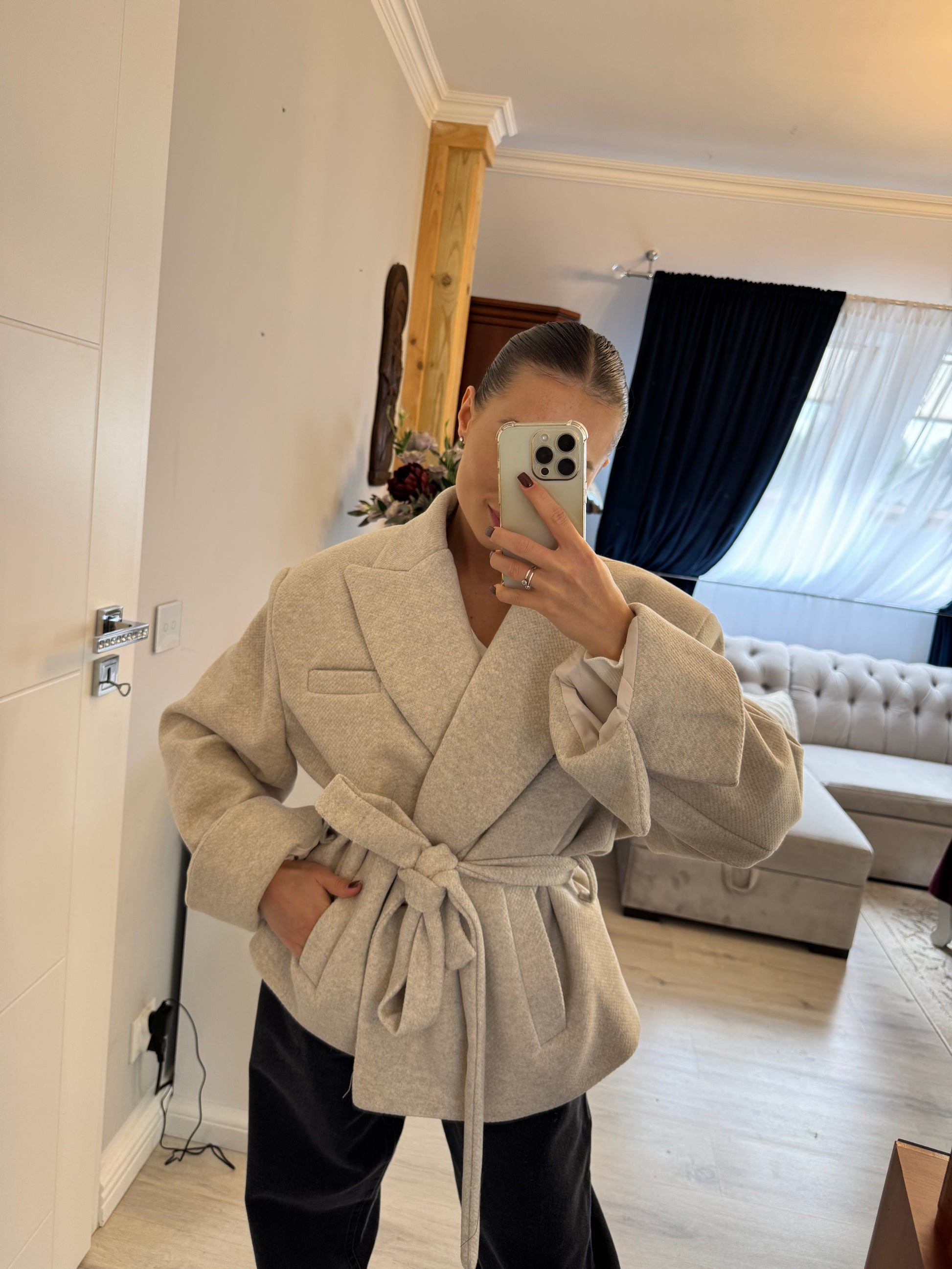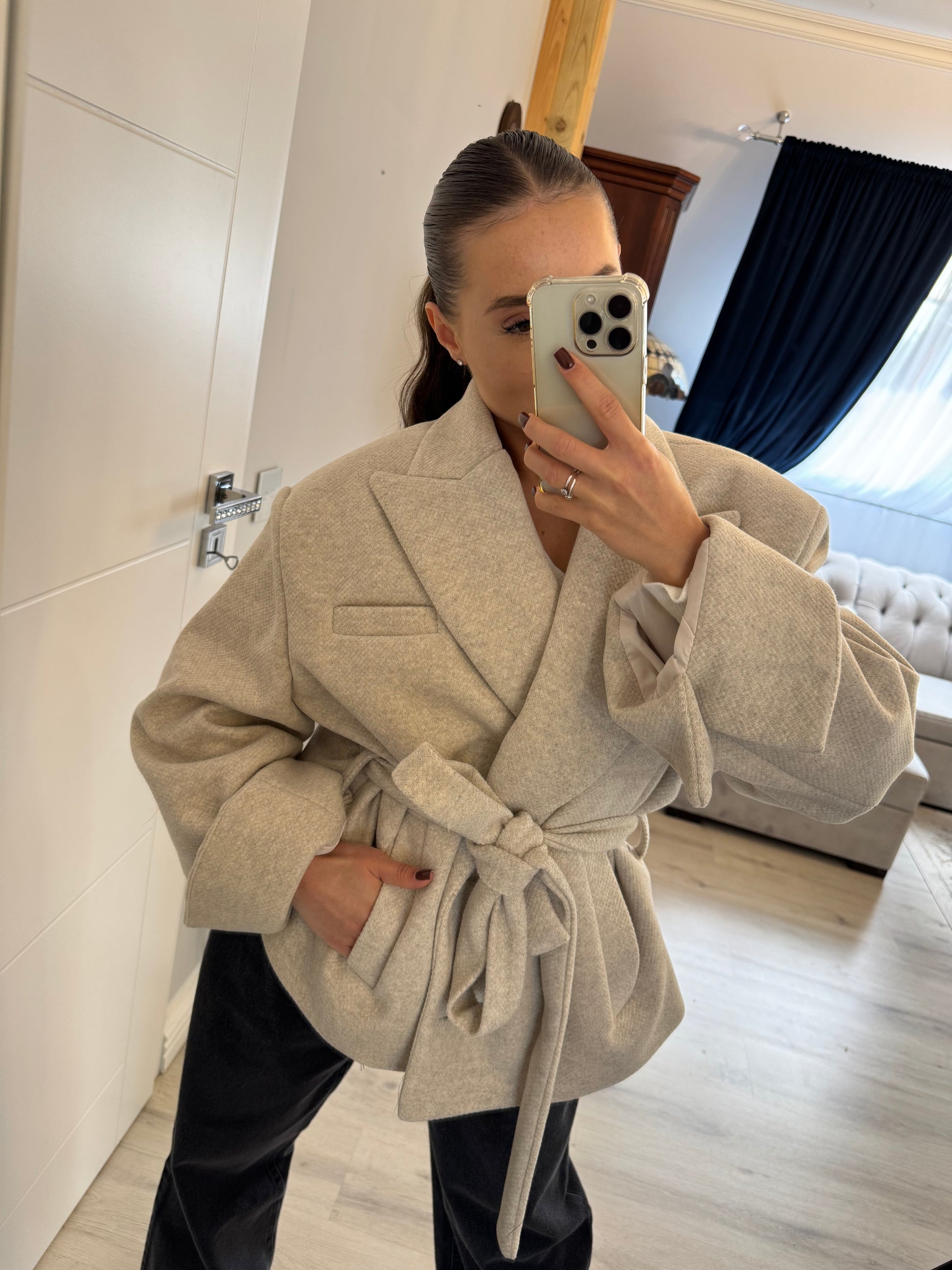Elegancki płaszcz z wiązaniem w talii – kolor jasny szary