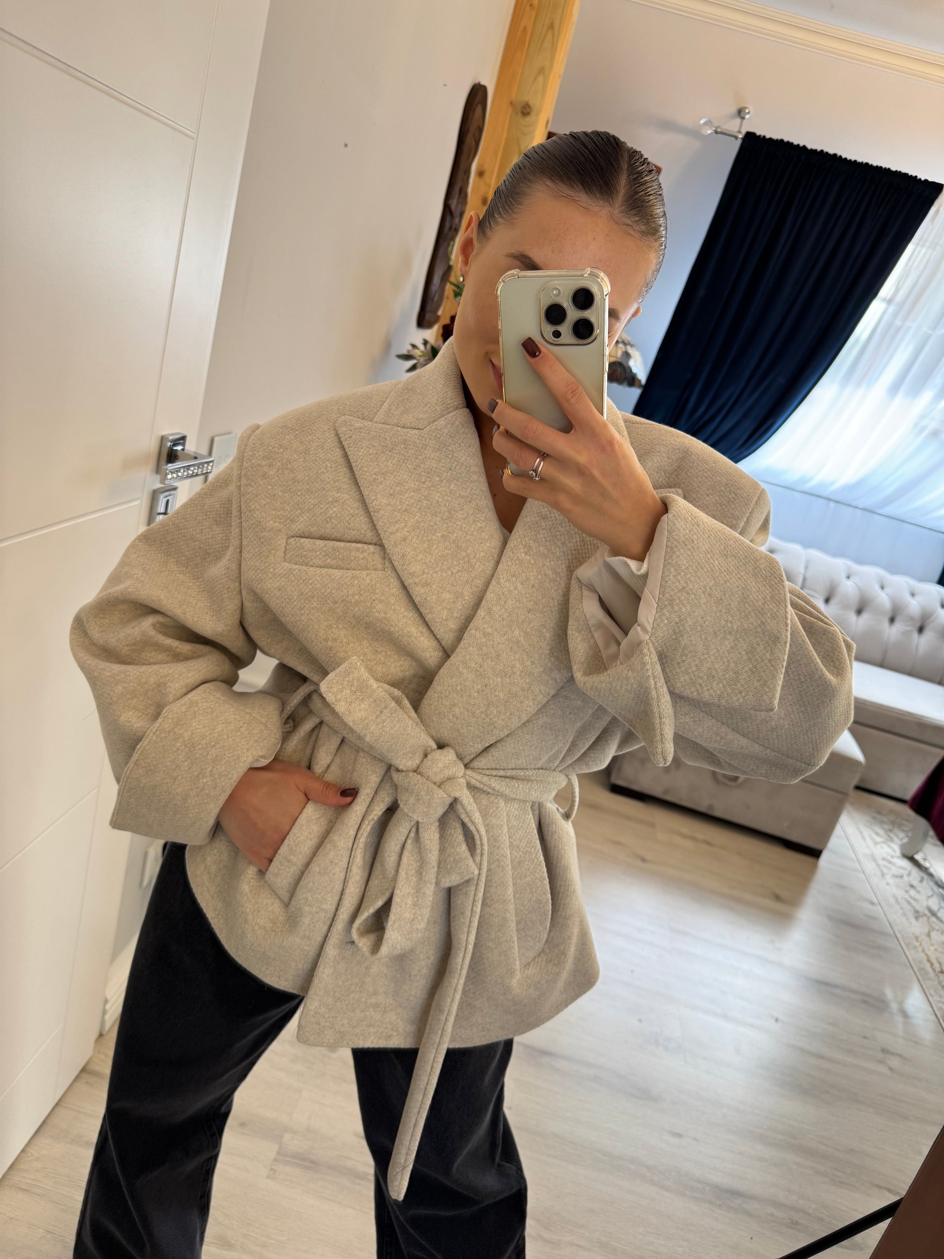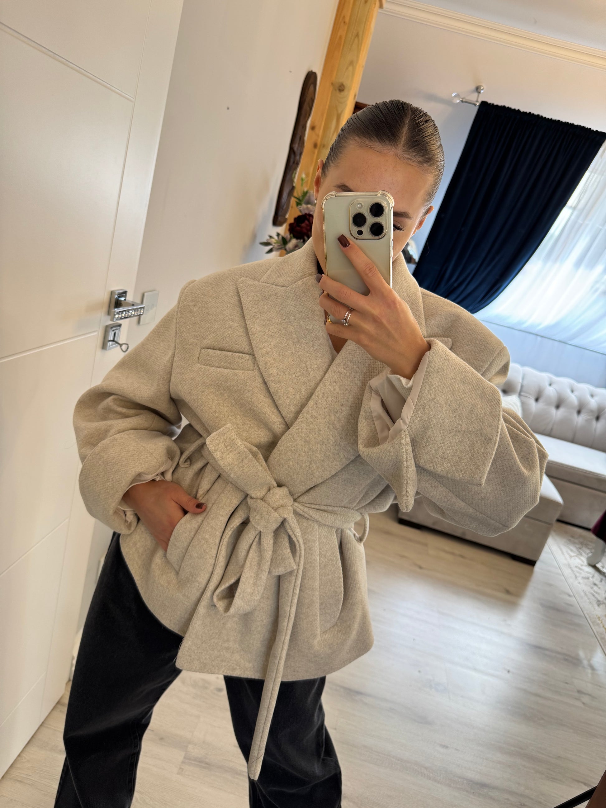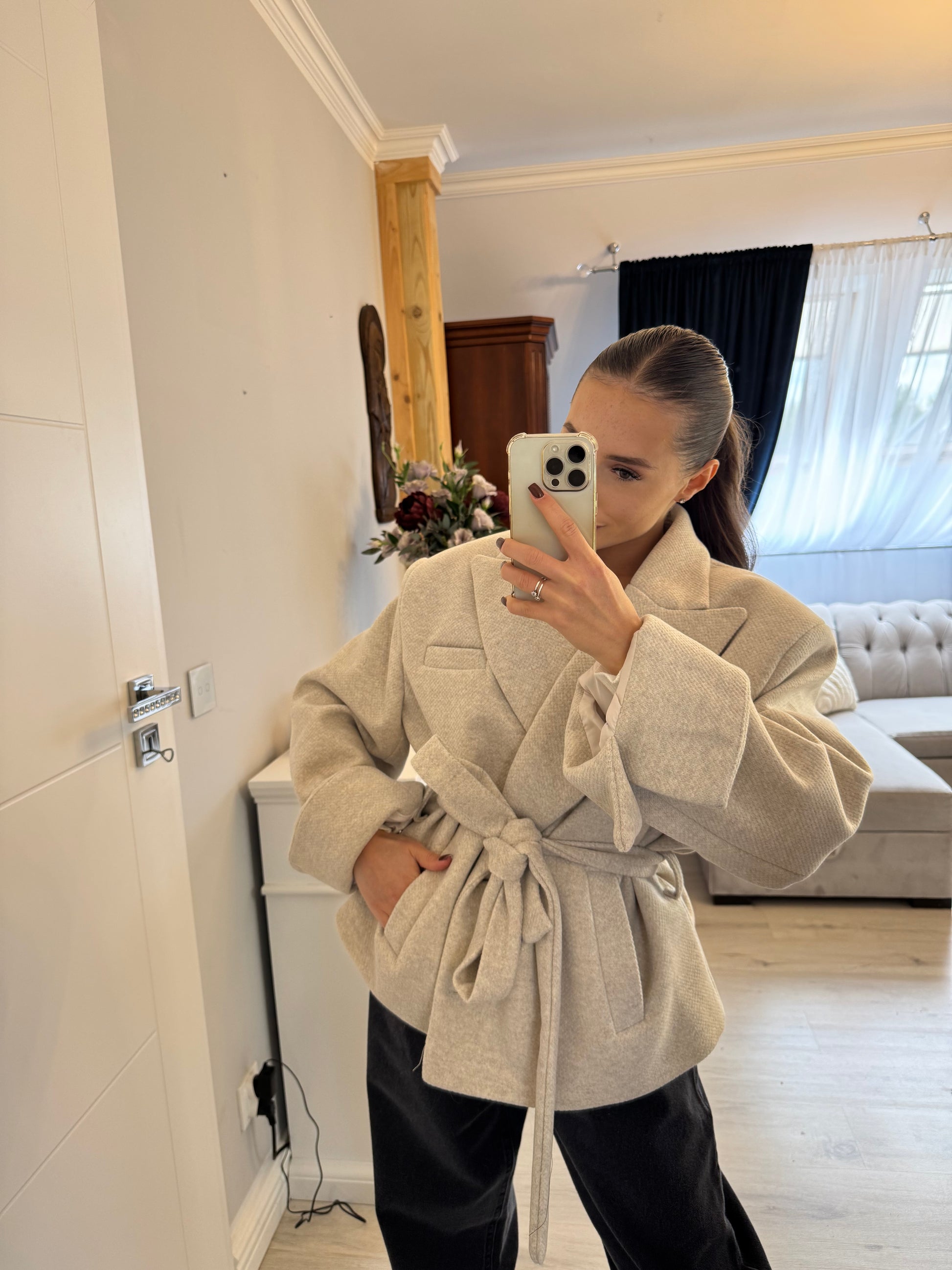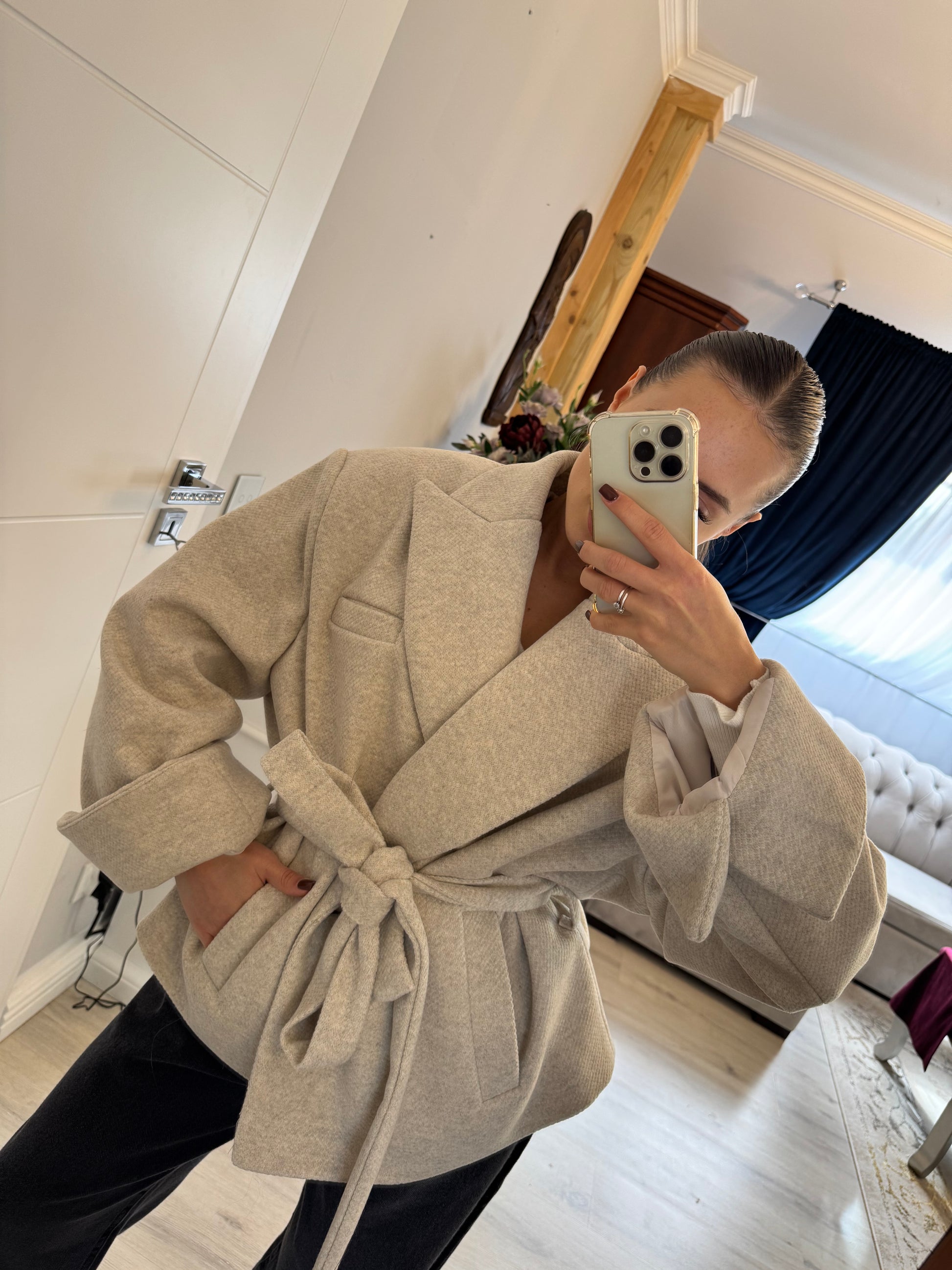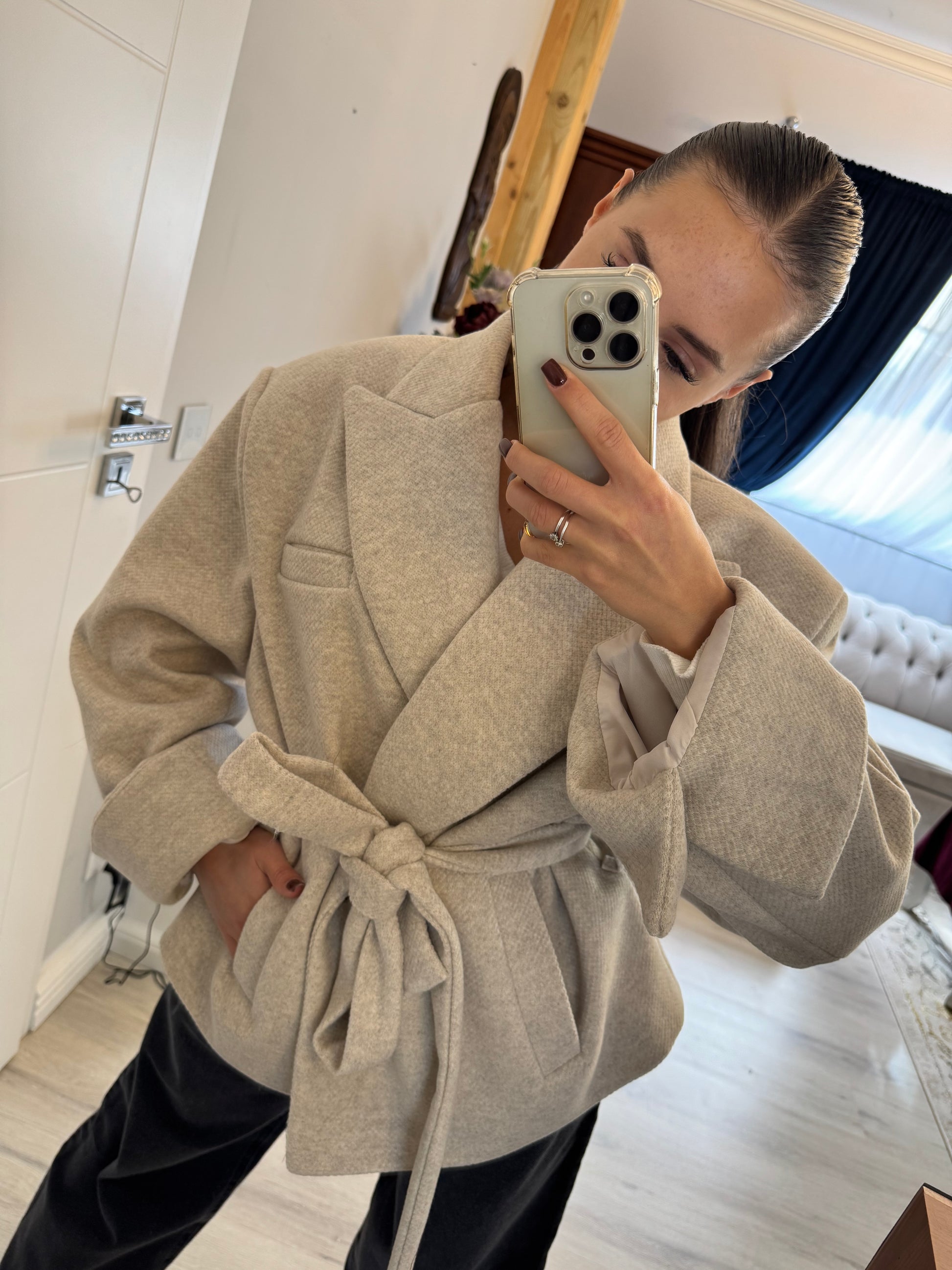 Elegancki płaszcz z wiązaniem w talii – kolor jasny szary