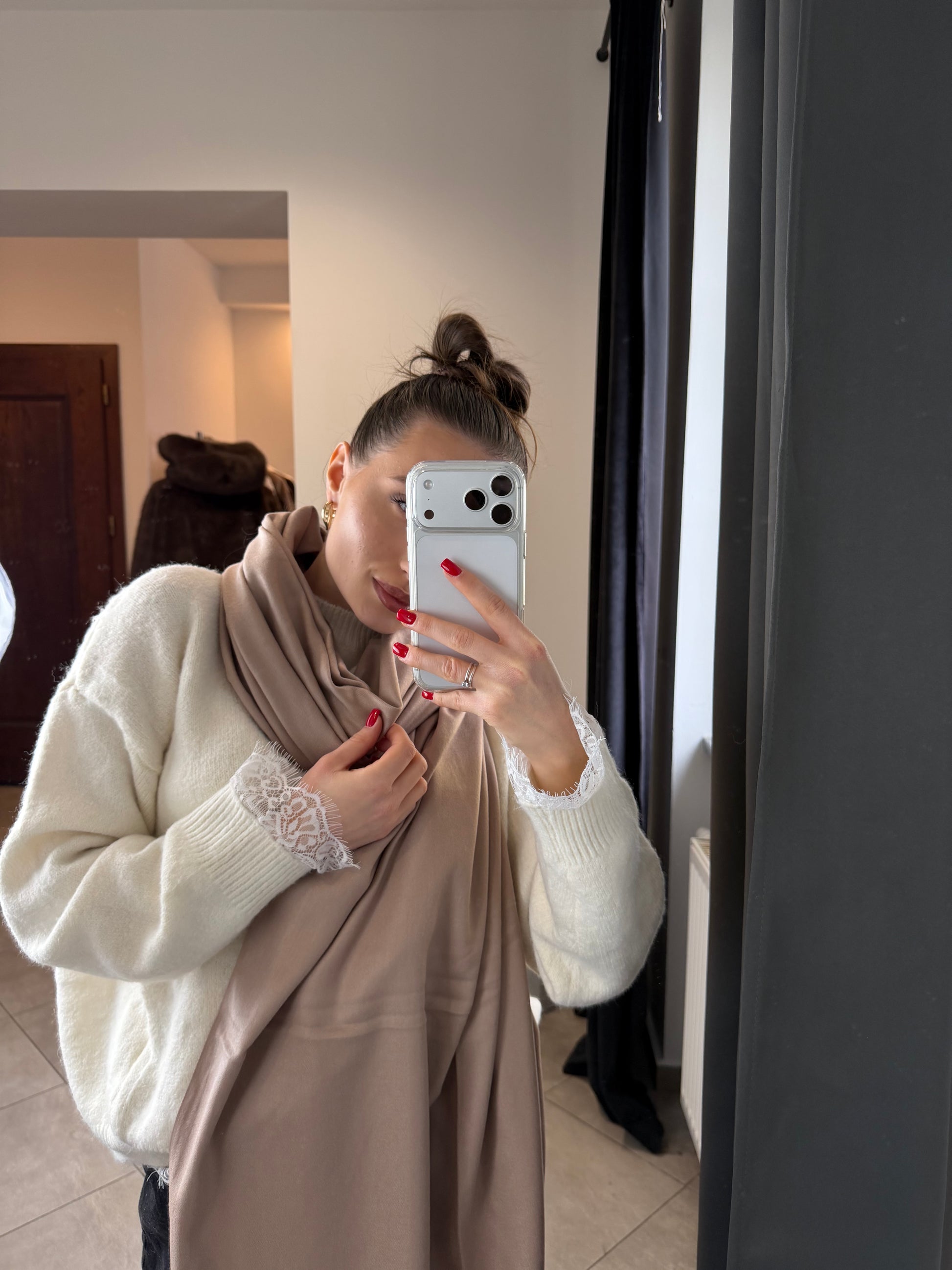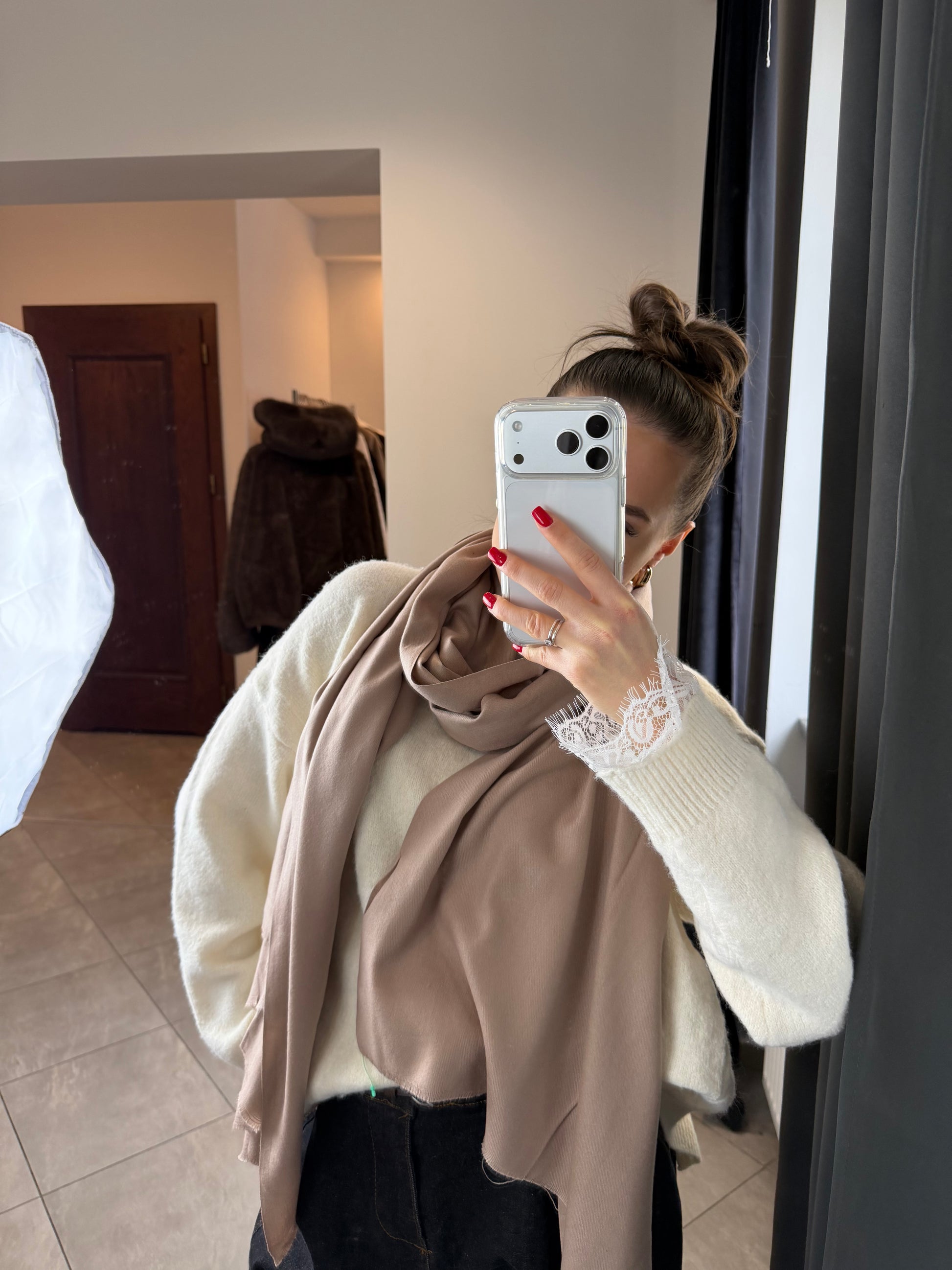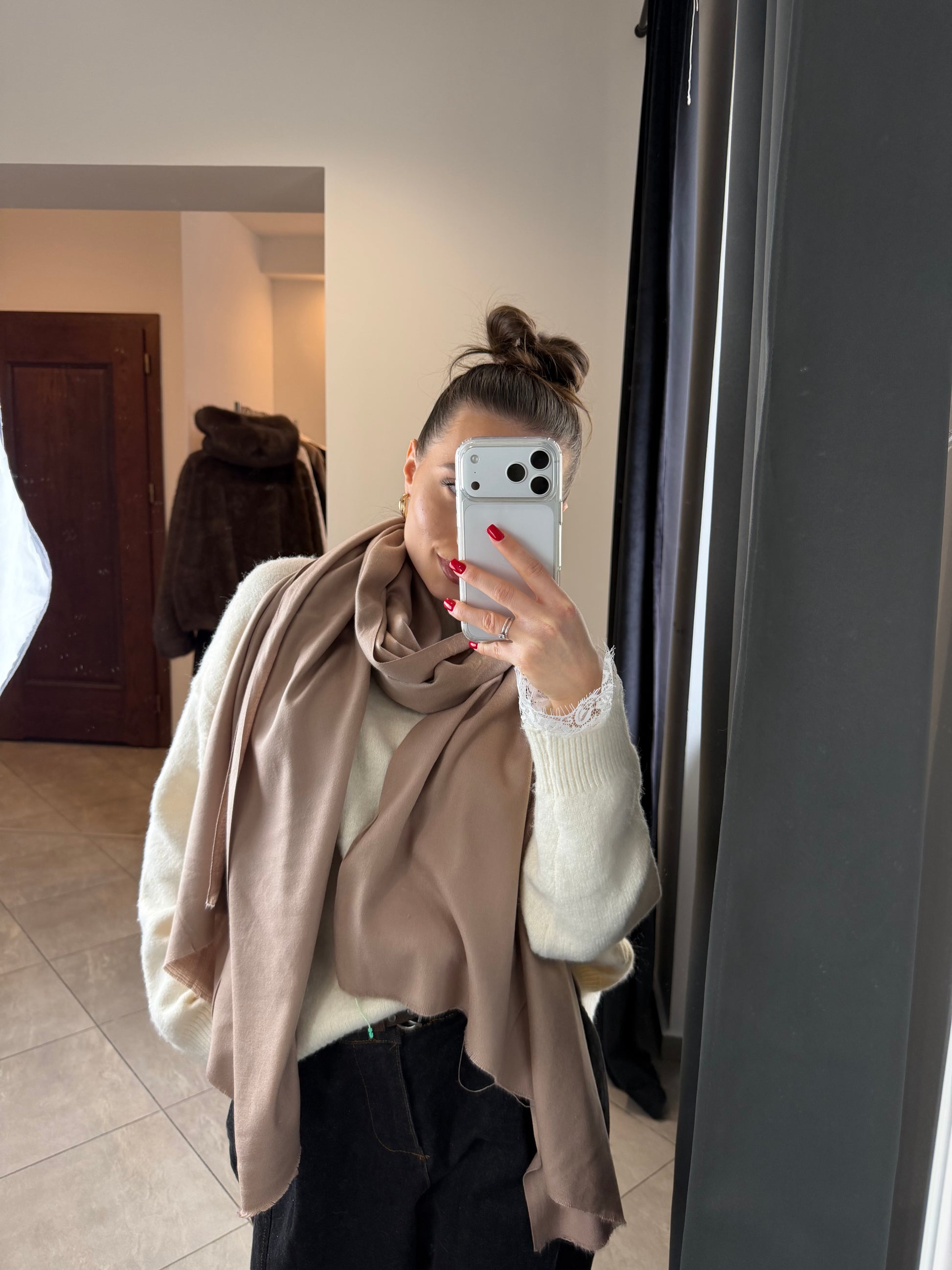 Neutralny odcień nude jest wyjątkowo wdzięczny — pasuje do każdej kolorystyki, dodając stylizacjom lekkości i subtelnej elegancji. Szal nie posiada połysku ani ozdobnych detali, dzięki czemu pozostaje czysty w formie, klasyczny i niezwykle stylowy.
