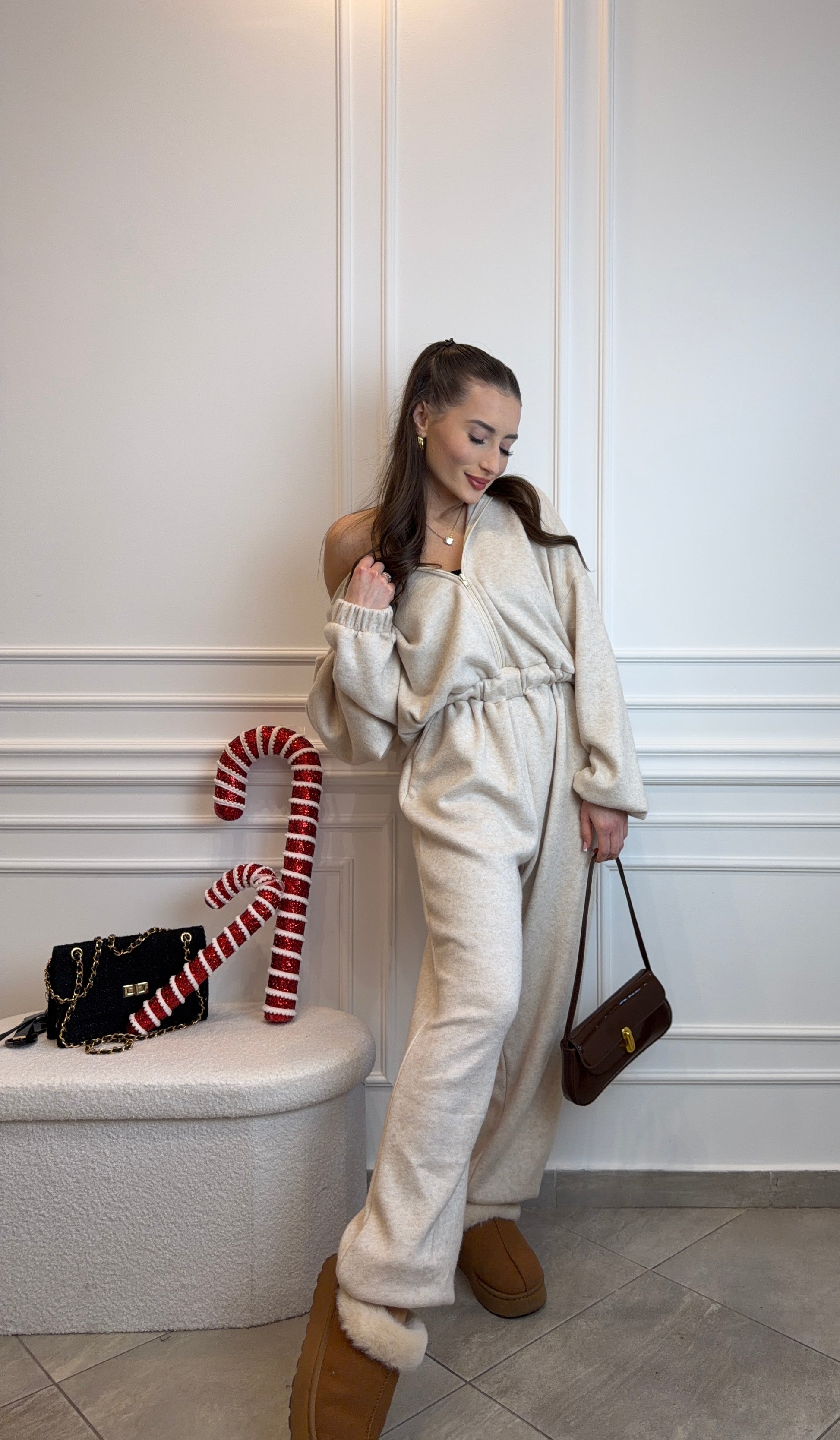 Kombinezon zapinany jest na zamek z przodu, co umożliwia regulację dekoltu i noszenie go na różne sposoby – klasycznie lub z subtelnie odsłoniętym ramieniem. Elastyczne marszczenie w talii pięknie podkreśla sylwetkę, a luźniejszy krój nogawek zapewnia swobodę ruchów. Długie, lekko bufiaste rękawy zakończone ściągaczem dodają całości modnego charakteru.