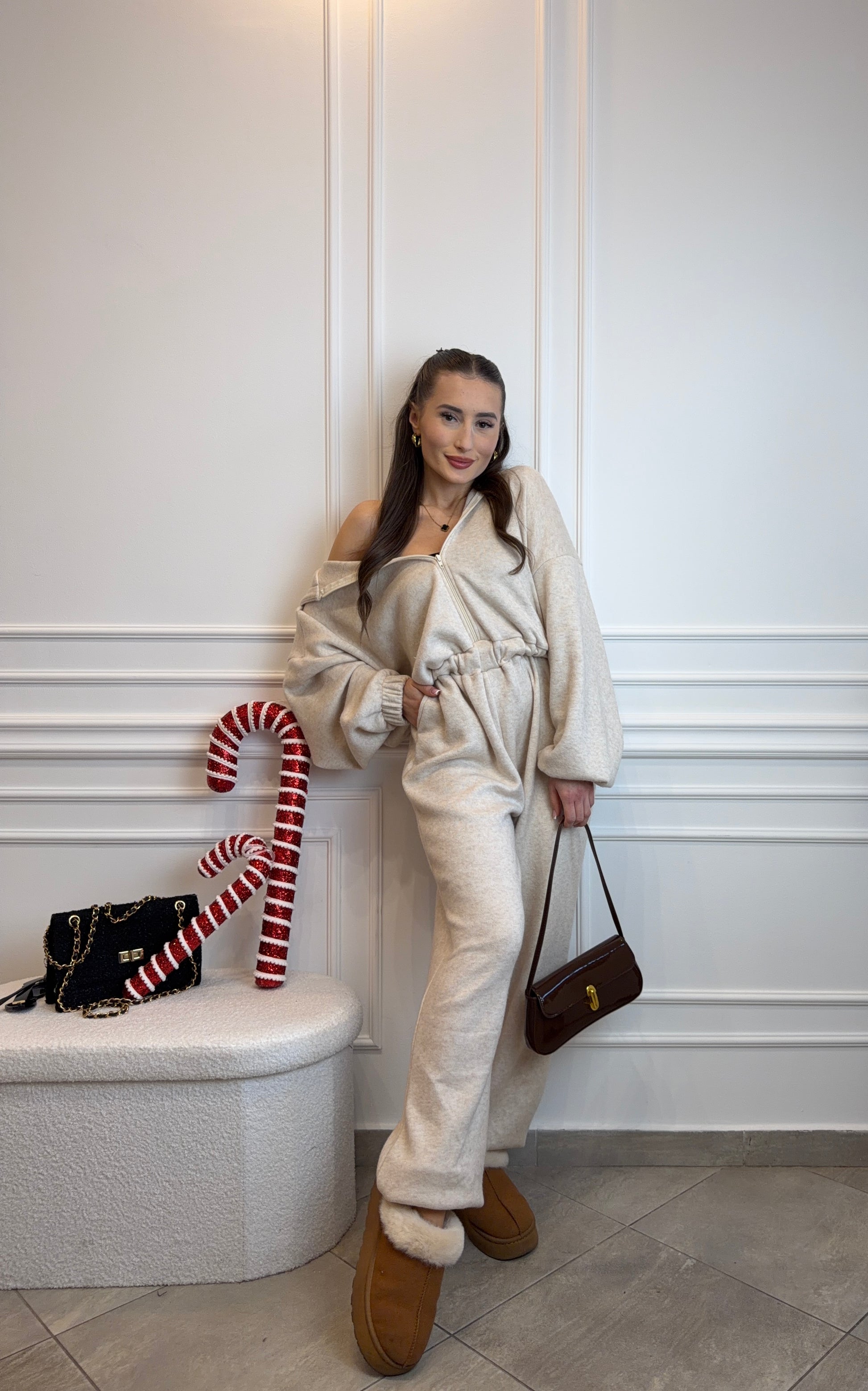 Kolor jasnego beżu nadaje kombinezonowi uniwersalności i elegancji, dzięki czemu łatwo zestawić go z botkami, śniegowcami lub sneakersami.