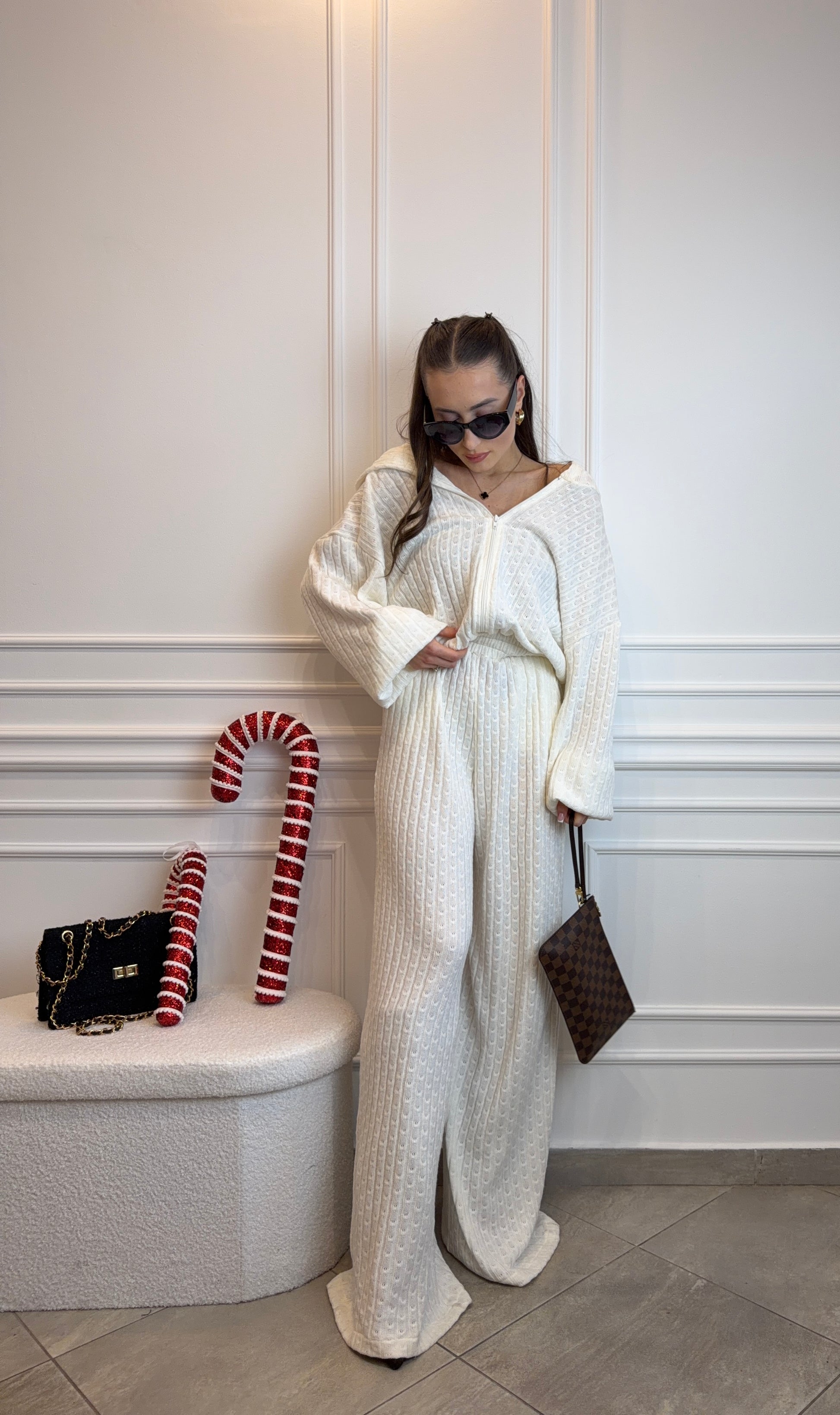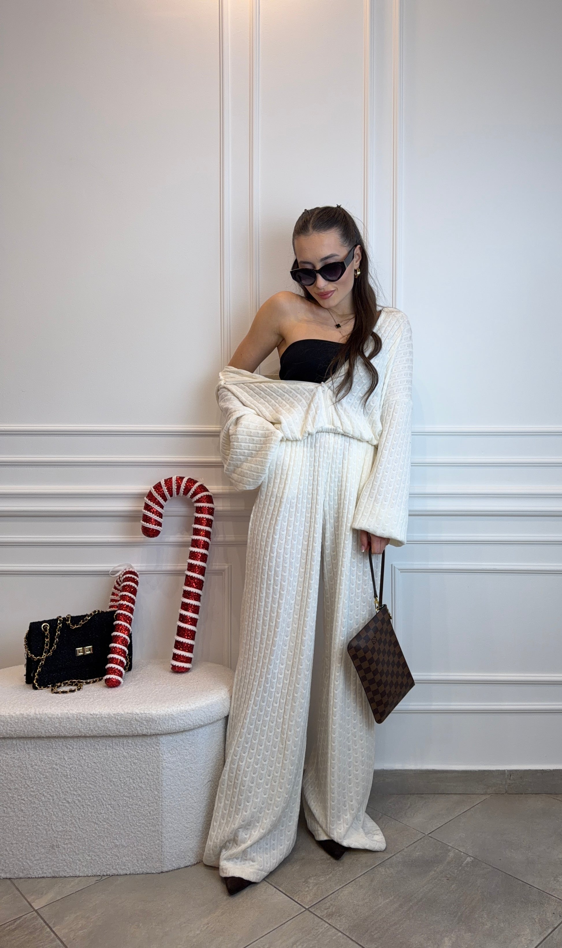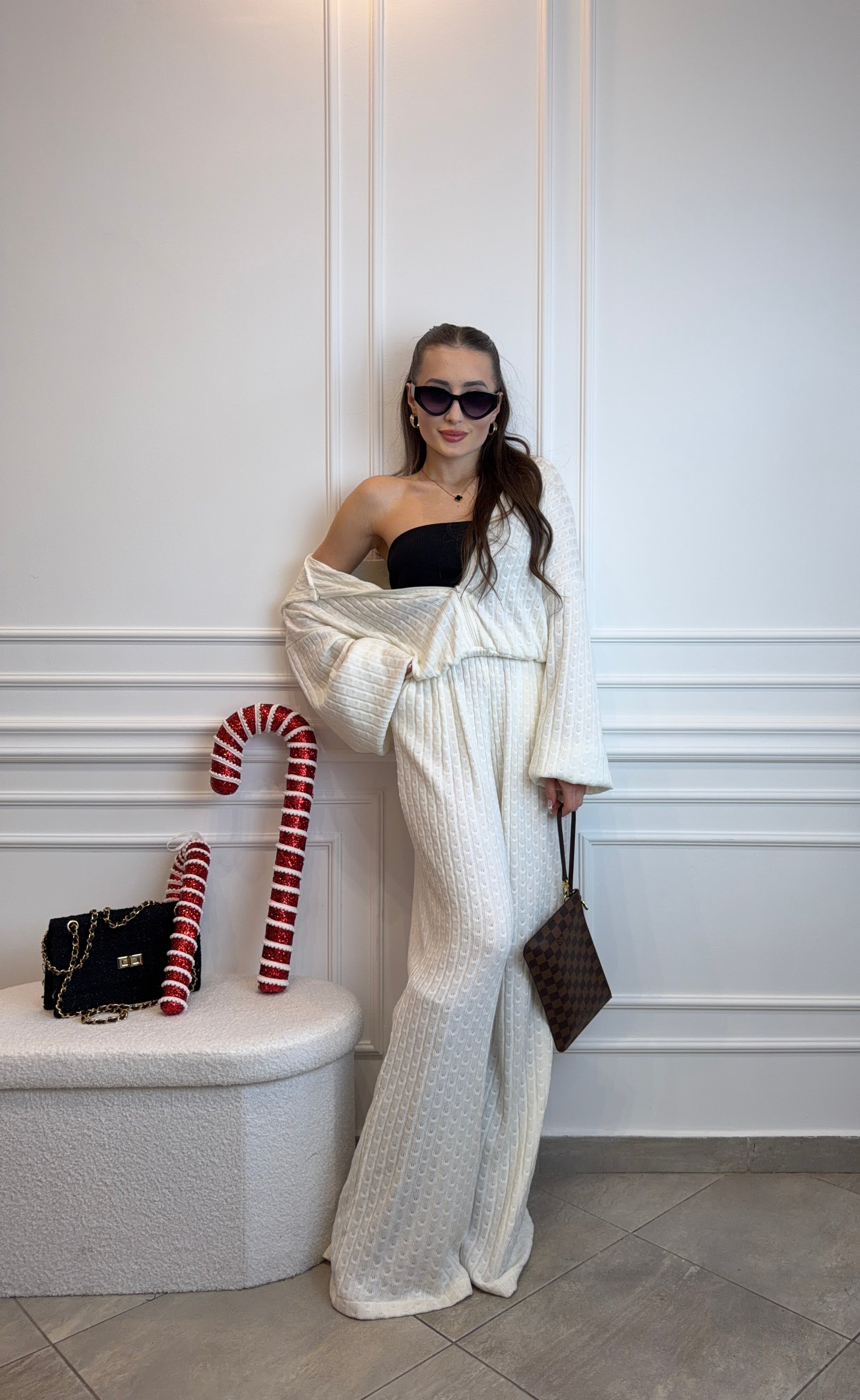 Elegancki i niezwykle stylowy kombinezon wykonany z miękkiej, przyjemnej w dotyku dzianiny o efektownym warkoczowym splocie. Model łączy w sobie komfort noszenia z wyrafinowanym wyglądem, dzięki czemu doskonale sprawdzi się zarówno na co dzień, jak i w bardziej dopracowanych stylizacjach.