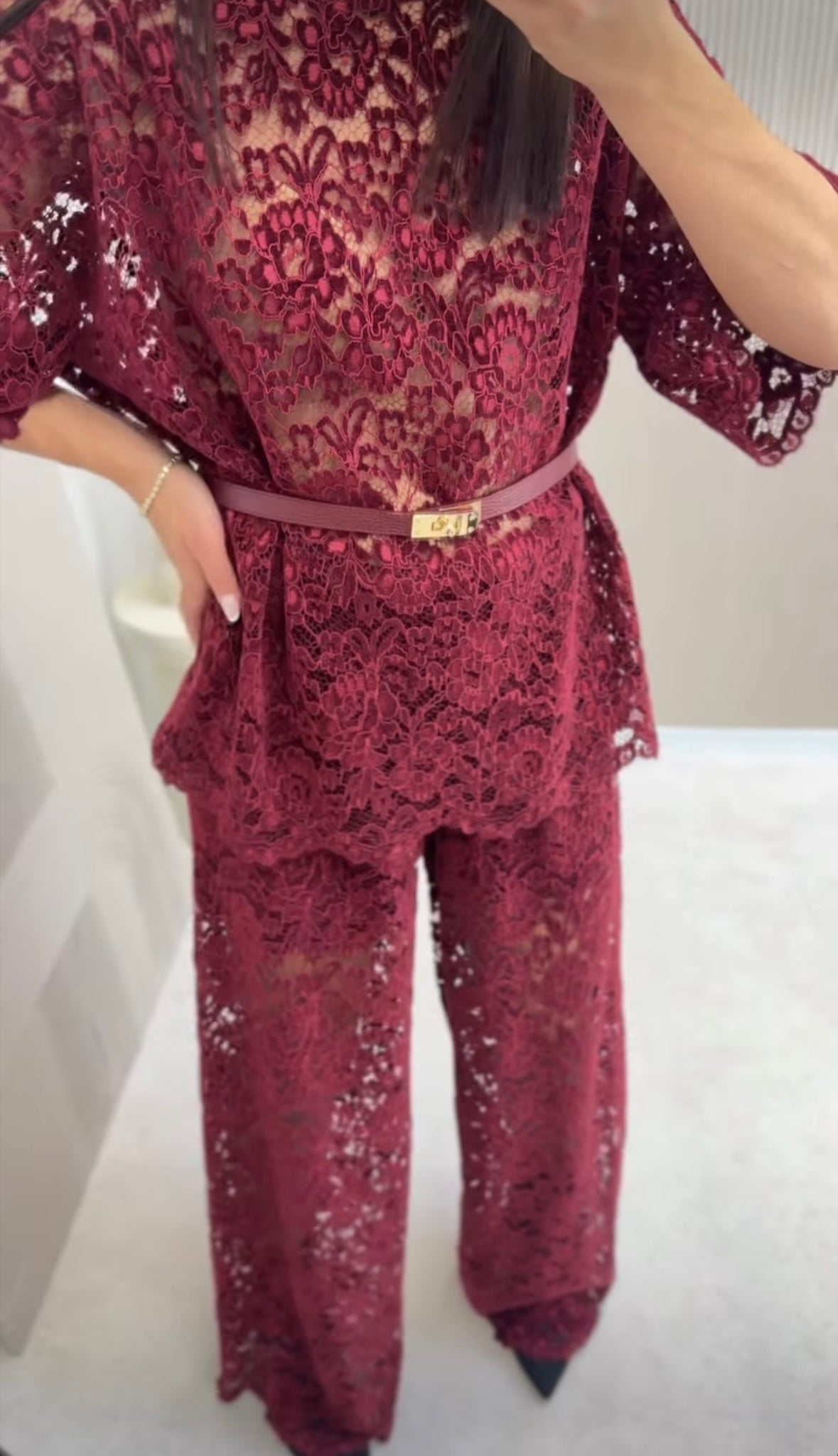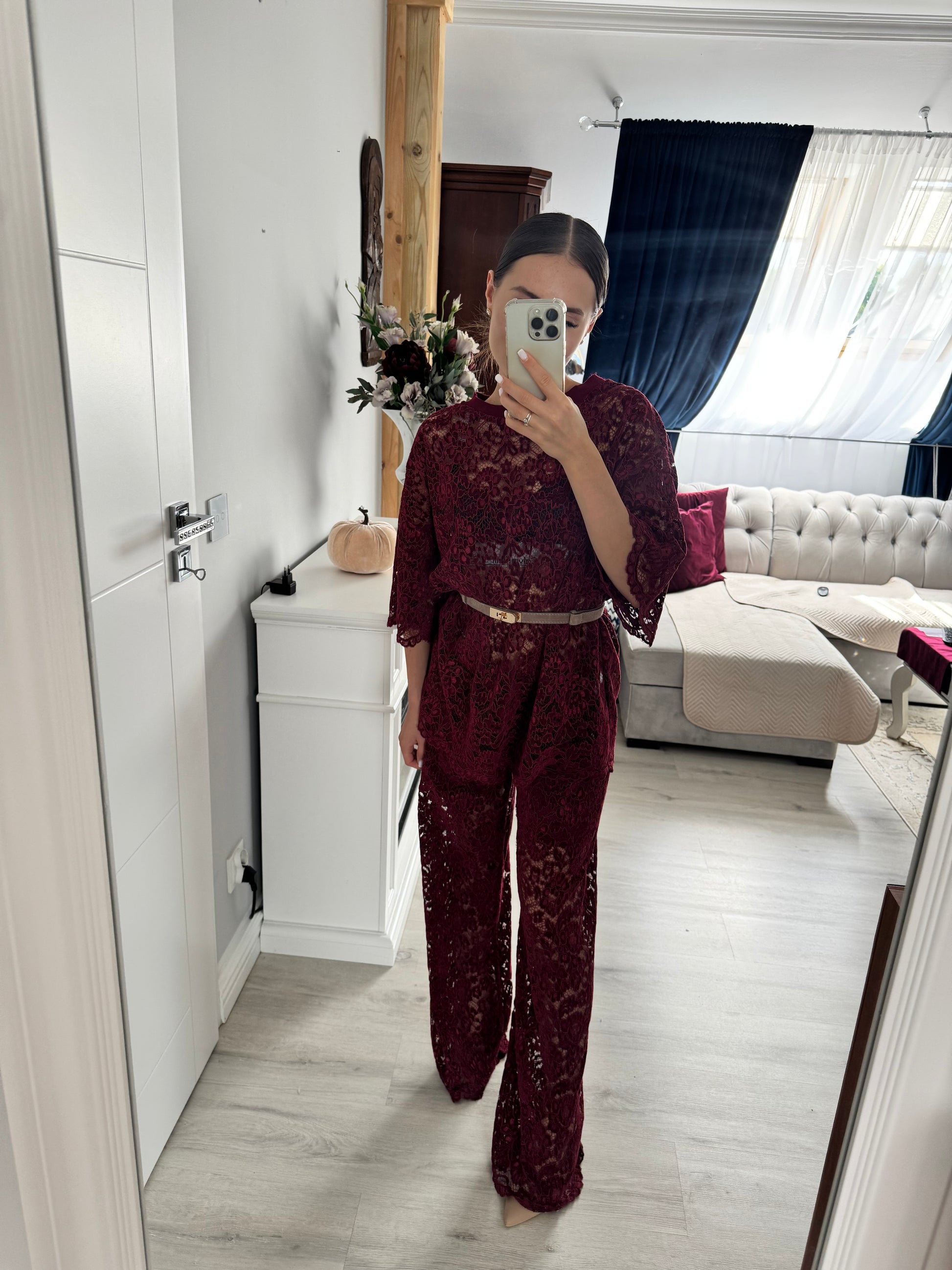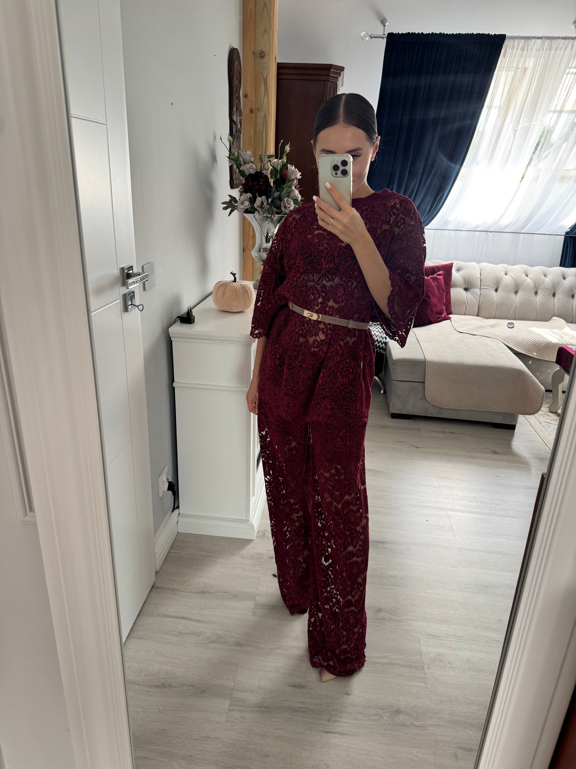 Wyjątkowy komplet wykonany z eleganckiej welurowej koronki w głębokim, bordowym kolorze. Materiał łączy w sobie subtelną przejrzystość z aksamitnym połyskiem weluru, co sprawia, że całość prezentuje się niezwykle szykownie i kobieco.