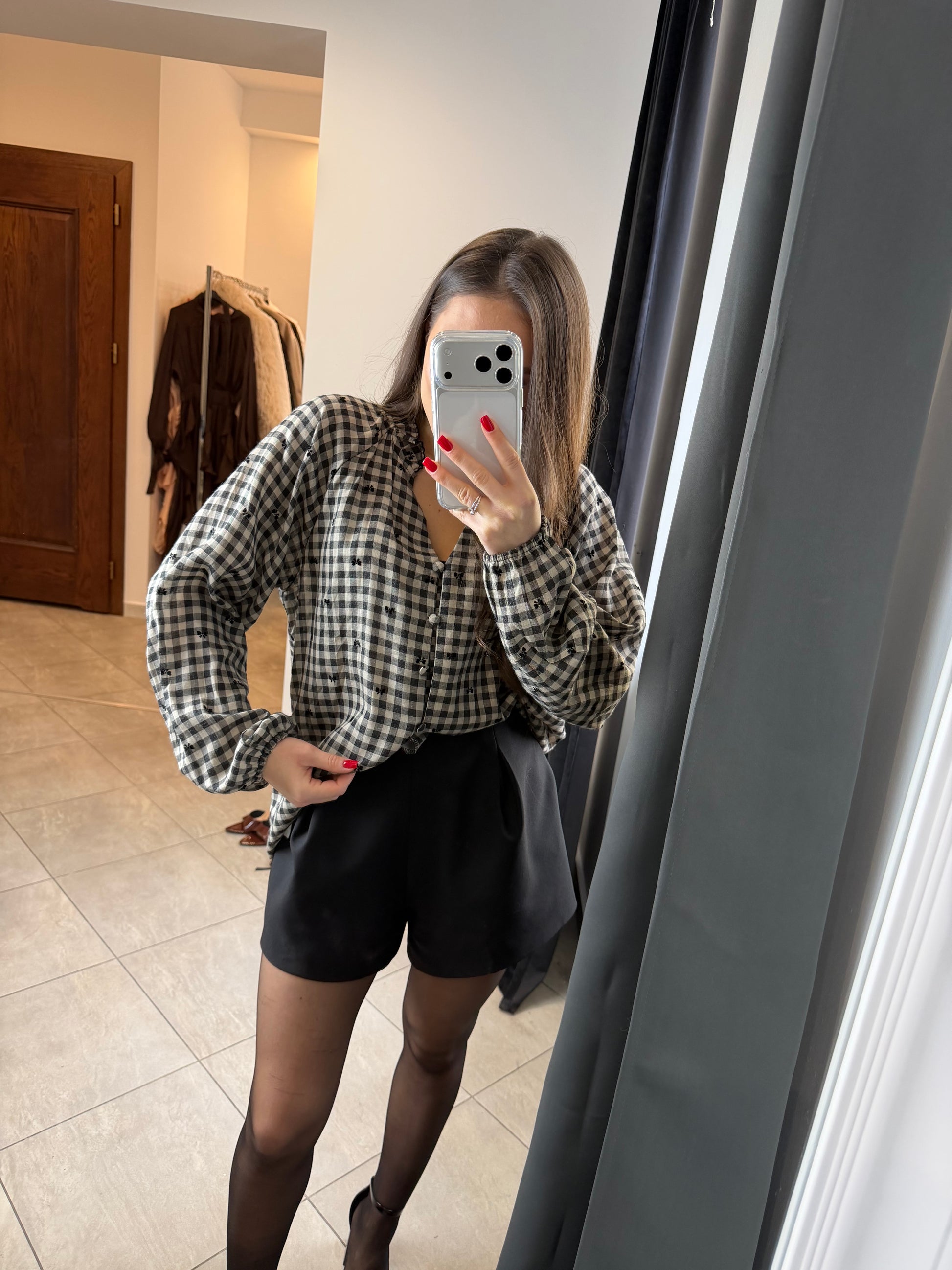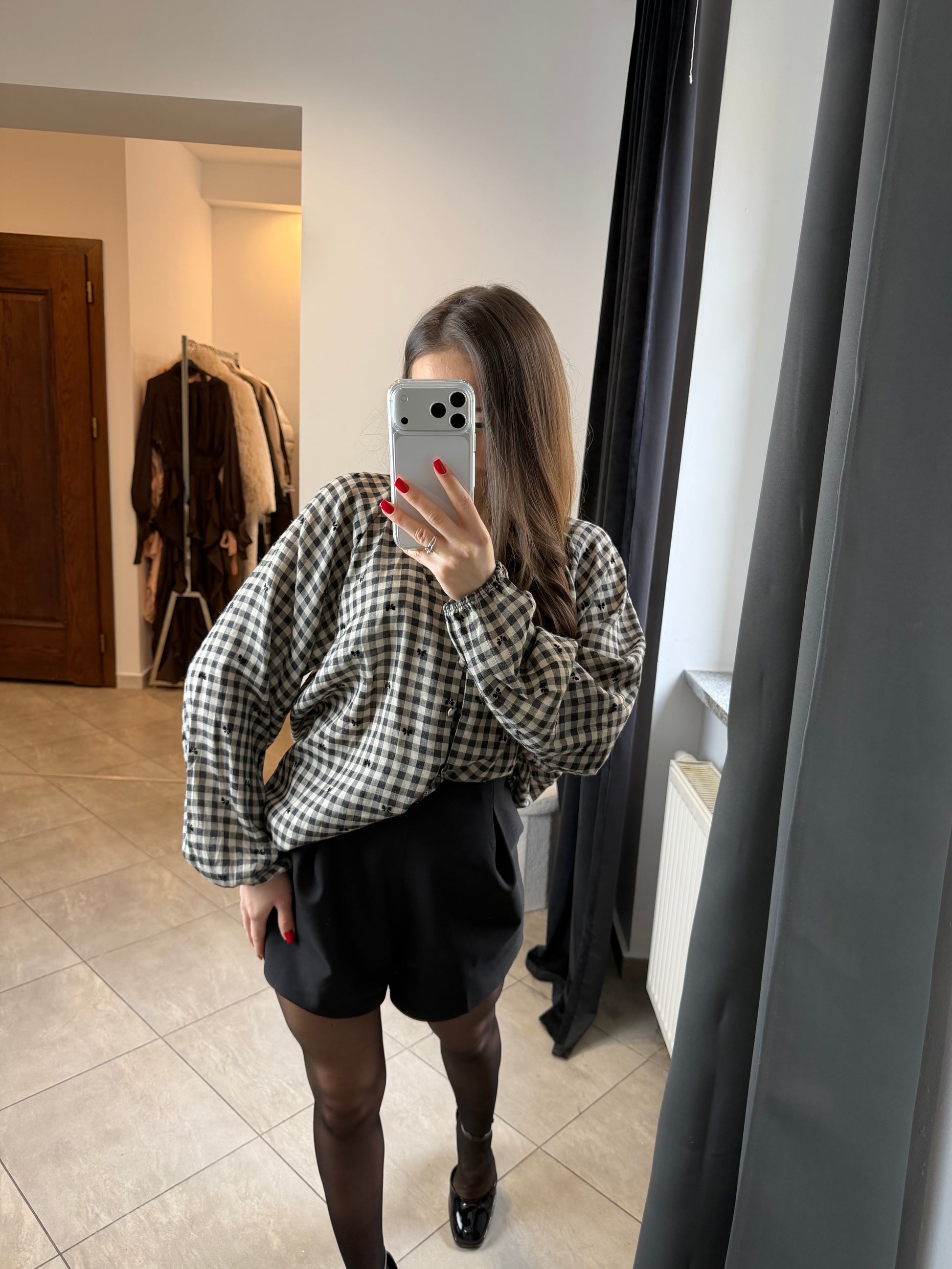Klasyczna koszula w szaro-czarną kratę, wykonana z miękkiego i komfortowego materiału, który świetnie układa się na sylwetce. Delikatnie luźny krój zapewnia swobodę ruchów, a długie rękawy zakończone mankietami dodają całości eleganckiego, dopracowanego charakteru.
