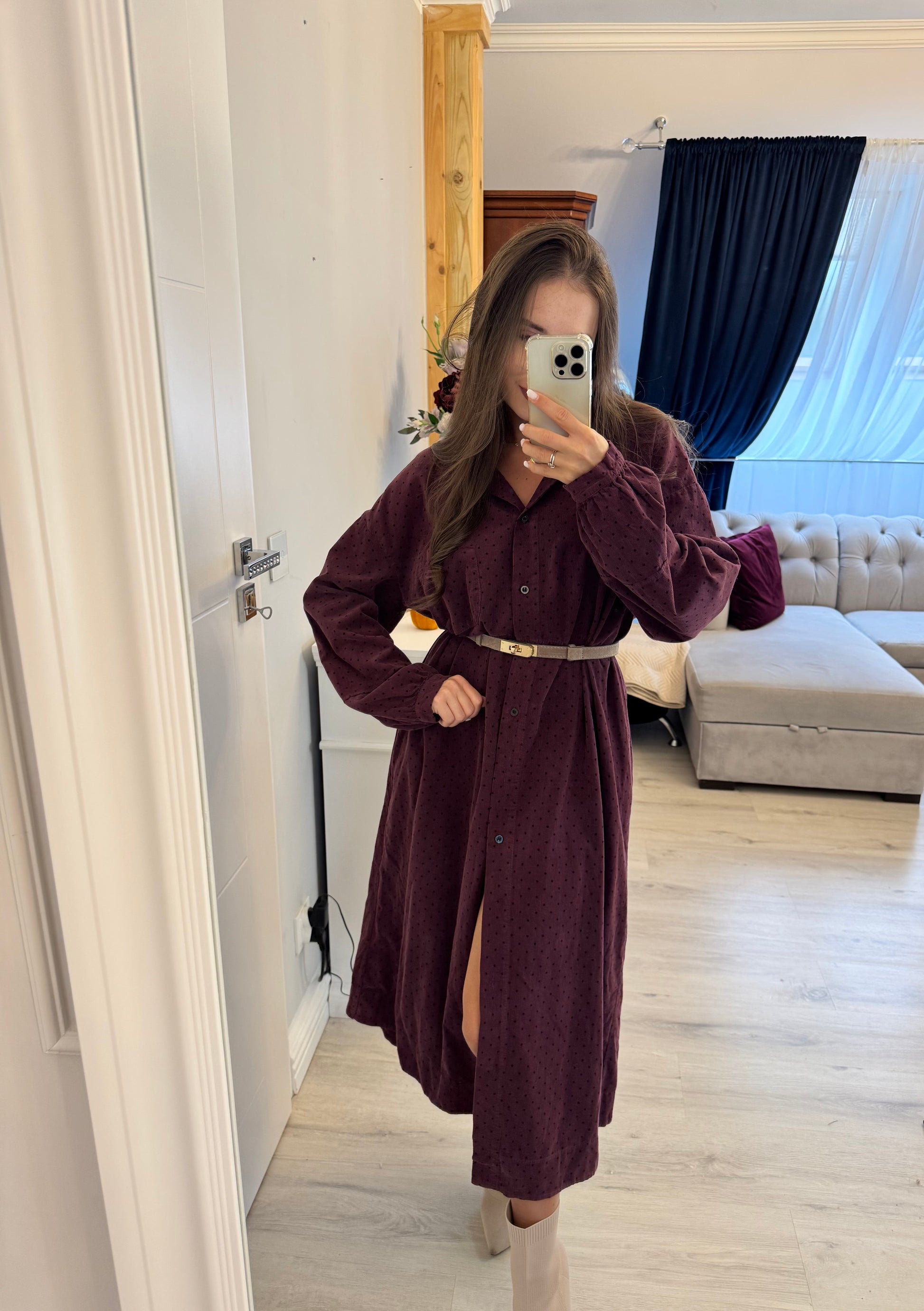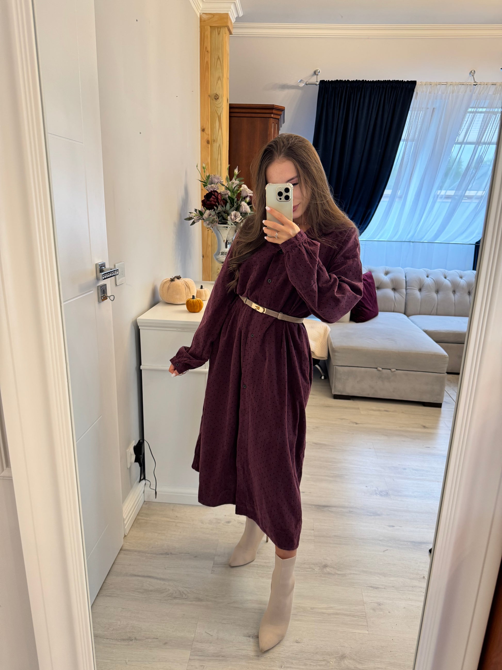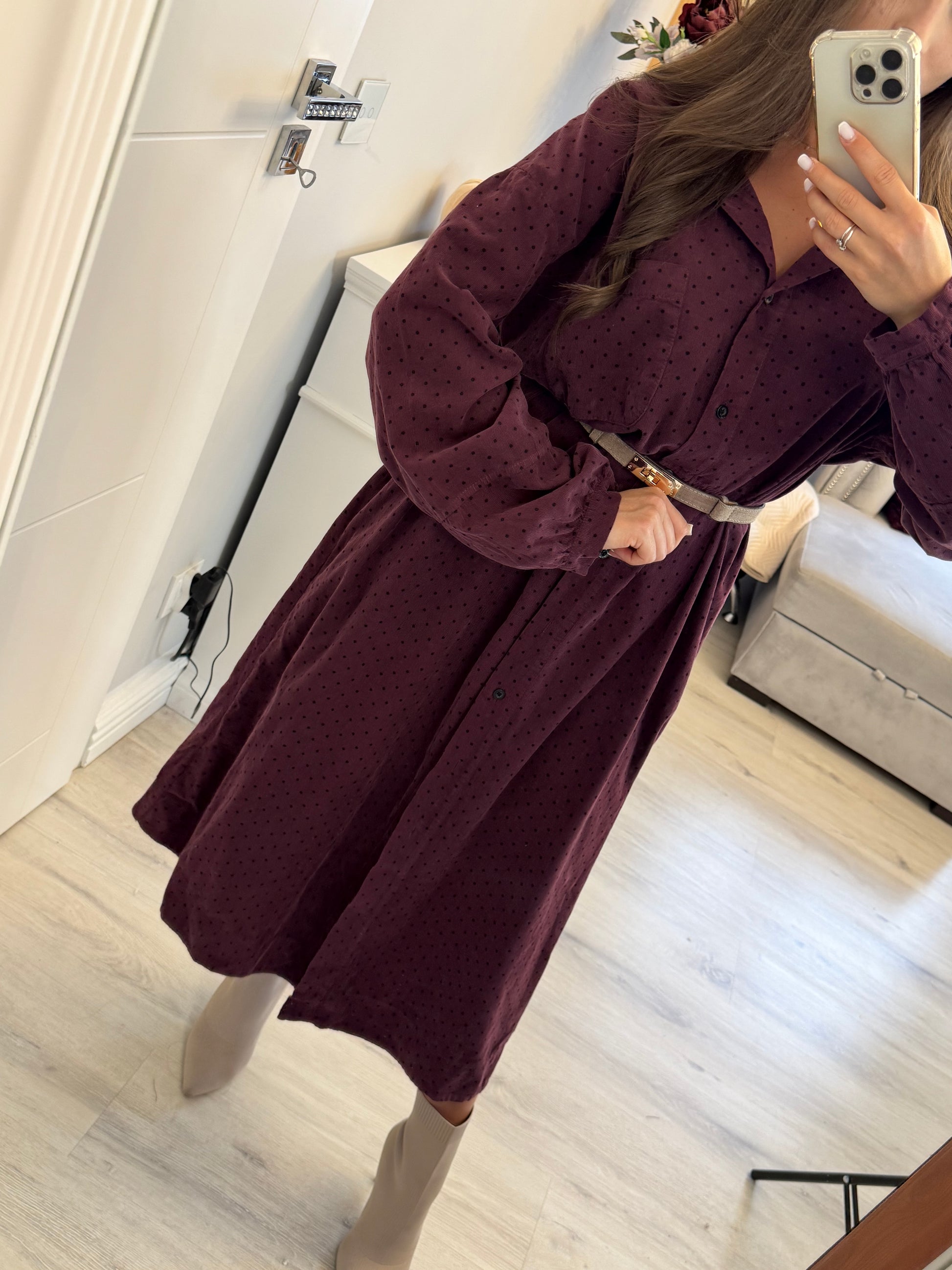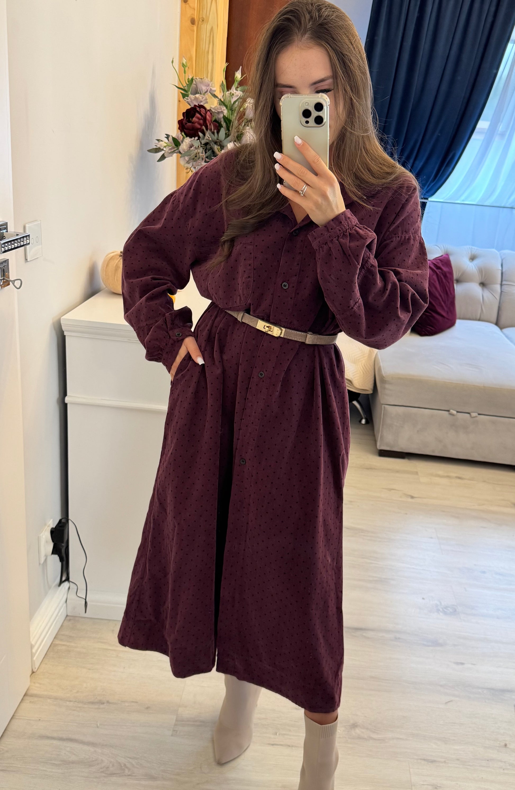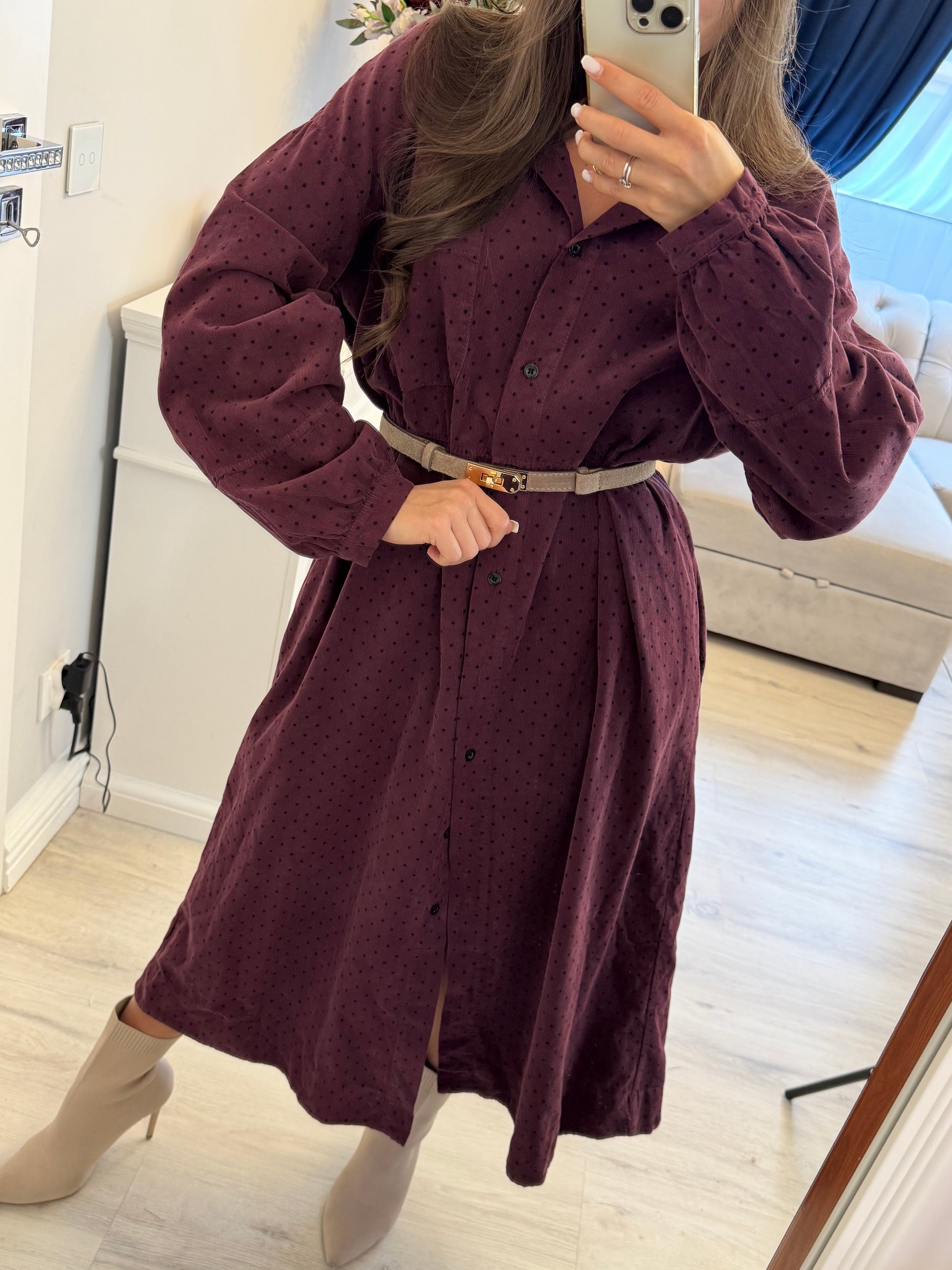 Elegancka koszulowa sukienka midi, która łączy w sobie wygodę z ponadczasowym stylem. Wykonanie z miękkiego materiału w odcieniach ciemnych śliwki, ozdobione subtelnym oznaczeniem w delikatnych kropeczkach. Luźny fason pięknie układa się na sylwetce, a dostęp pozwala na korzystanie z talii i dostęp do figurze kobiecej.