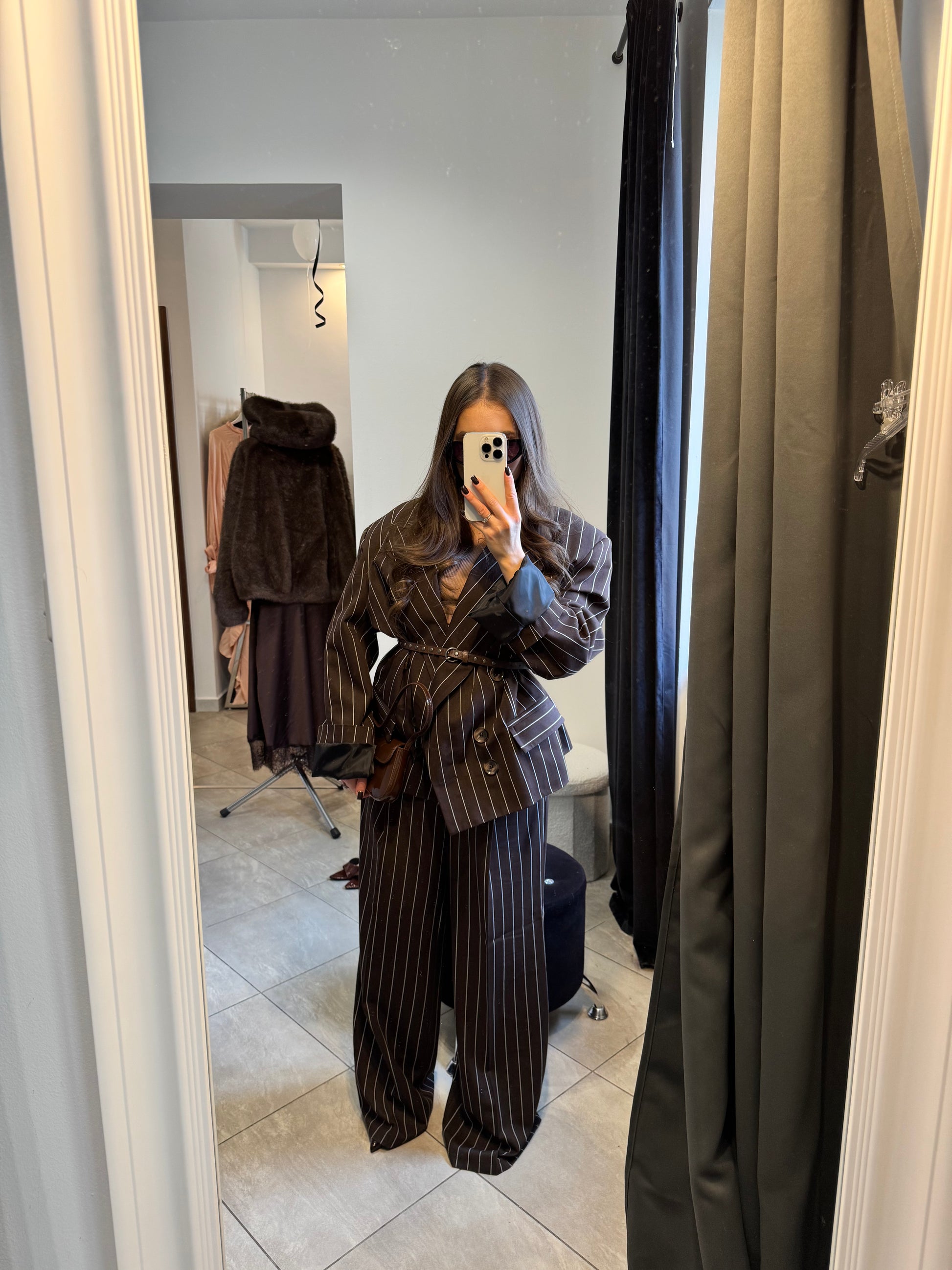 Model wyróżnia się klasycznym wzorem w pionowe prążki, głębokim brązowym kolorem oraz kontrastowymi mankietami. Idealna zarówno do pracy, jak i na wieczorne wyjście – świetnie prezentuje się w komplecie ze spodniami z tej samej kolekcji lub w zestawieniu z jeansami dla bardziej casualowego looku.