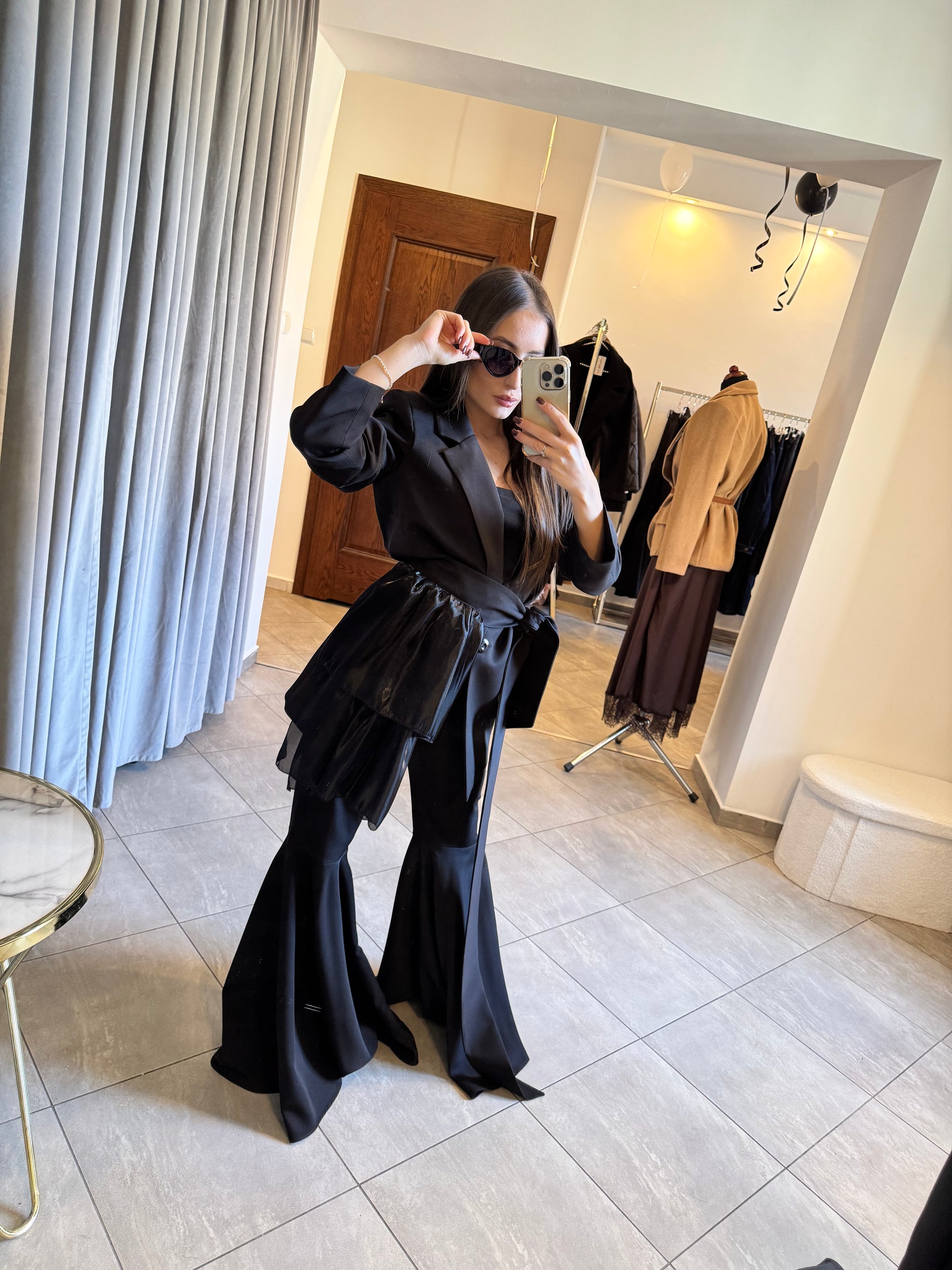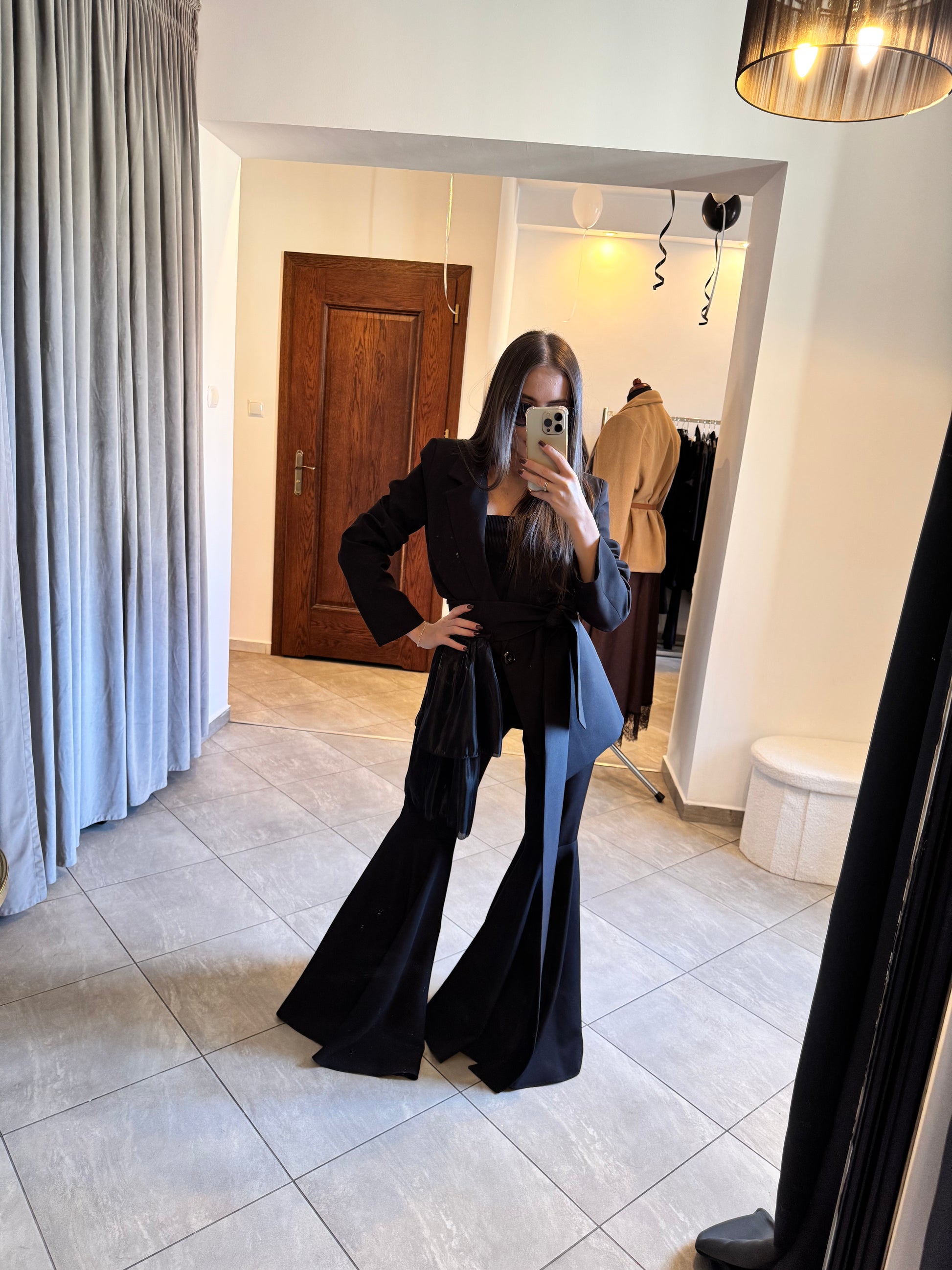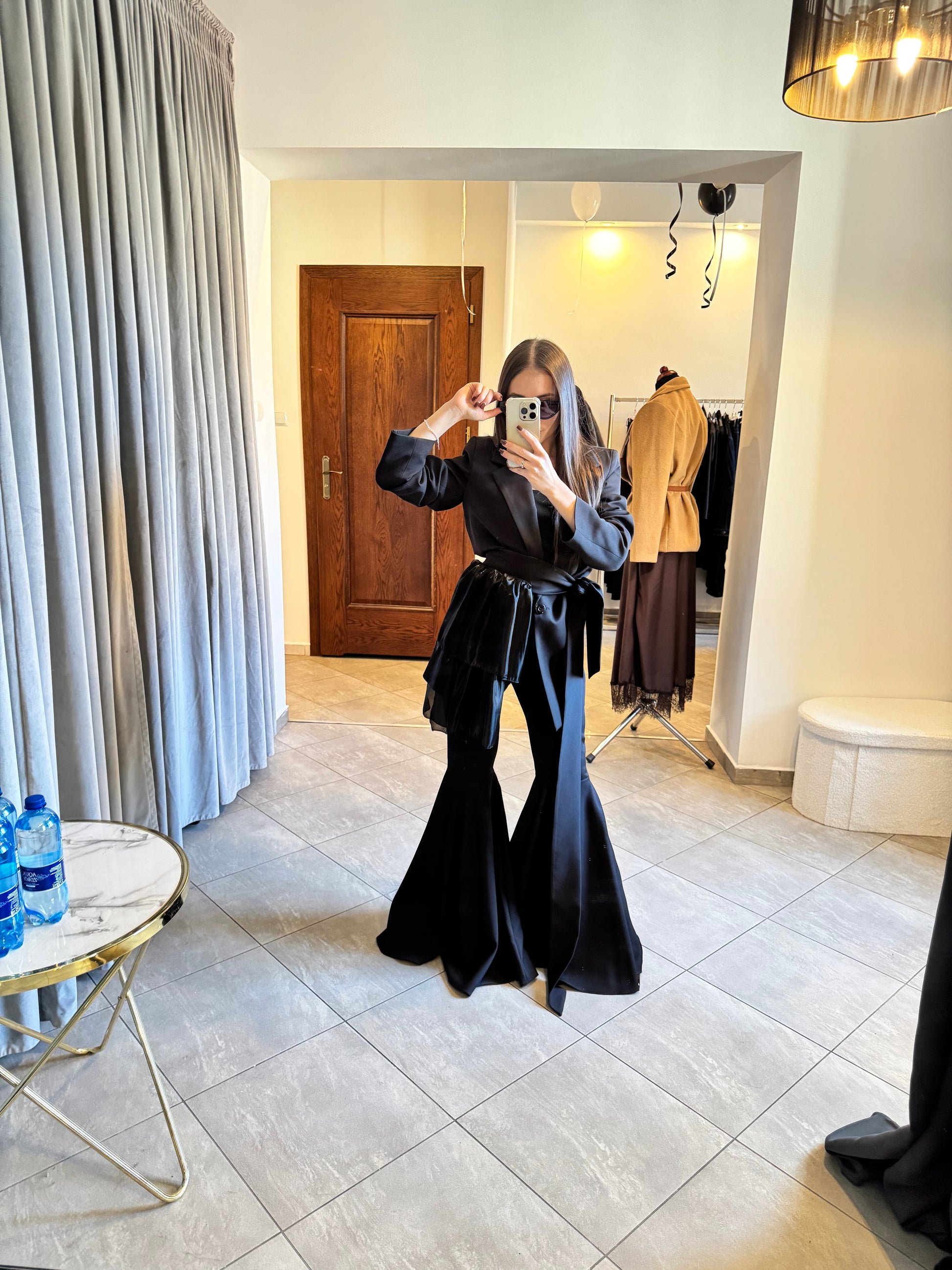 Marynarka Sculpted Noir to elegancja z artystycznym twistem. Klasyczny, dopasowany fason został przełamany wyjątkowym detalem – falbanami na pasku, które dodają całości lekkości i nowoczesnej kobiecości. Wykonana z wysokiej jakości tkaniny o matowym wykończeniu, pięknie układa się na sylwetce, podkreślając talię i ramiona. Minimalistyczna forma z subtelnym, designerskim akcentem sprawia, że marynarka doskonale sprawdzi się zarówno w zestawieniu z szerokimi spodniami, jak i jako samodzielny element stylizacji.