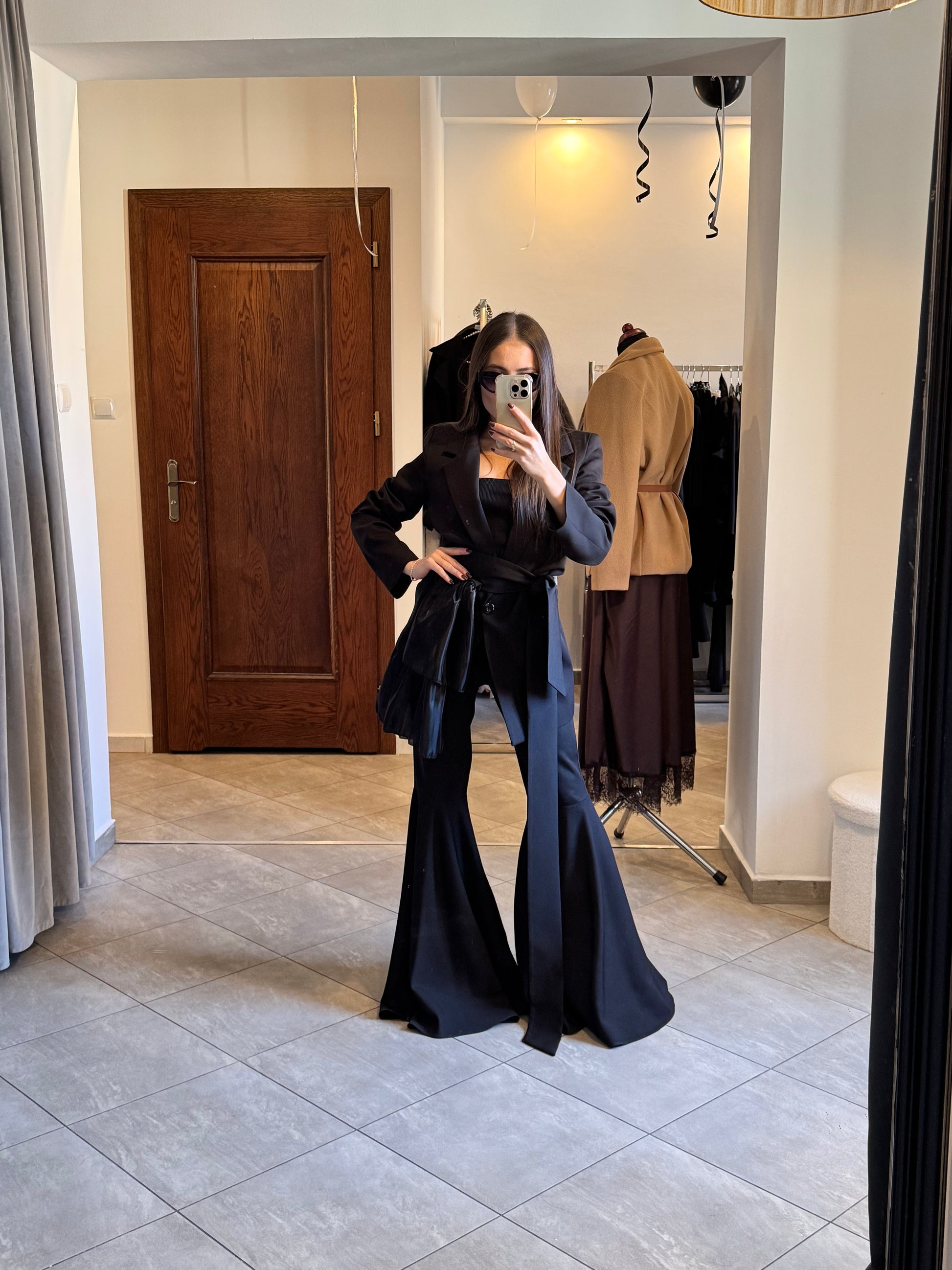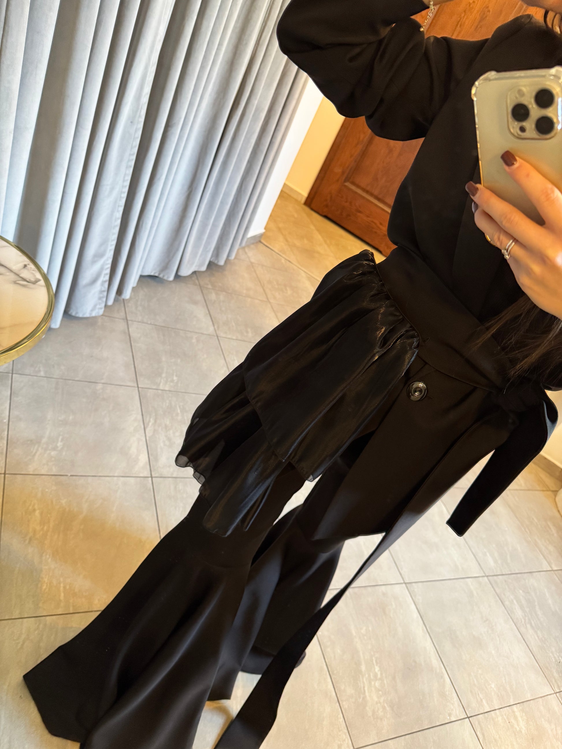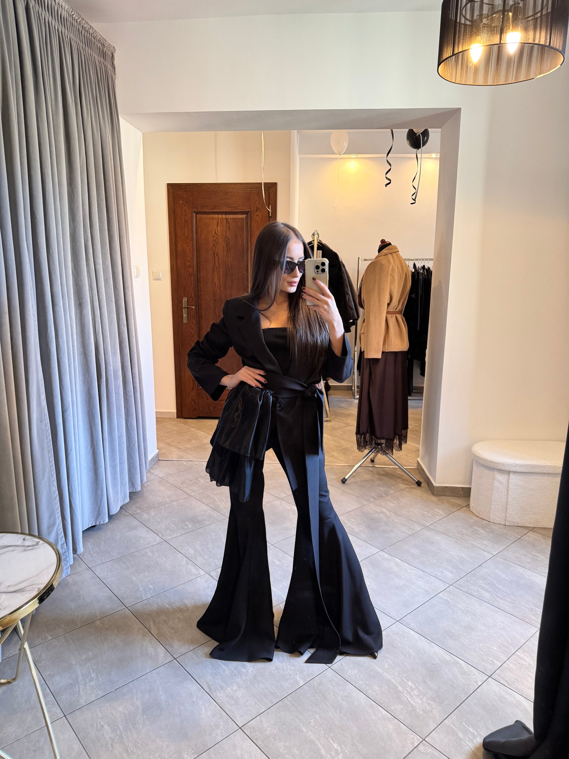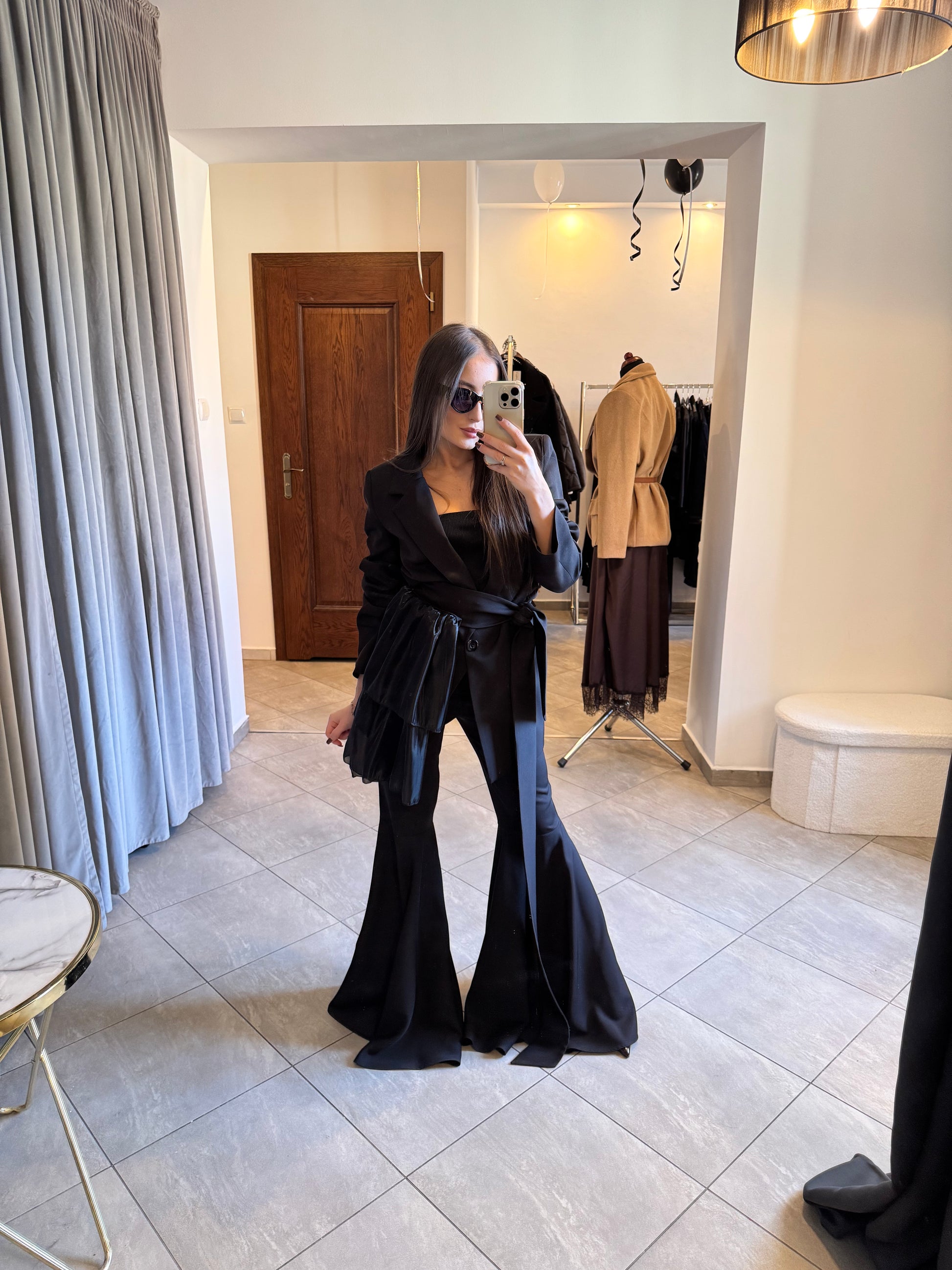 Marynarka Sculpted Noir to elegancja z artystycznym twistem. Klasyczny, dopasowany fason został przełamany wyjątkowym detalem – falbanami na pasku, które dodają całości lekkości i nowoczesnej kobiecości. Wykonana z wysokiej jakości tkaniny o matowym wykończeniu, pięknie układa się na sylwetce, podkreślając talię i ramiona. Minimalistyczna forma z subtelnym, designerskim akcentem sprawia, że marynarka doskonale sprawdzi się zarówno w zestawieniu z szerokimi spodniami, jak i jako samodzielny element stylizacji.