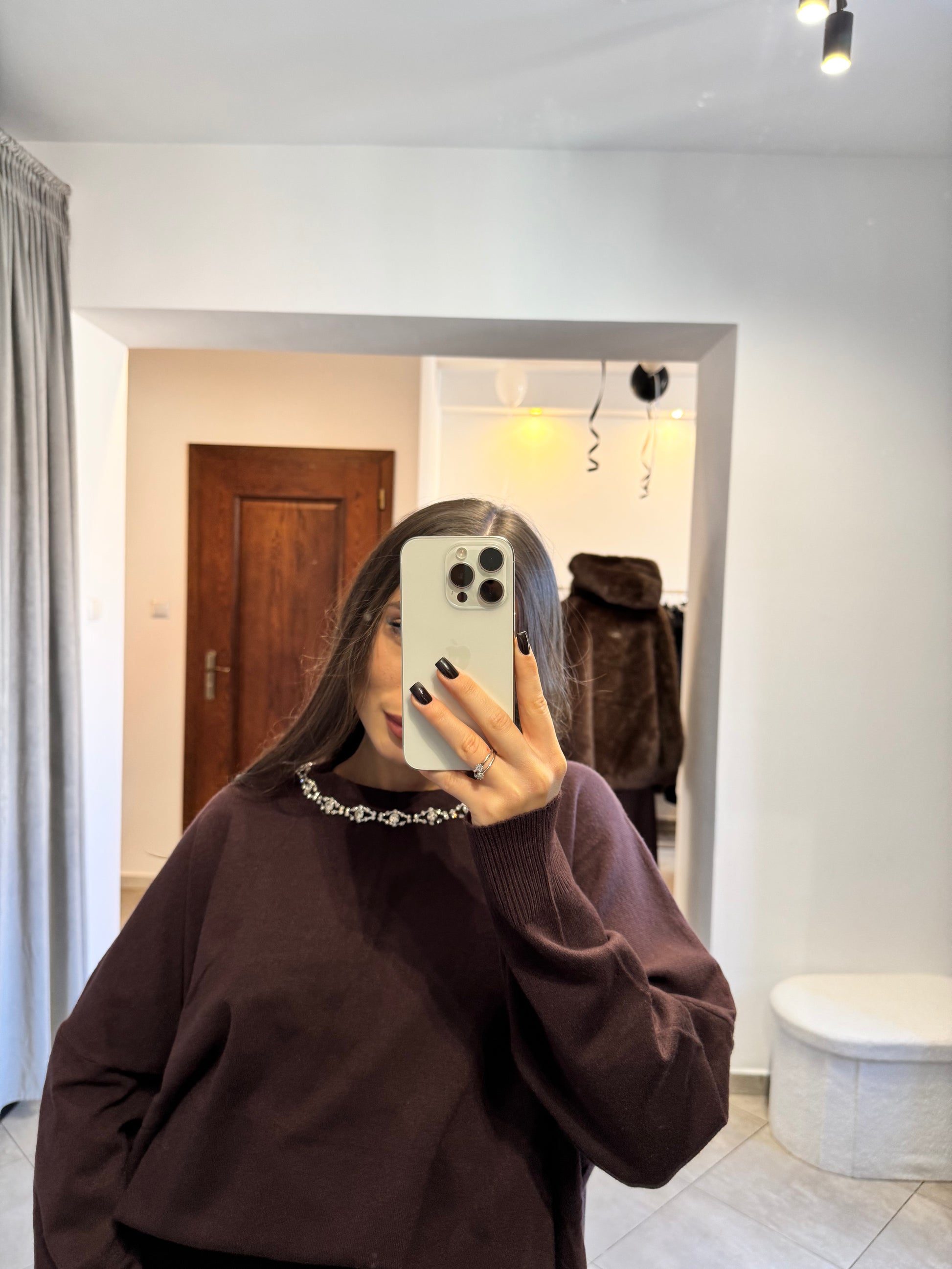 Luźny, niezwykle komfortowy sweter o kroju oversize, wykonany z miękkiej dzianiny w głębokim odcieniu ciemnej czekolady. Model wyróżnia się subtelnym detalem – ozdobnym dekoltem z delikatnym łańcuszkiem, który dodaje mu elegancji i nowoczesnego charakteru. Dłuższy fason z obniżoną linią ramion zapewnia swobodę ruchów i efekt lekkości.