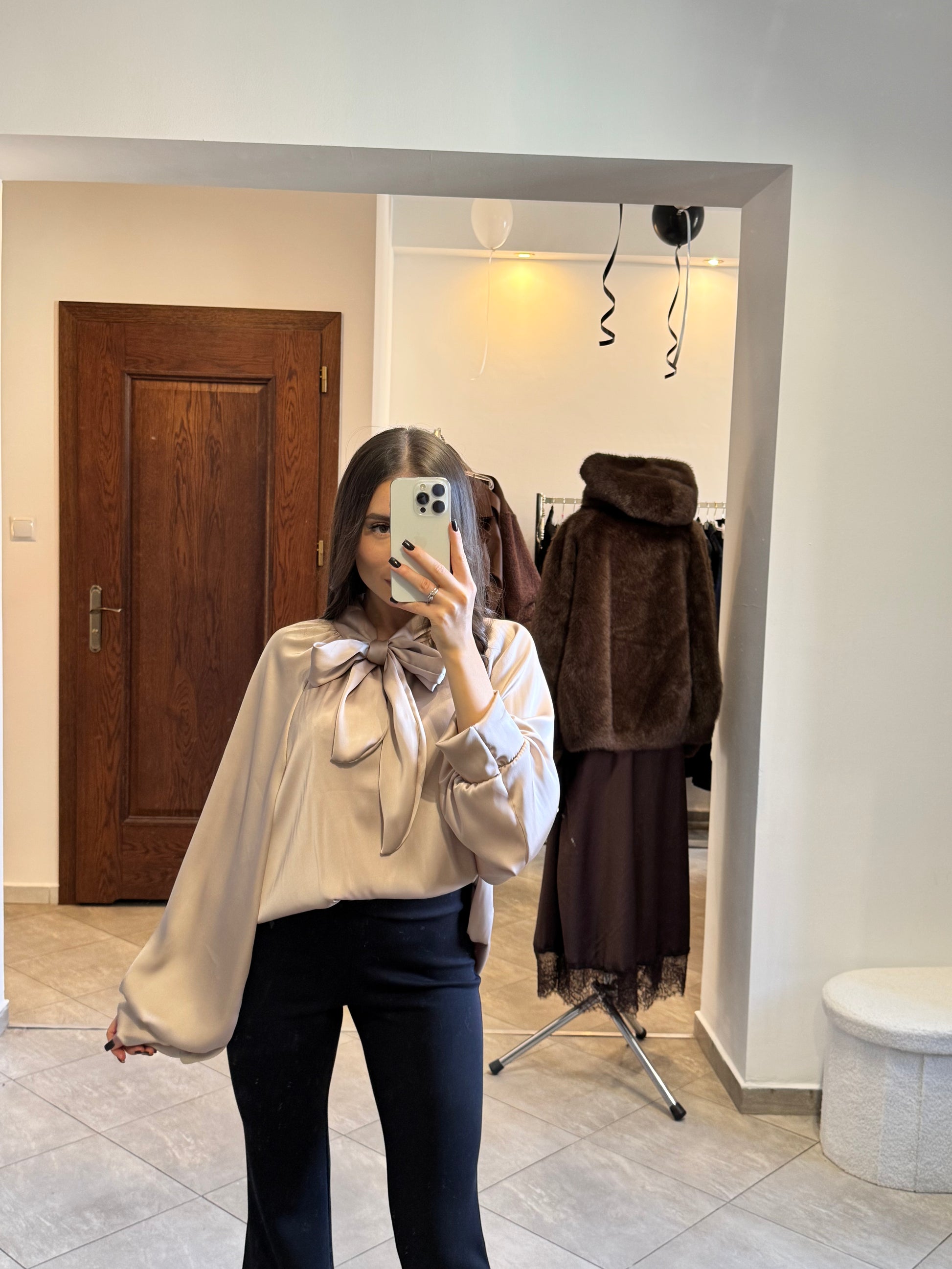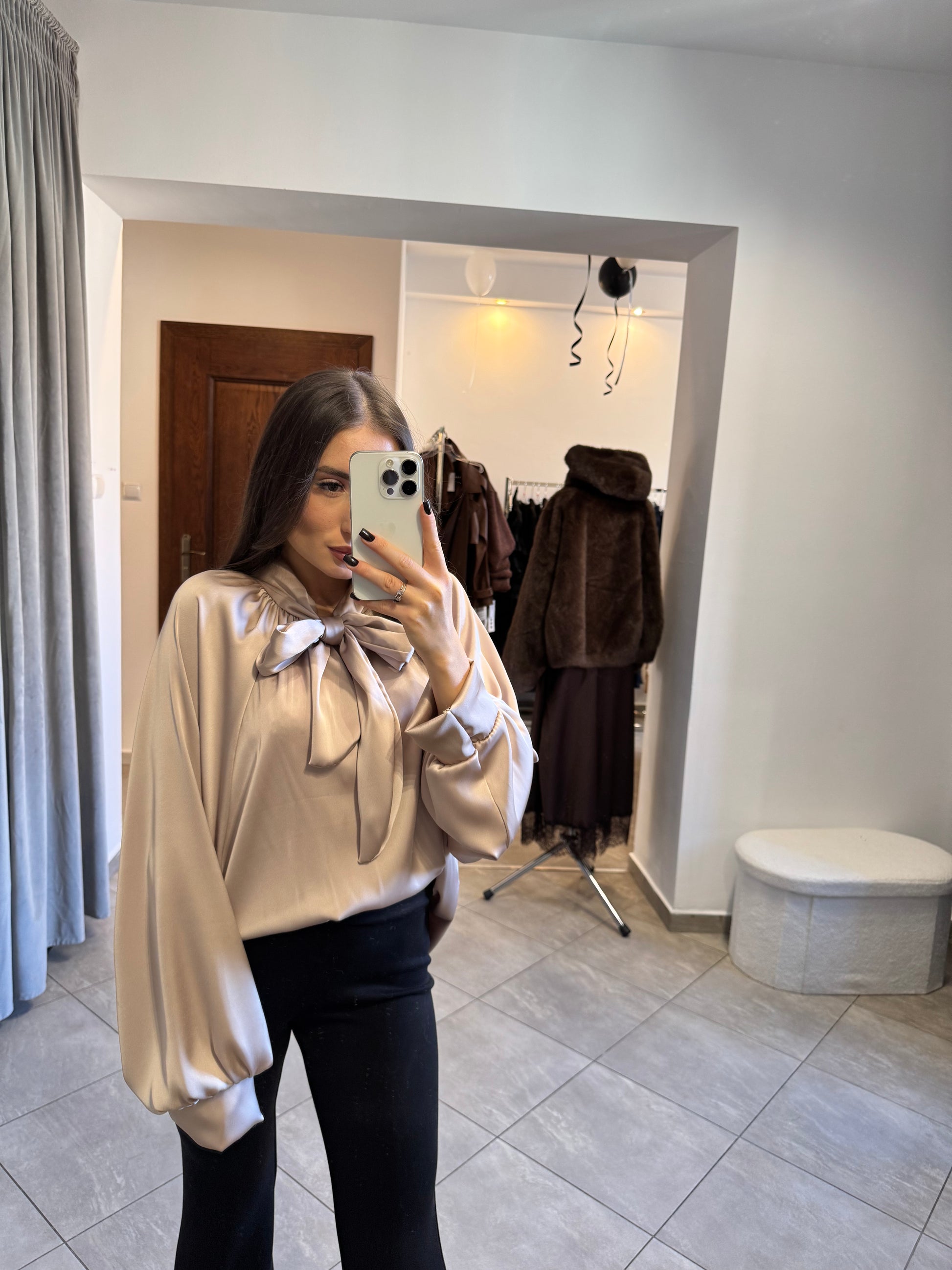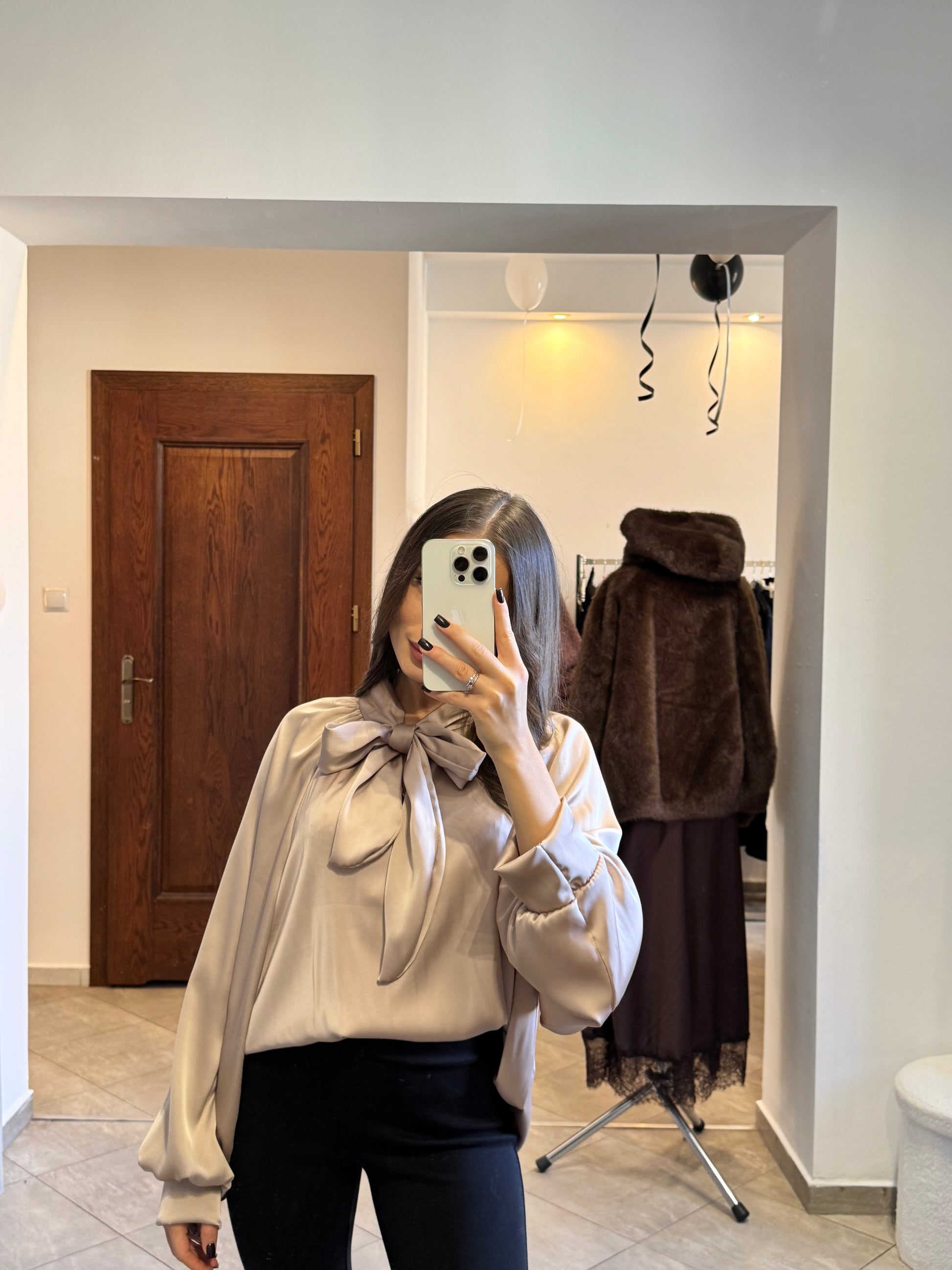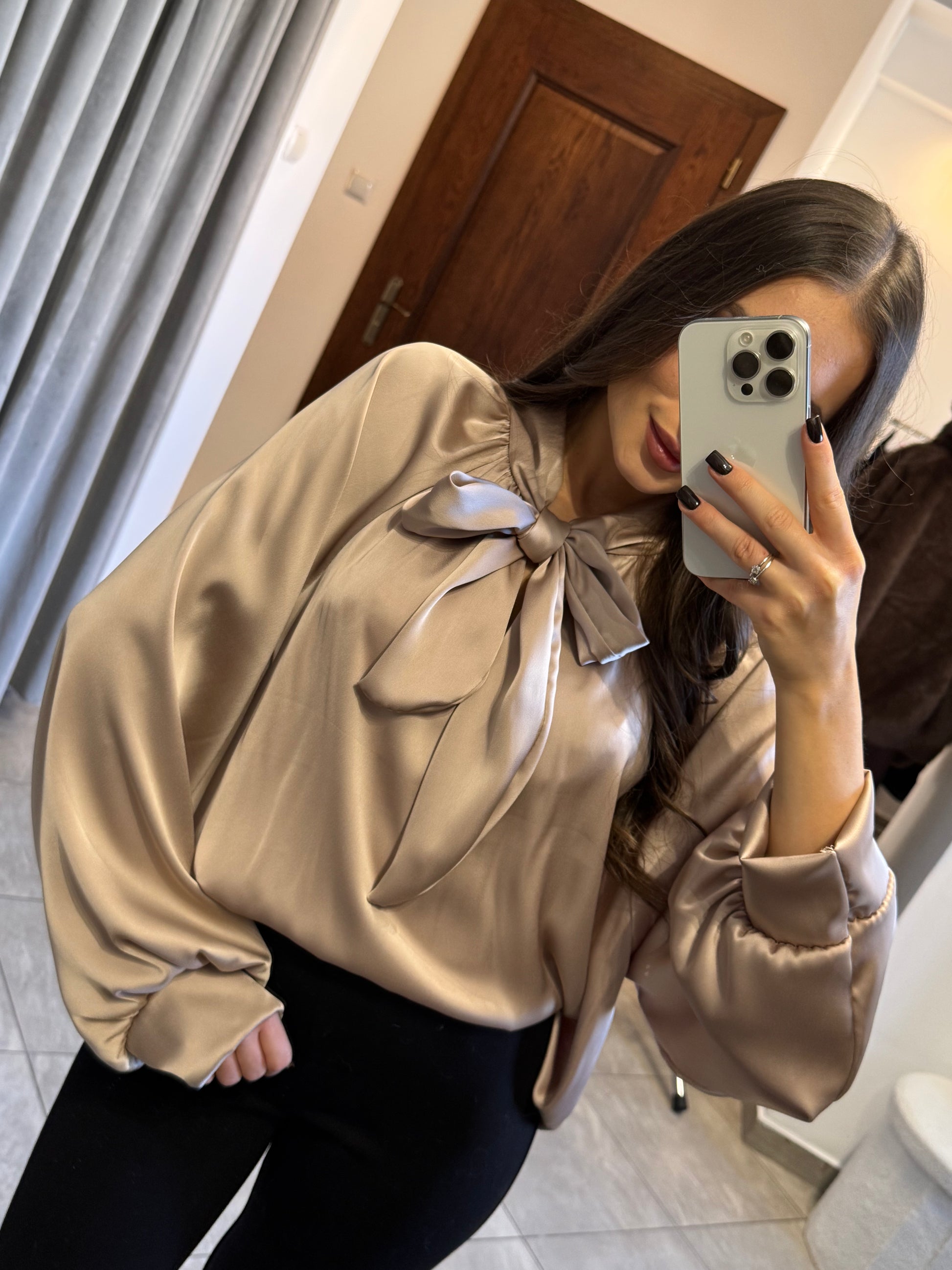 Satynowa koszula z wiązaniem pod szyją – beżowy połysk