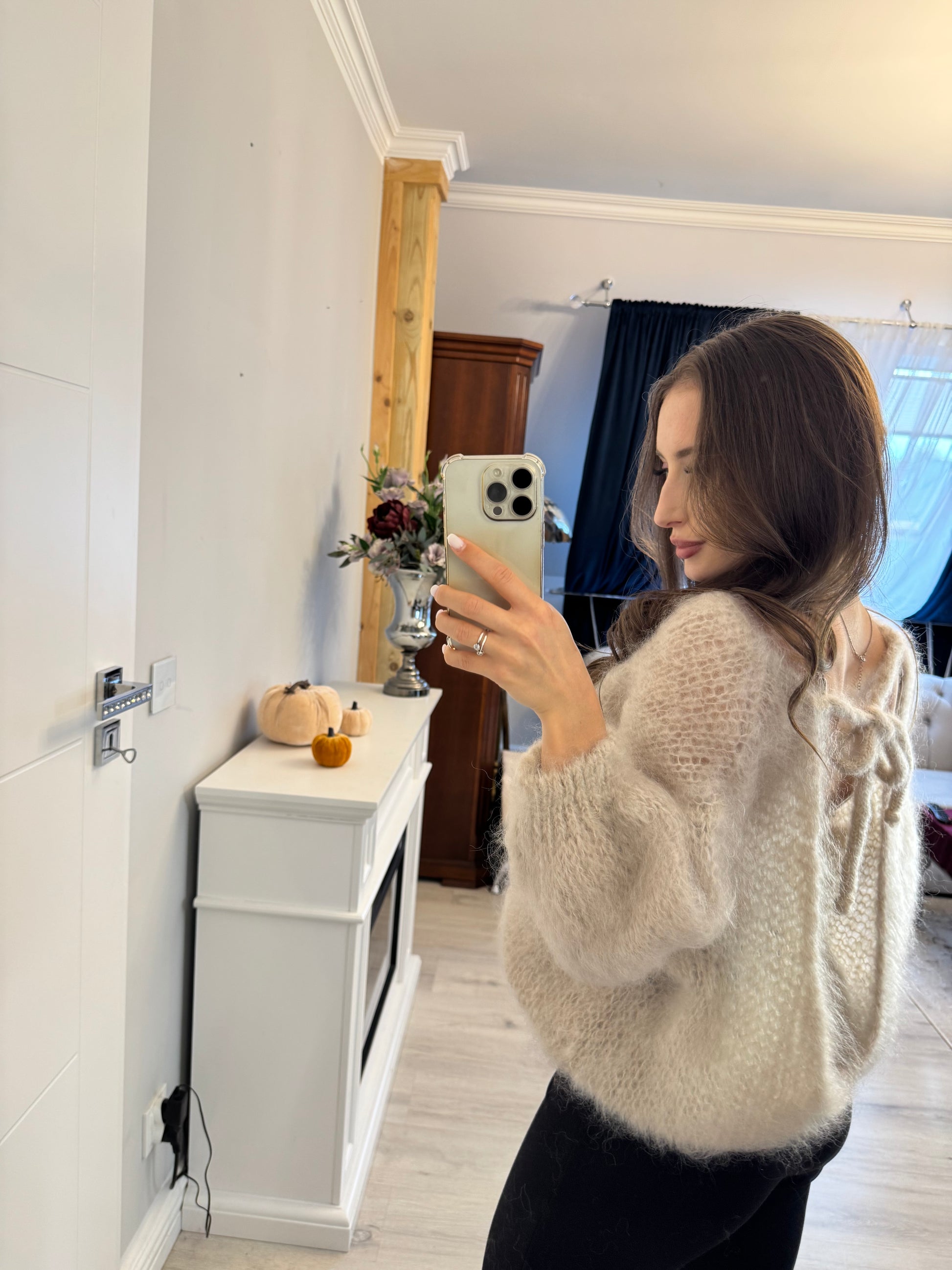 Sweter kid moher w kolorze beżowym z wycięciem na plecach