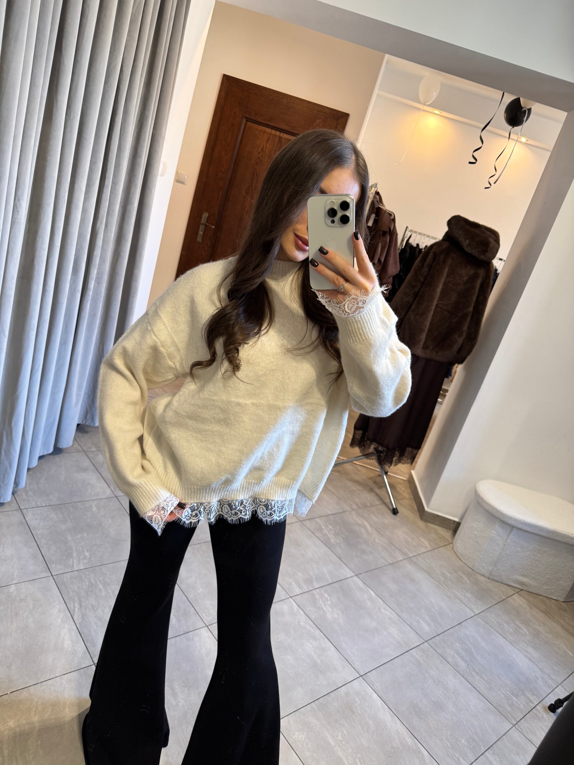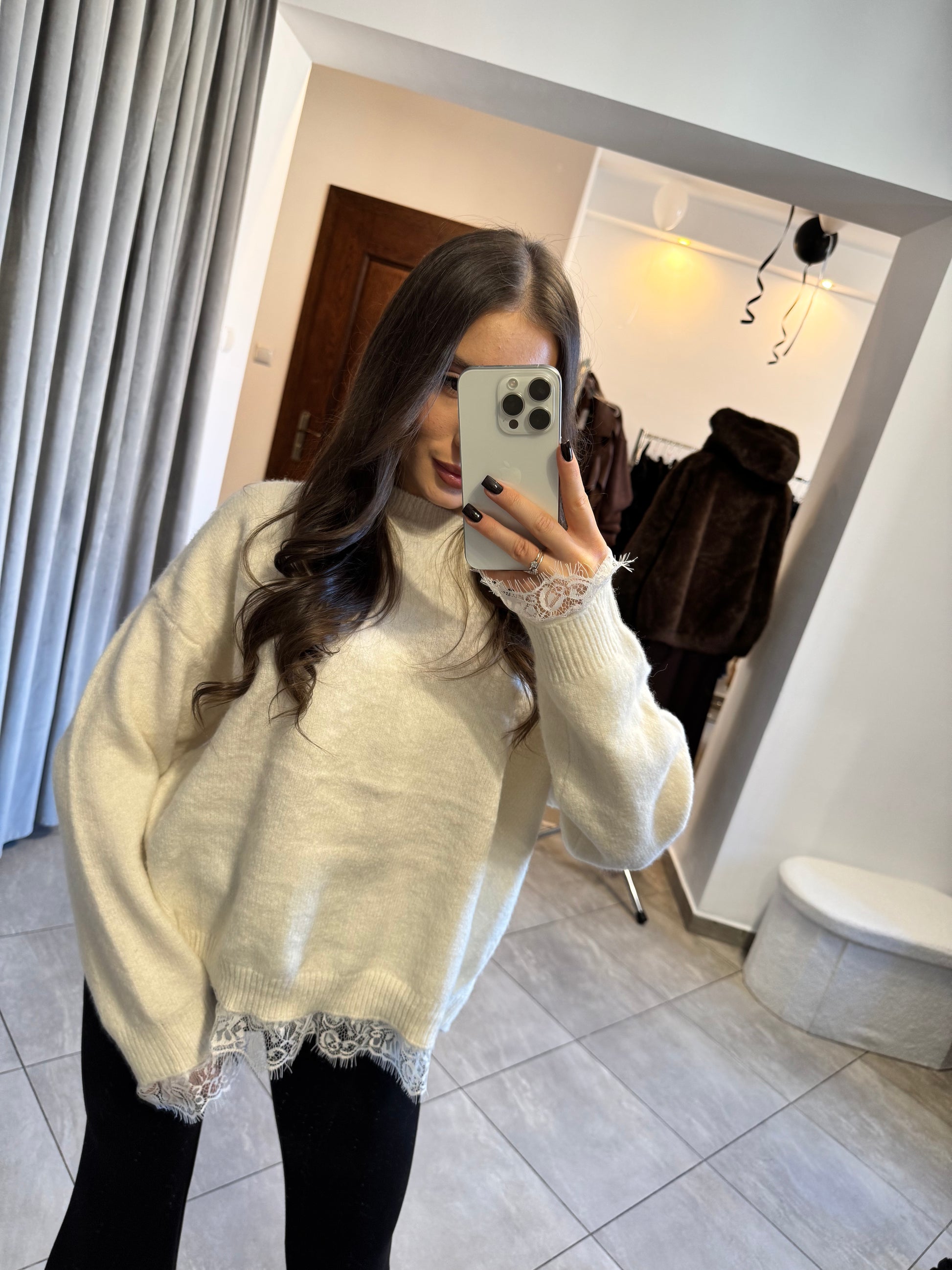 Sweter z koronkowym wykończeniem i dekoltem V na plecach – ecru elegance