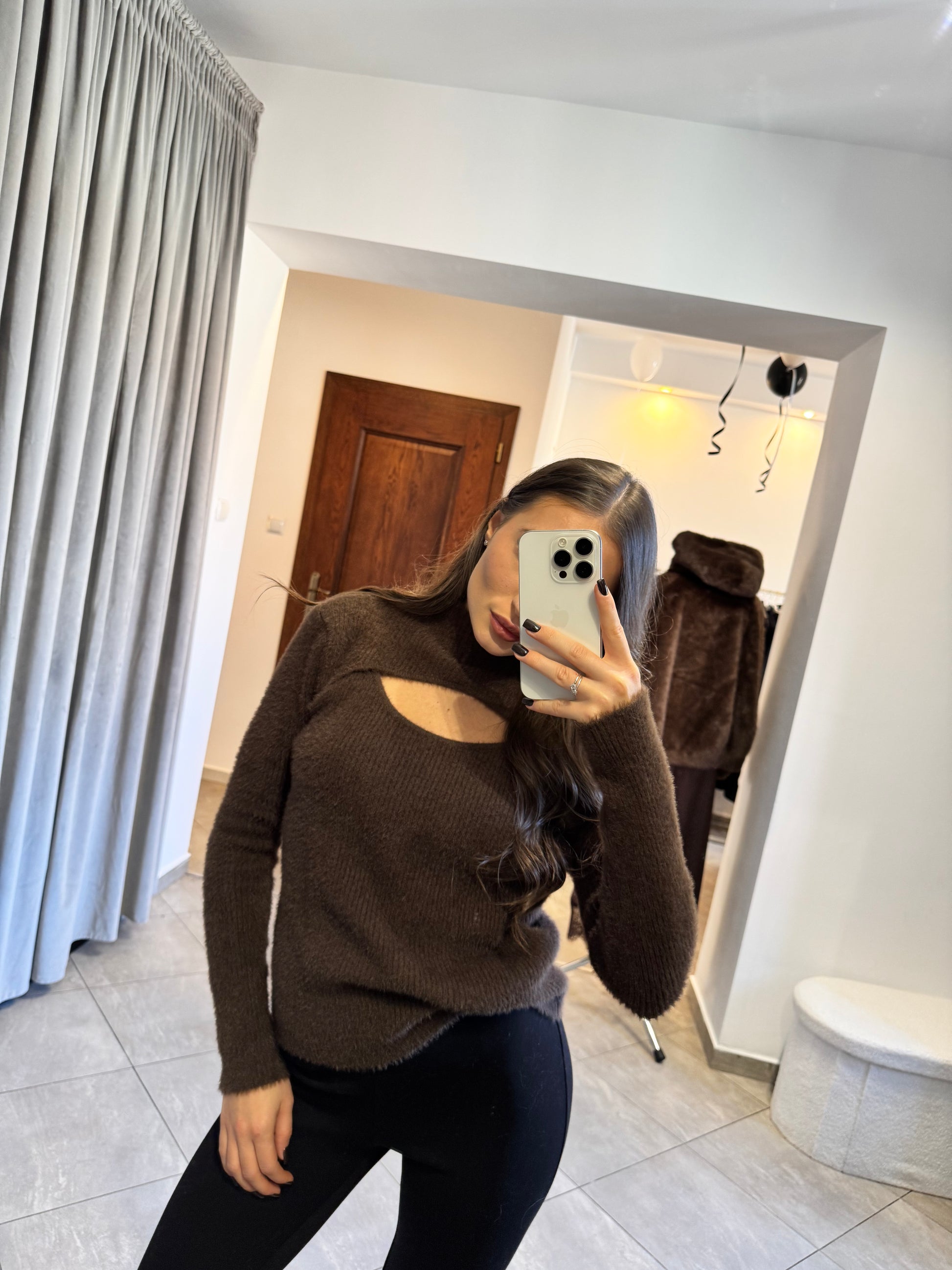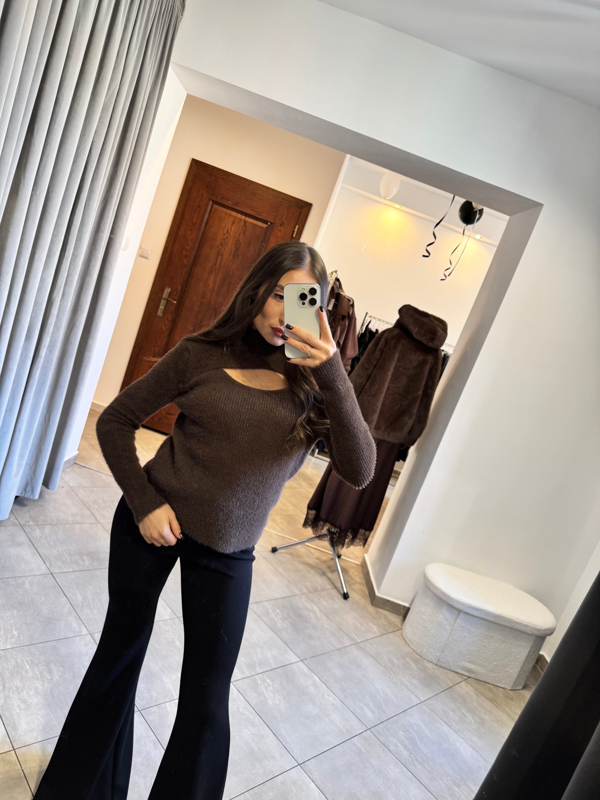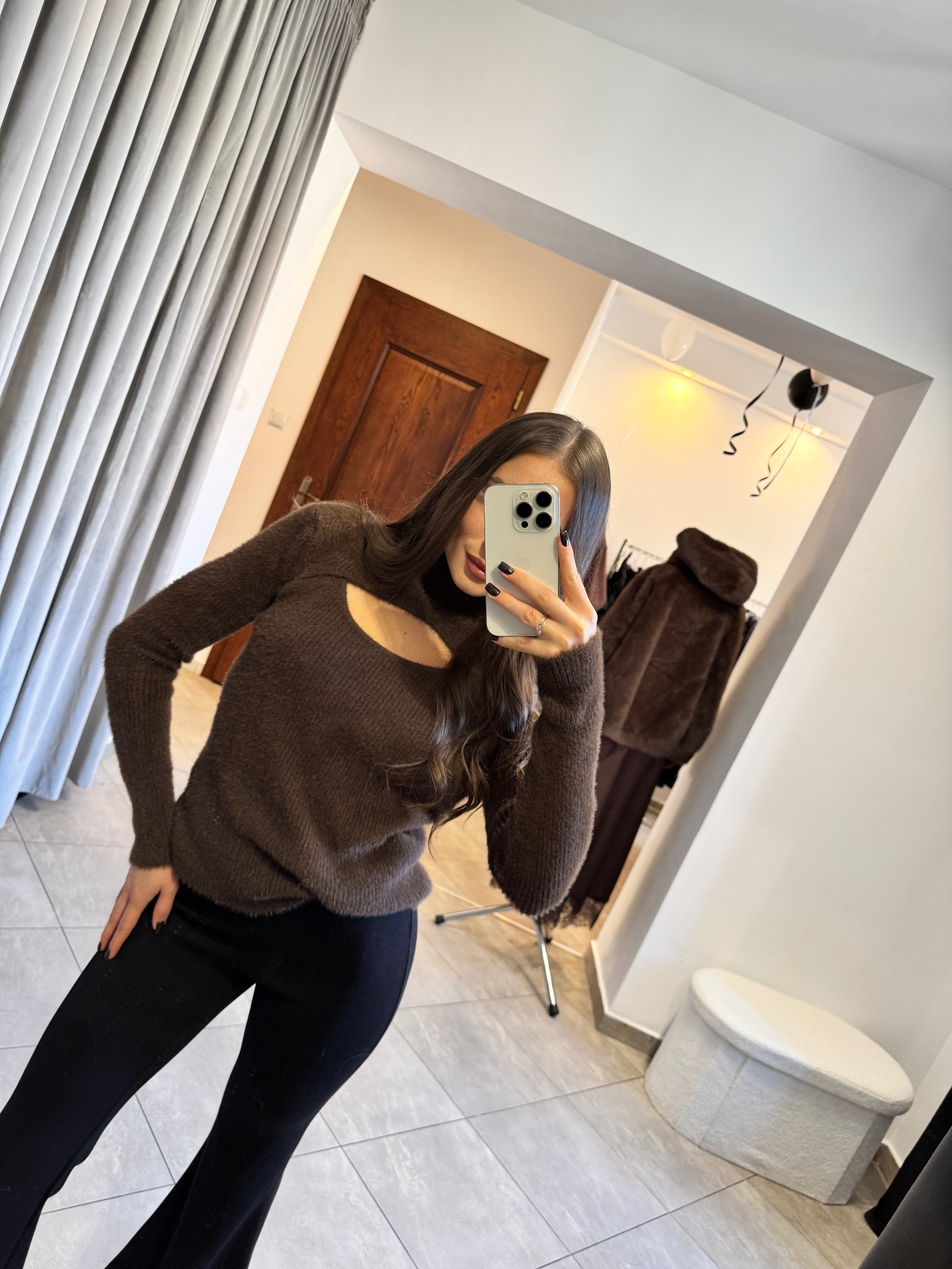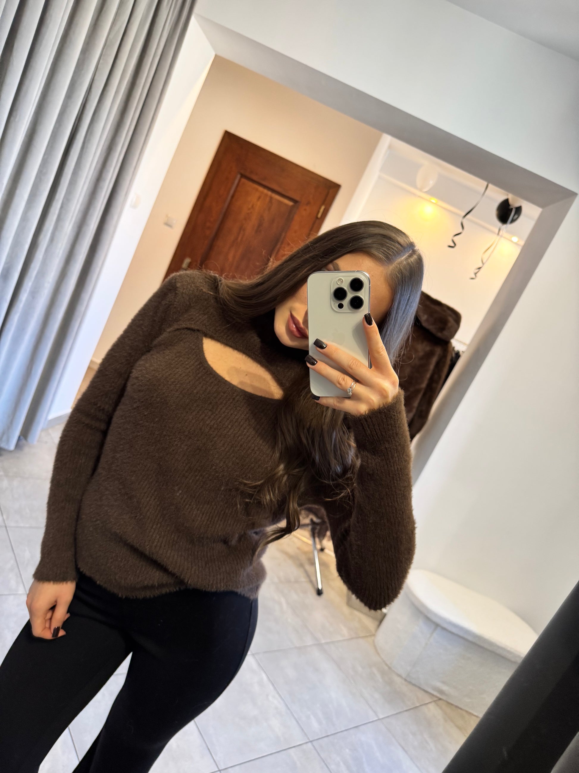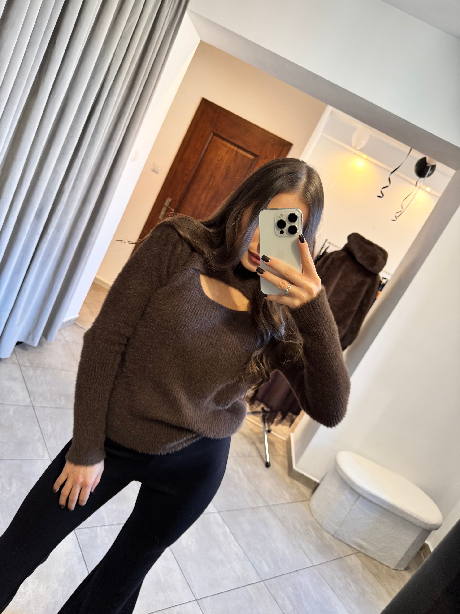Sweter z wycięciem przy dekolcie – czekoladowy