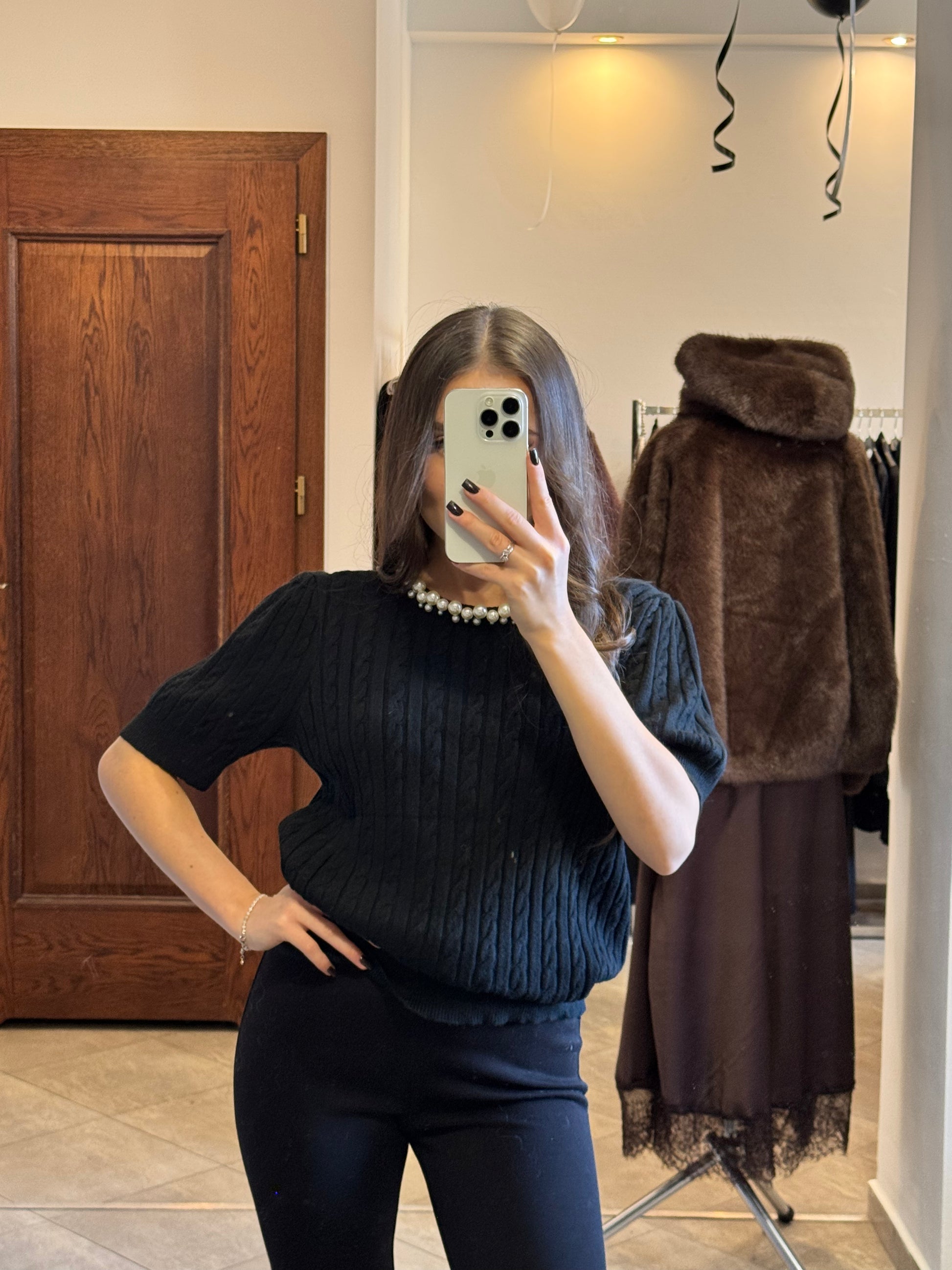 Sweterek z krótkim rękawem i ozdobnym splotem – klasyczna czerń 🖤