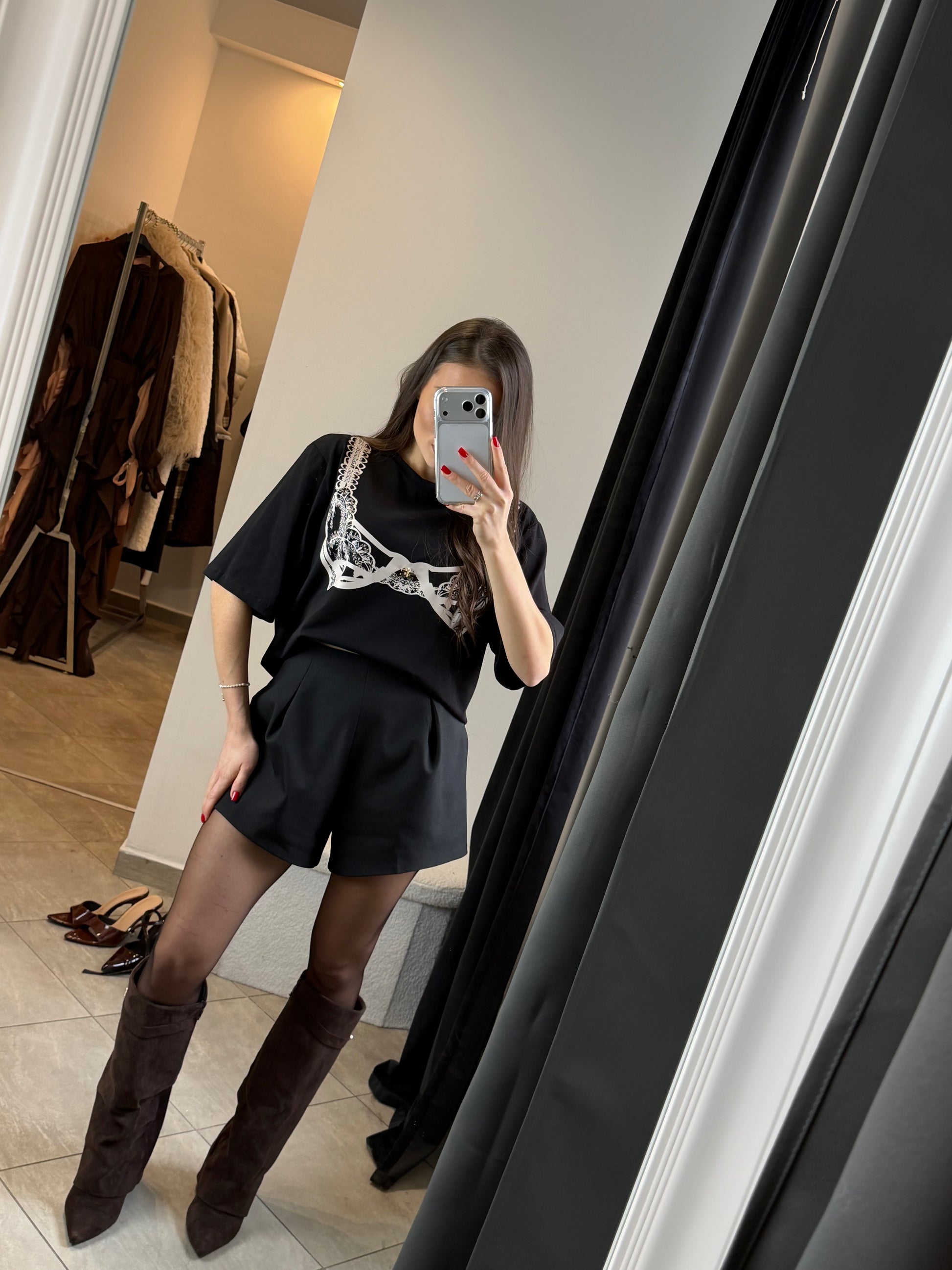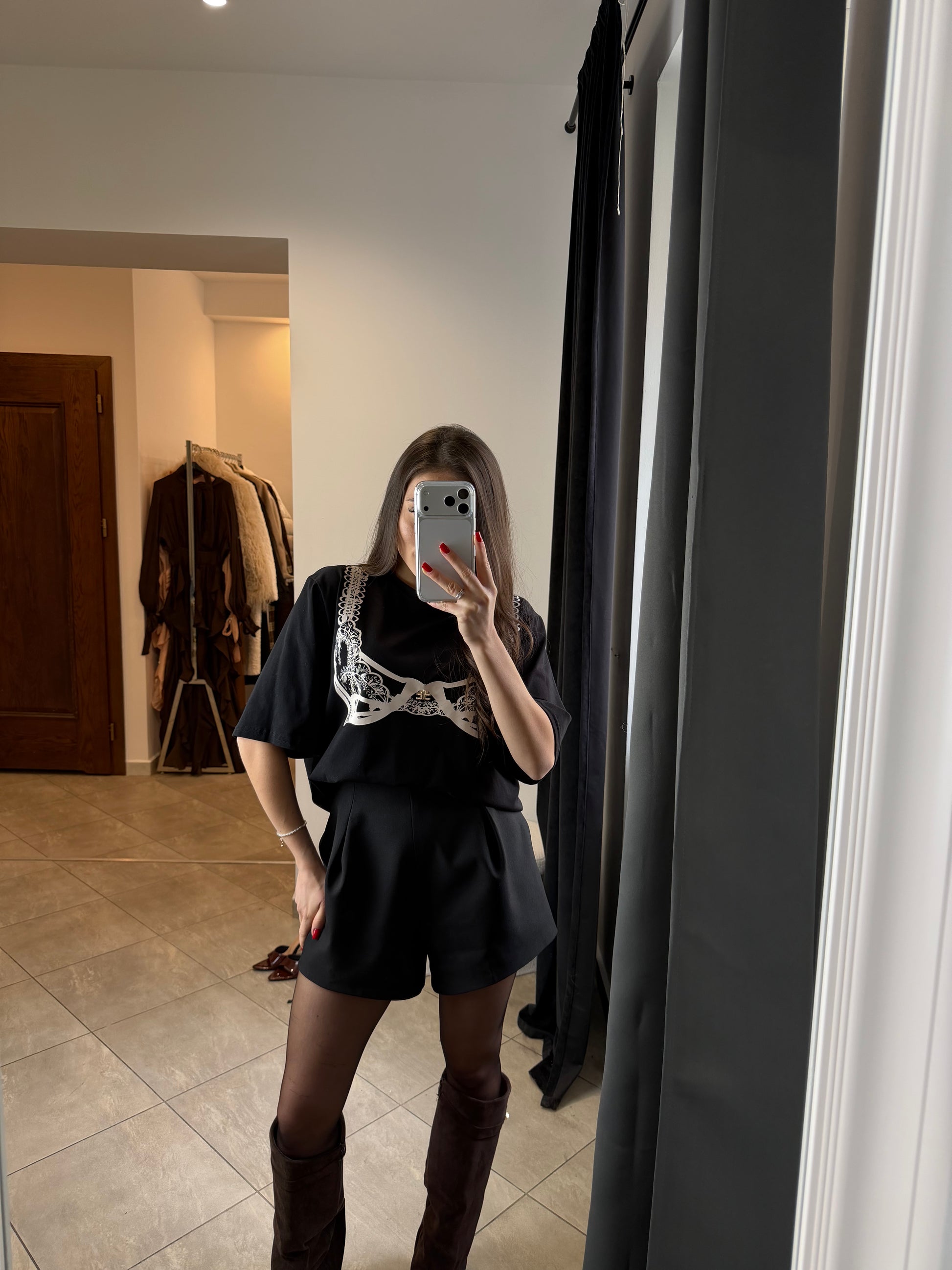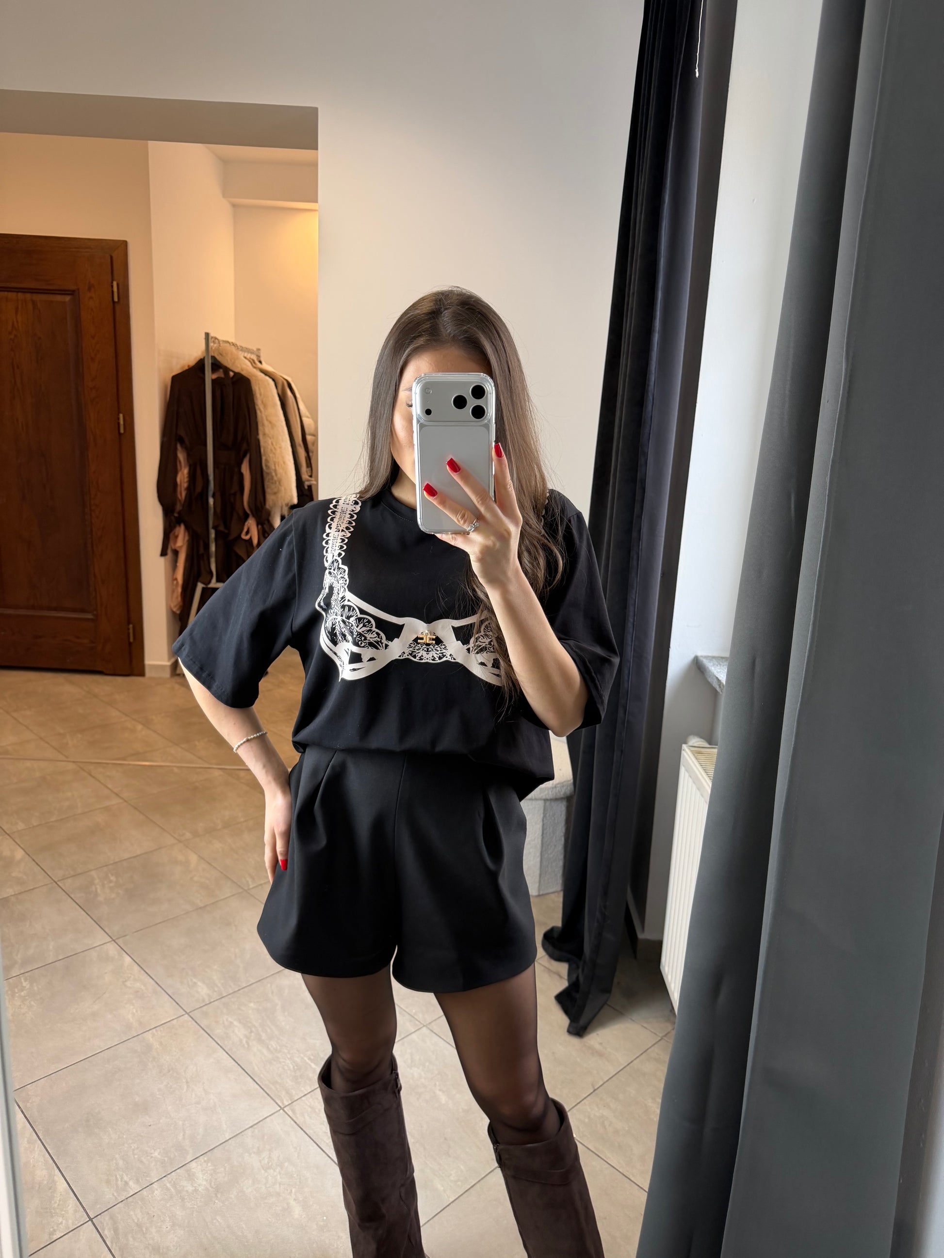 Nowoczesny, T-shirt w klasycznej czerni, wyróżniający się wyjątkowym nadrukiem inspirowanym koronkową bielizną. Kontrastowy biały motyw nadaje koszulce modowego charakteru i przyciąga spojrzenia, tworząc efektowny, nieco zadziorny akcent w codziennych stylizacjach.