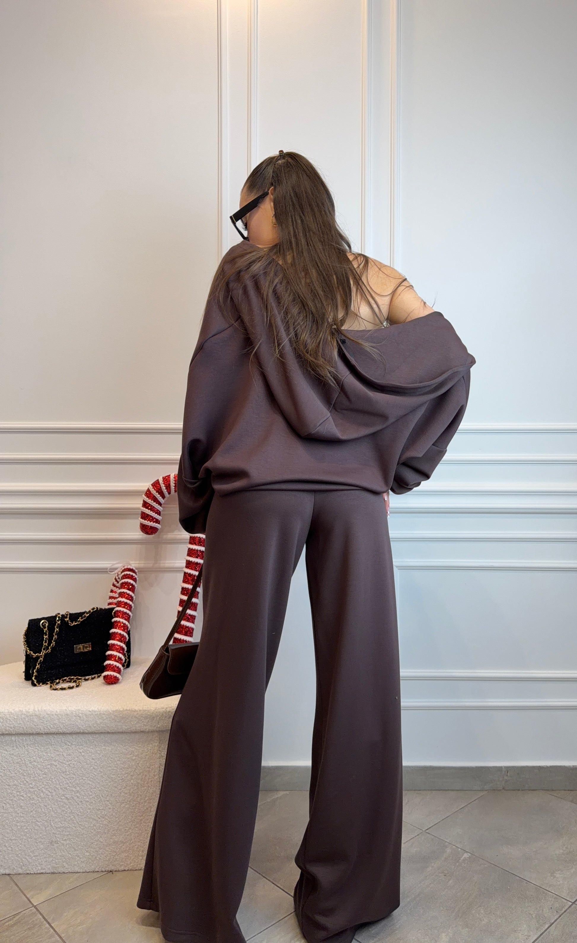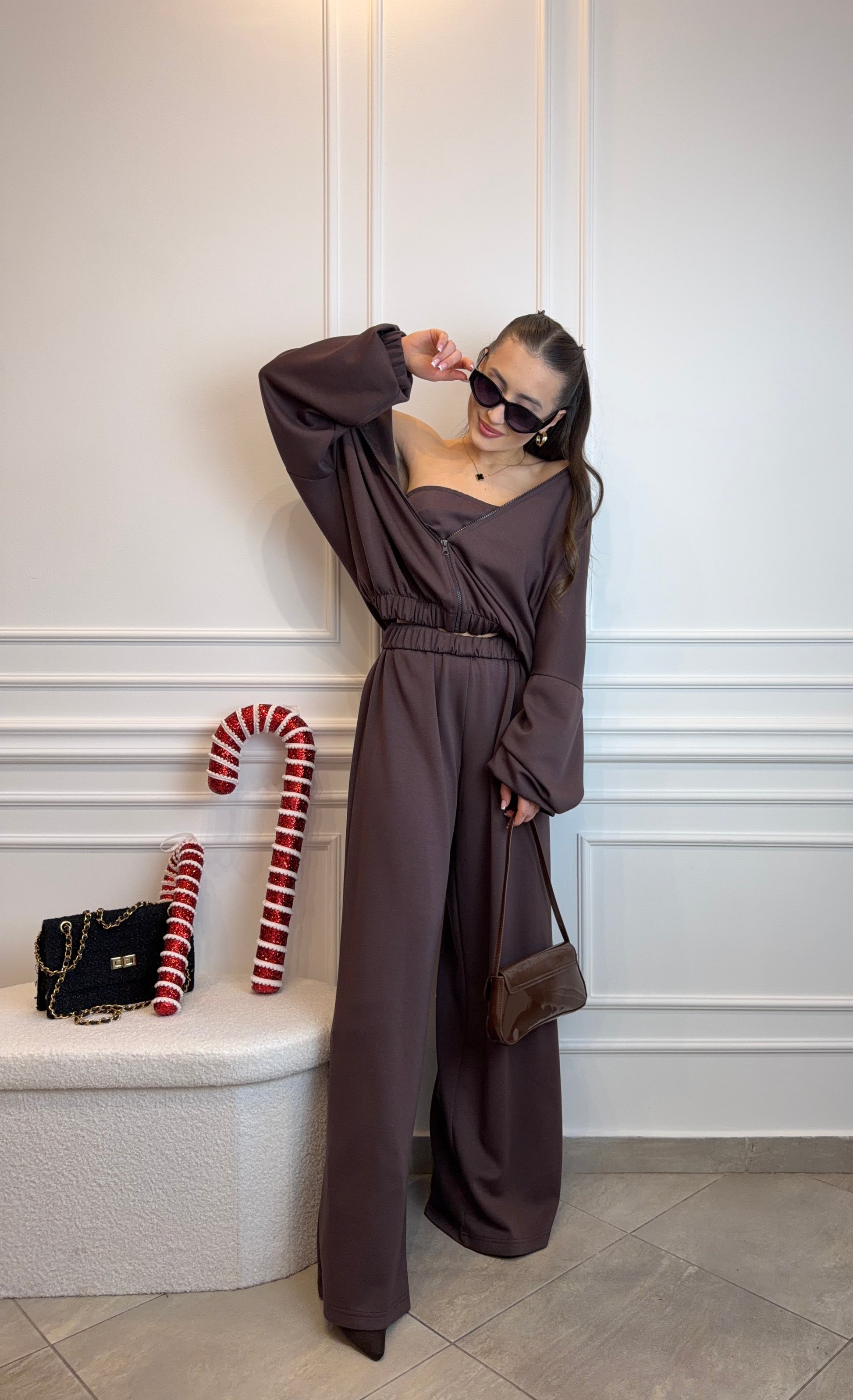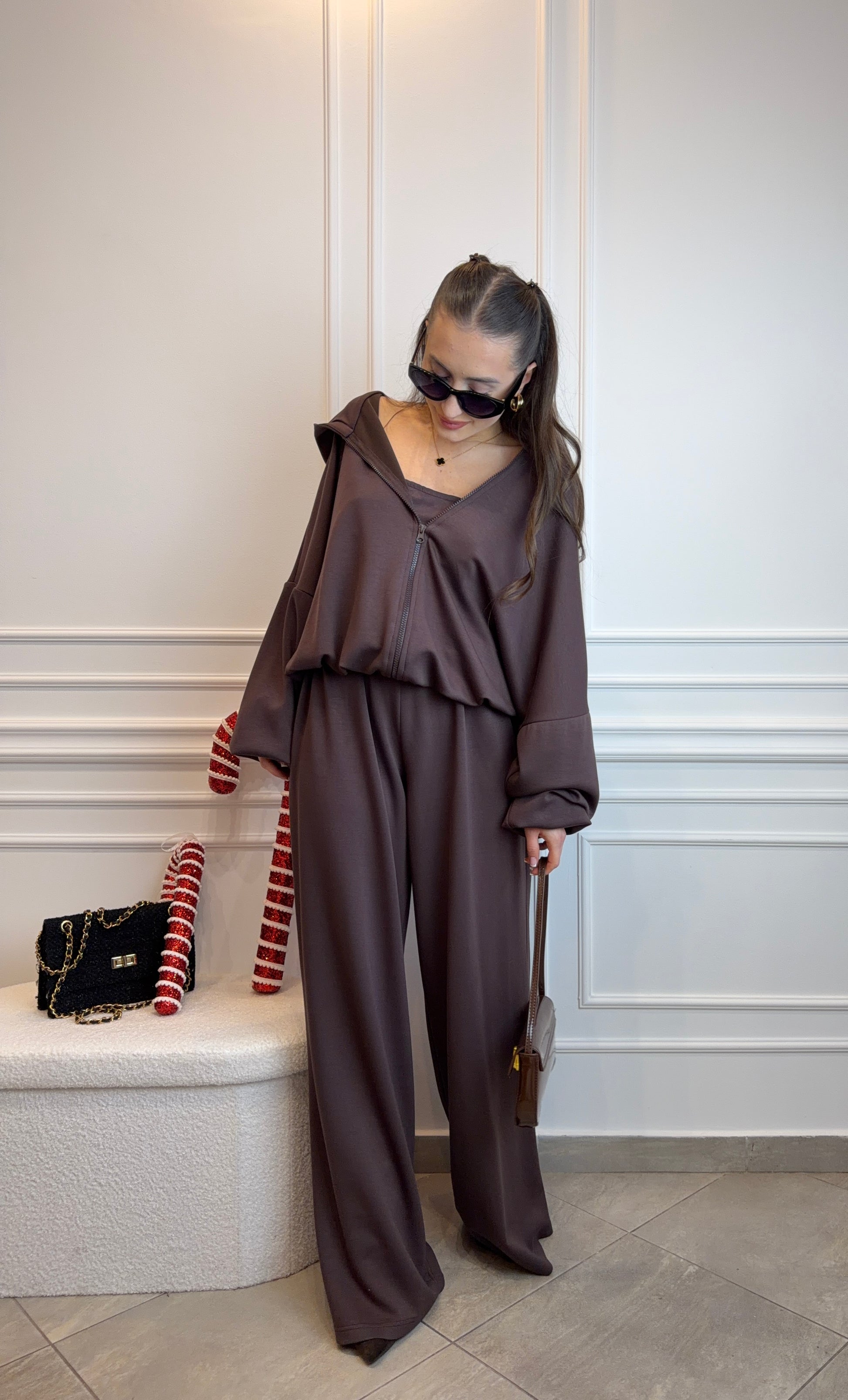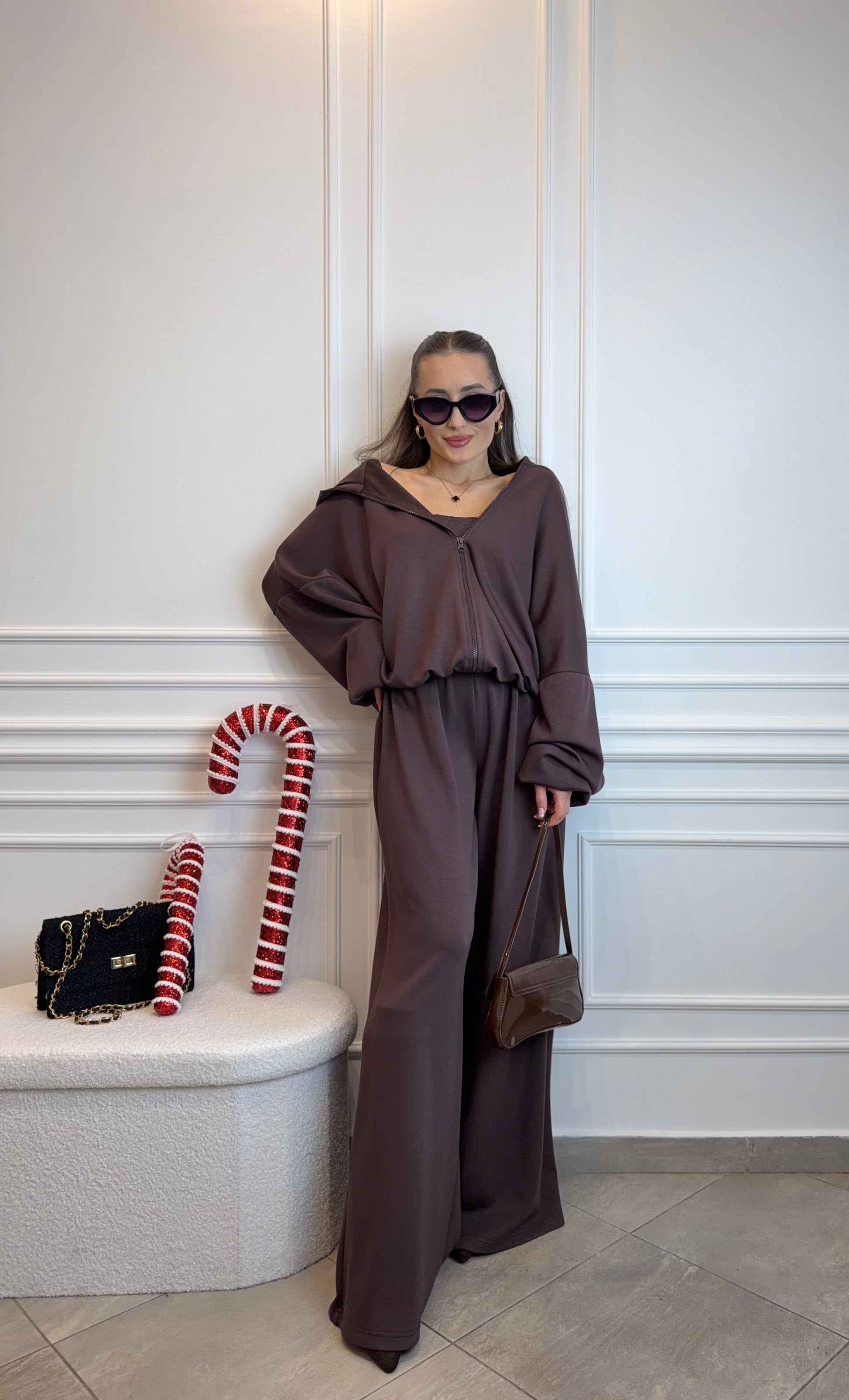 Trzyczęściowy komplet top, bluza i spodnie w kolorze czekoladowego brązu